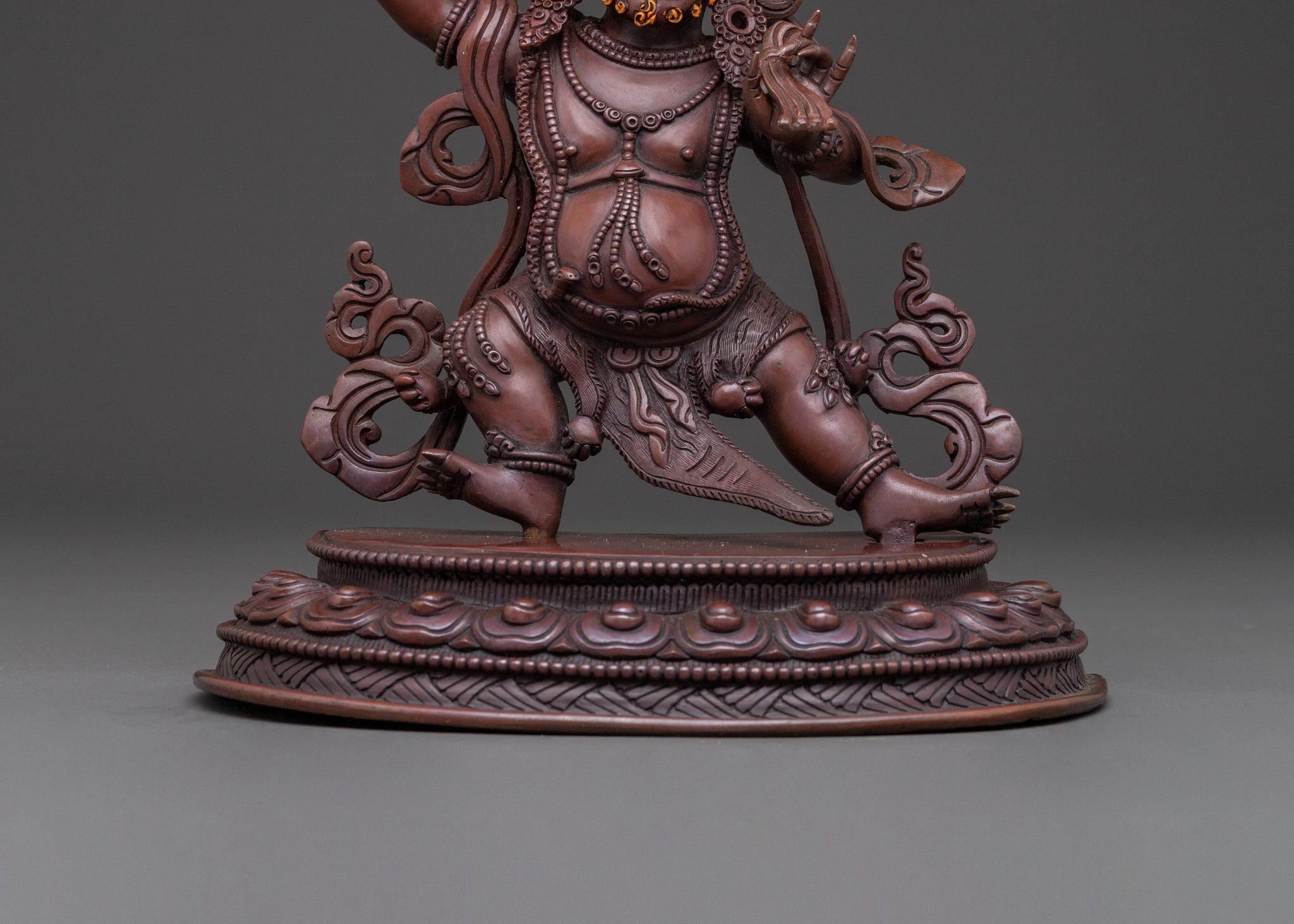 Vajrapani is depicted in a dynamic stance, wielding the vajra, symbolizing the destruction of ignorance and obstacles. His fierce expression and mudra convey unwavering protective power and the energy to overcome inner defilements, in keeping with traditional Mahayana Buddhist iconography of wrathful yet compassionate protectors.