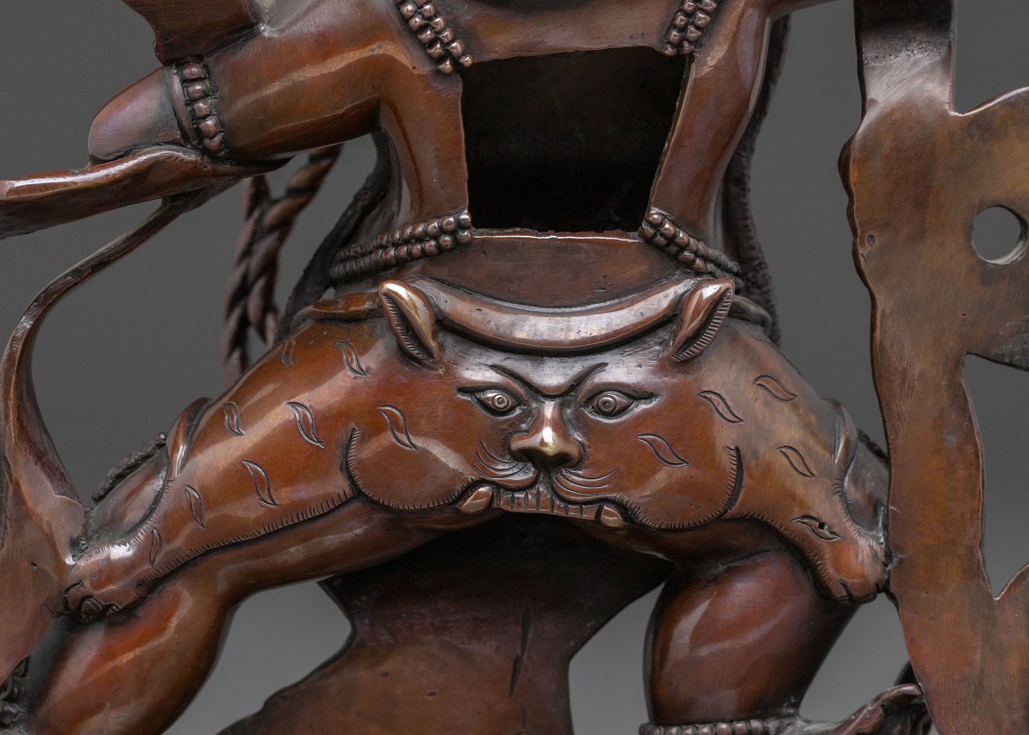 From the heart of Nepalese artistry, Vajrapani appears in a powerful oxidized copper form. Standing at 30 cm tall with a 24 cm base and weighing 3.29 kg, this substantial statue exudes an aura of potent protection and unwavering strength. The rich, dark patina of the copper highlights his dynamic posture, making it a compelling centerpiece for any sacred space. His robust presence commands attention, instilling a sense of spiritual fortitude.
