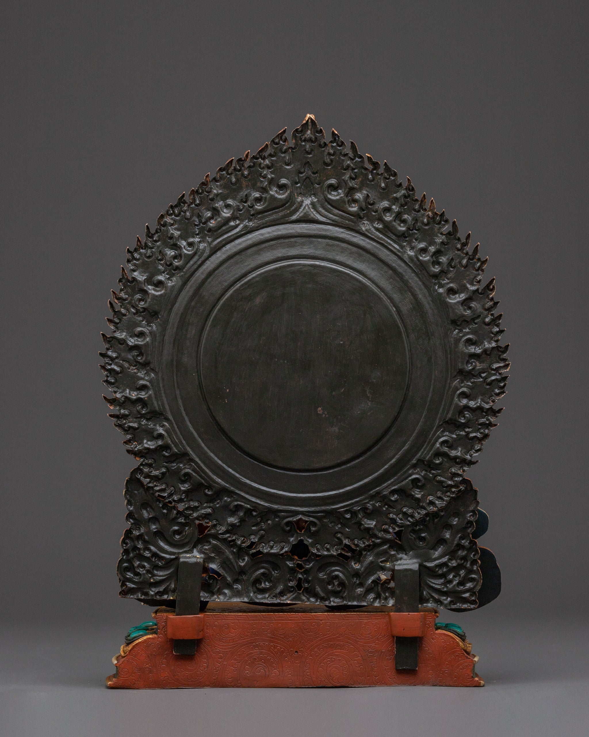 Vajrapani, depicted here with his iconic wrathful yet compassionate gaze, symbolizes the boundless power and determination required to overcome obstacles on the spiritual path. His commanding presence and mudra represent the active force that shatters ignorance and protects practitioners, fostering courage and inner strength during meditation.