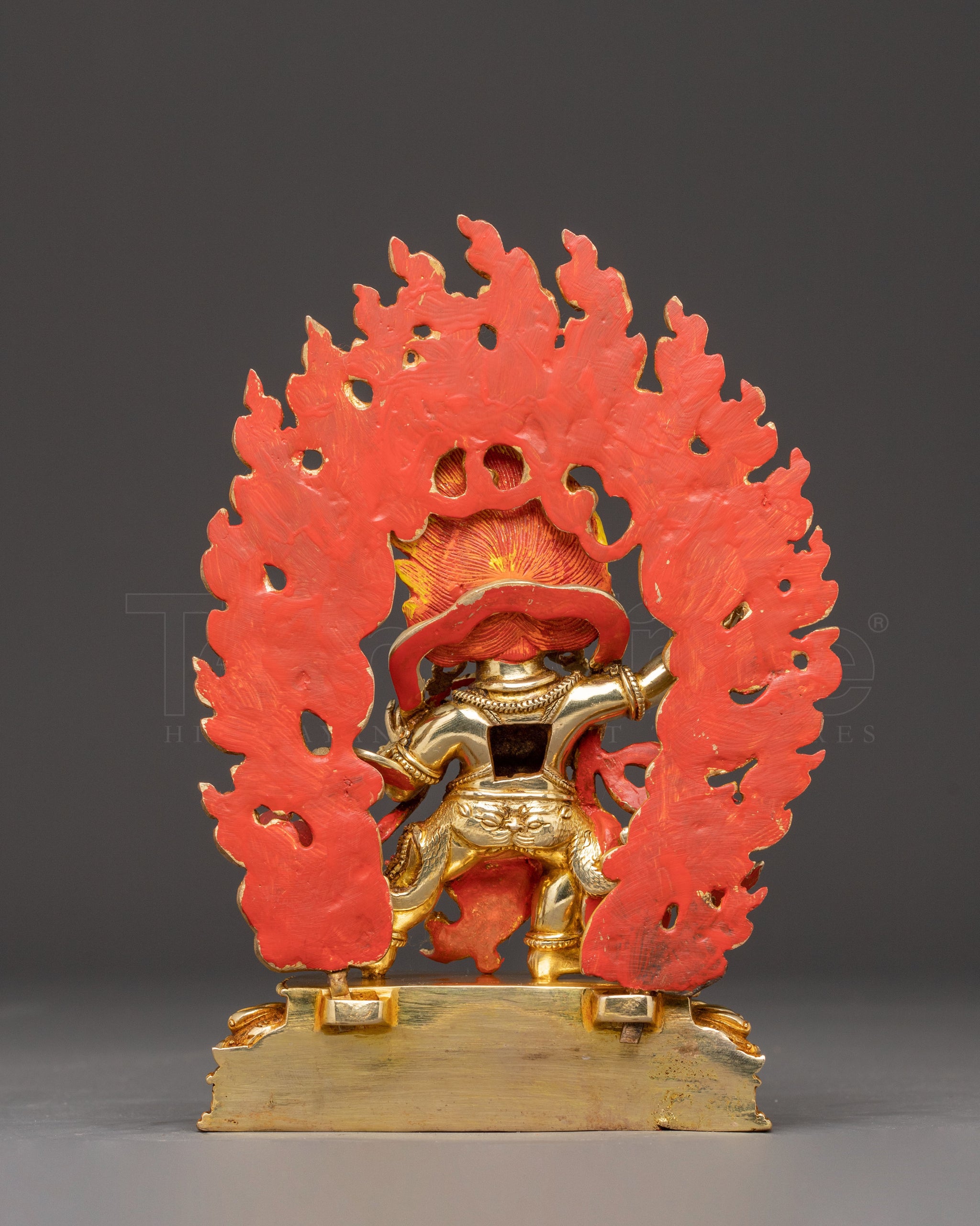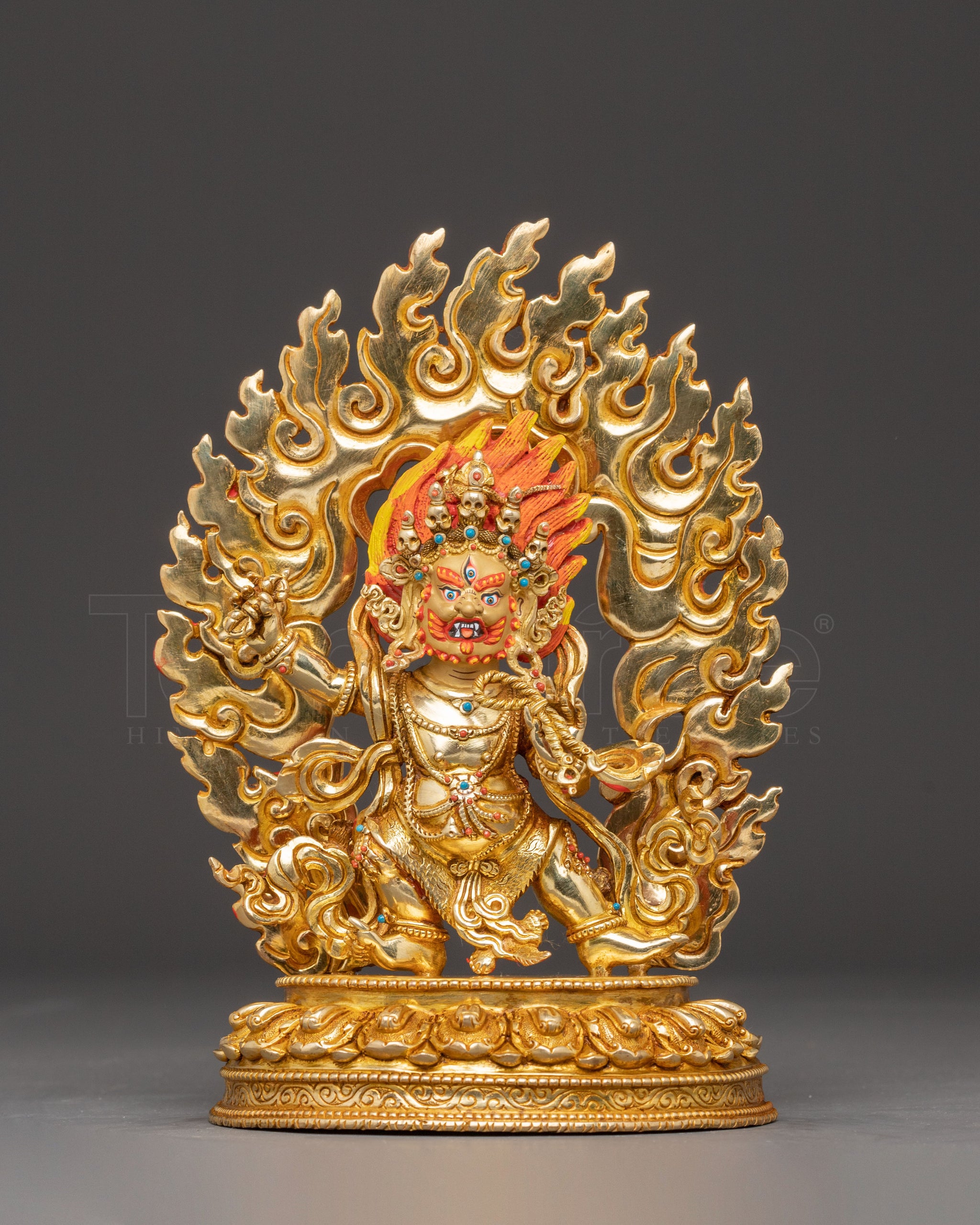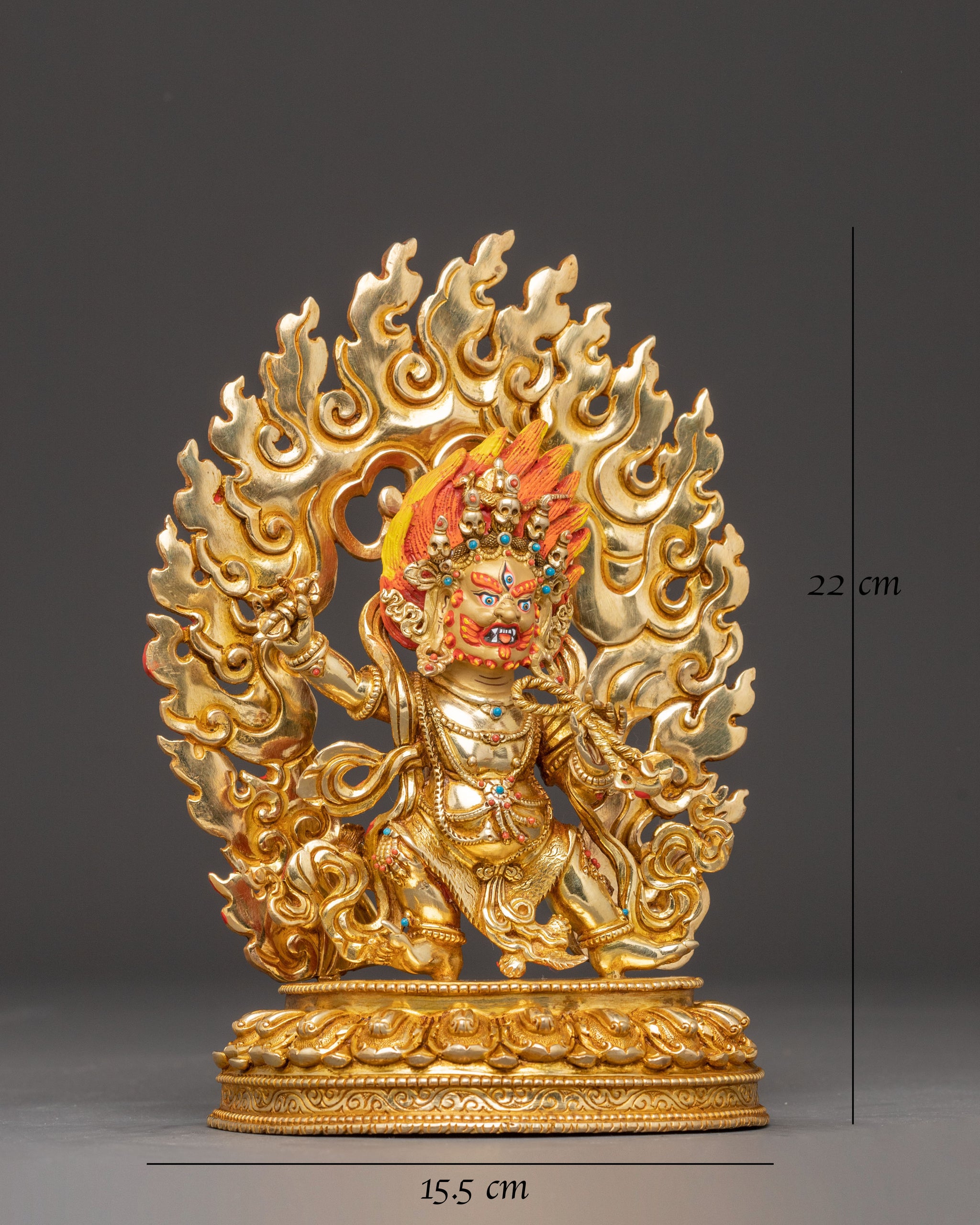 The Protector of All Buddha, Vajrapani Statue, stands at 8.7 inches (22 cm) in height with a base width of 6.1 inches (15.5 cm), weighing 1.29 kilograms. Expertly handcrafted from a copper body, it is adorned with 24K gold gilding, detailed gold and acrylic paintings. This finely detailed sculpture captures the fierce and protective nature of Vajrapani, the Bodhisattva of Power and Guardian of the Buddha's teachings.
