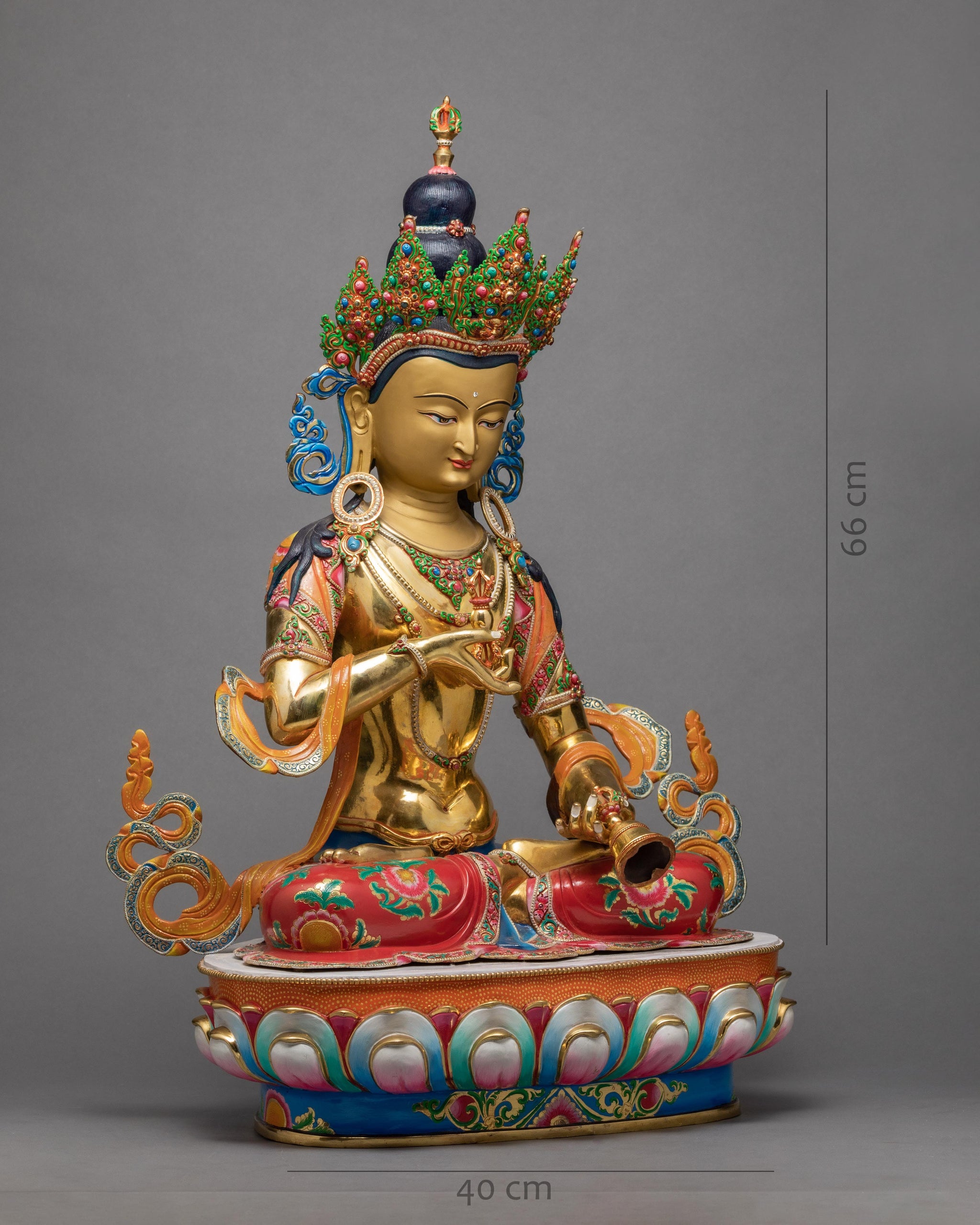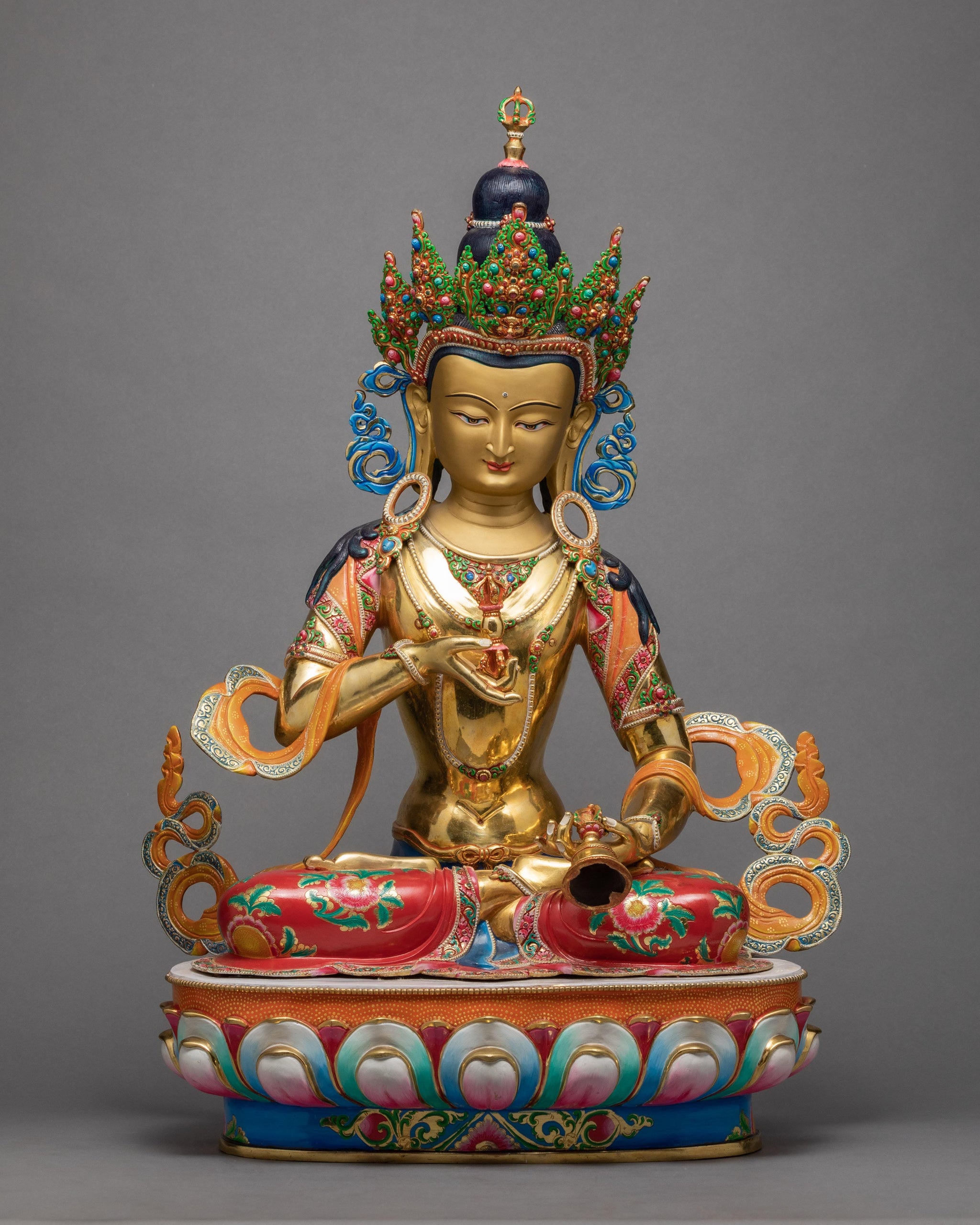 A widely practiced Vajrasattva, also known as Dorje Sempa (Tibetan) Statue is here for your preliminary practice. Uniquely hand made, he is portrayed with a colorful display of vibrant shades on a fully gold plated body.