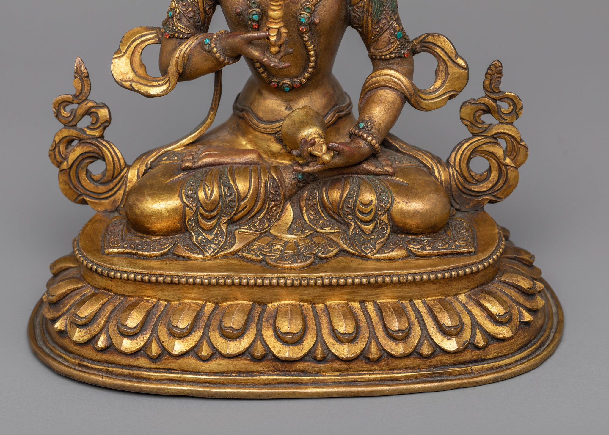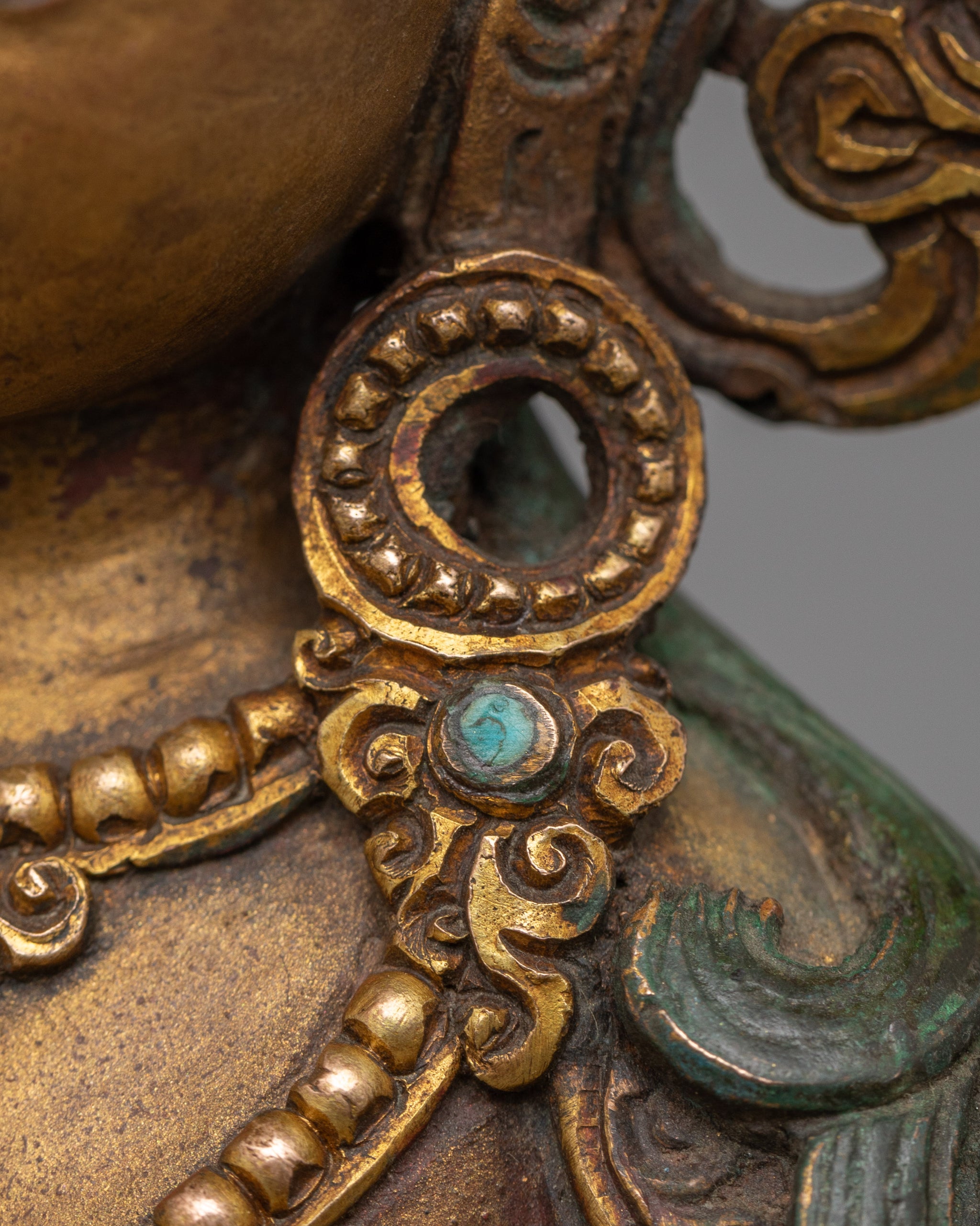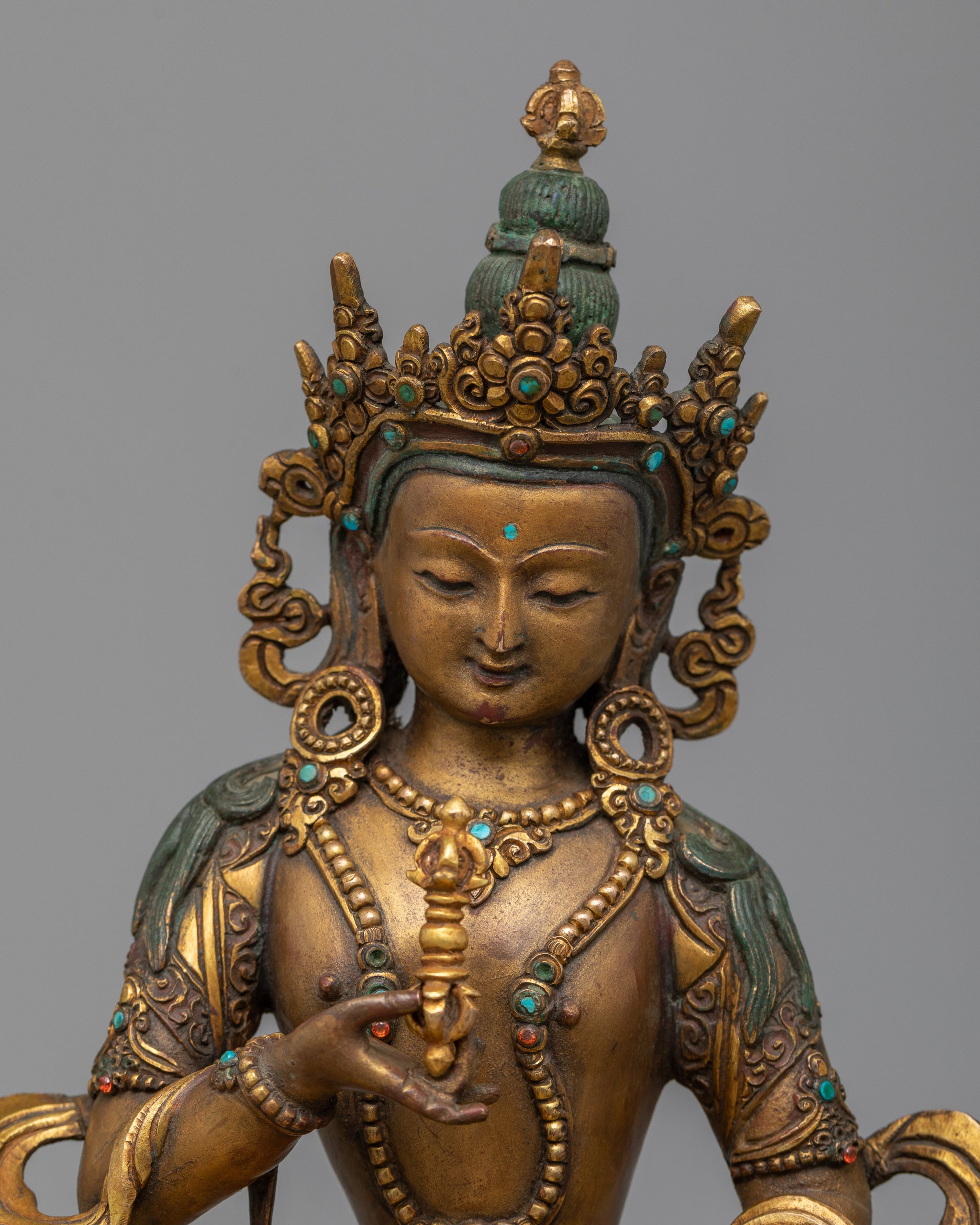 Intricately handcrafted in our workshop, the traditional Vajrasattva mantra statue is full of unique Himalayan artistry. The statue is comprised of copper and gilded in gold with an antique finish that gives it a very classic look. The Bodhisattva is depicted sitting on a moon disc lotus seat in the lotus position, displaying his characteristic calm and serene demeanor. In his right hand, he holds a vajra, a ritual item that stands for the transience and stability of reality, and on his left, he holds a ritual bell, which symbolizes emptiness and the voice of enlightenment. It is a beautiful piece made by our artists after months of hard work, and the addition of jewels to the statue only beautifies the statue more.