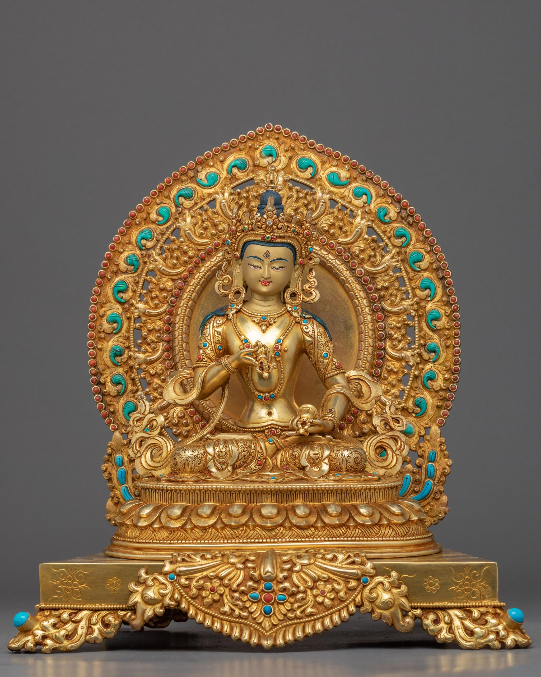 This Vajrasattva Sculpture of Nepal was traditionally carved from a pure copper body gilded with 24k genuine gold. Seated upon a moon disc lotus throne with both legs crossed over each other, with a bell in his left hand at the level of his hip and a Vajra in his right hand at his chest. The deity is draped in majestic robes and multiple body ornaments which are embedded in numerous precious jewels and stones. The halo present in the back and the lotus is illuminated by the acrylic paint which highlights the beauty and design of the carved pieces. We guarantee that the statue's materials are of the highest quality, that it will endure for many years without damage, and that it will make the ideal present for a practitioner like you.