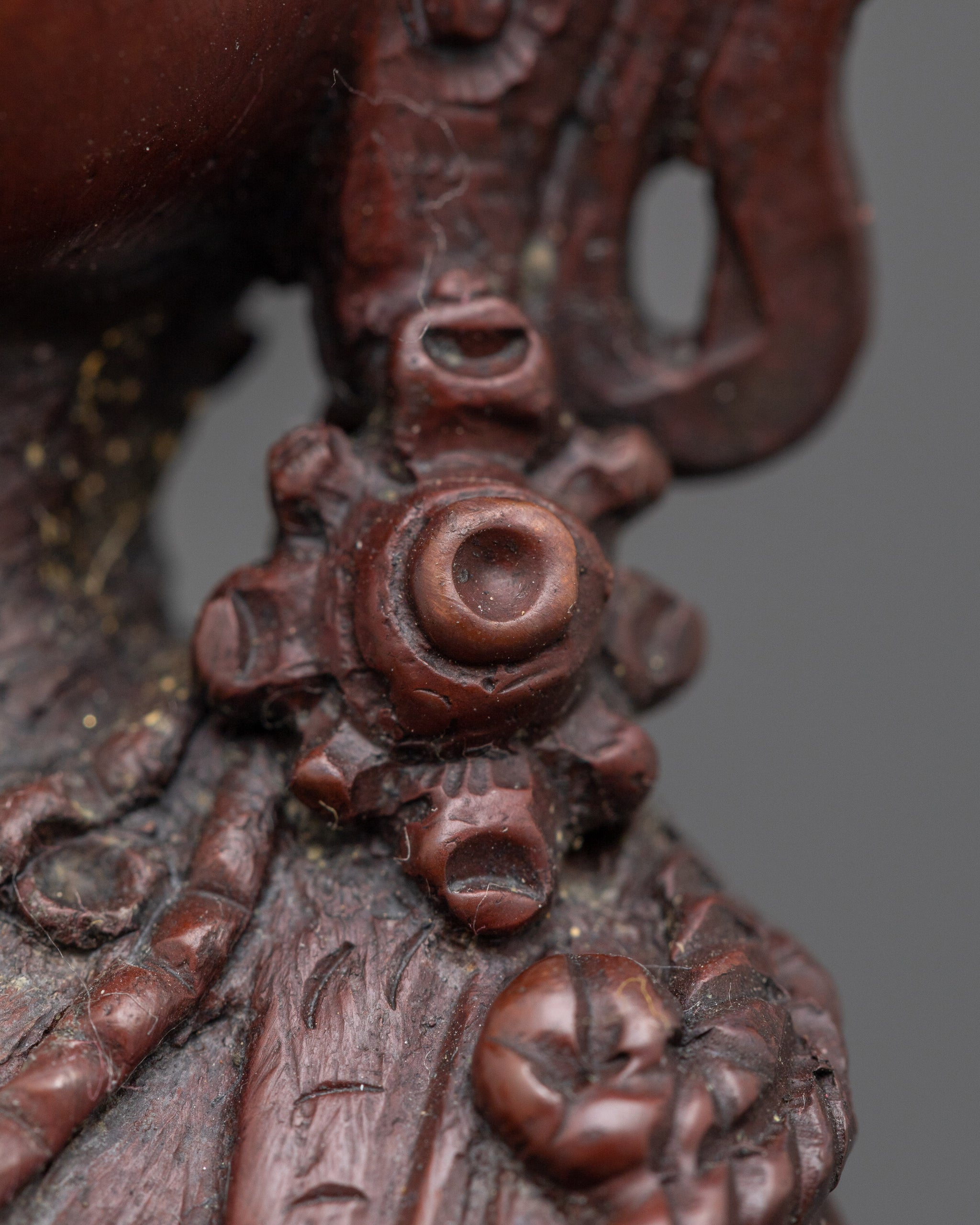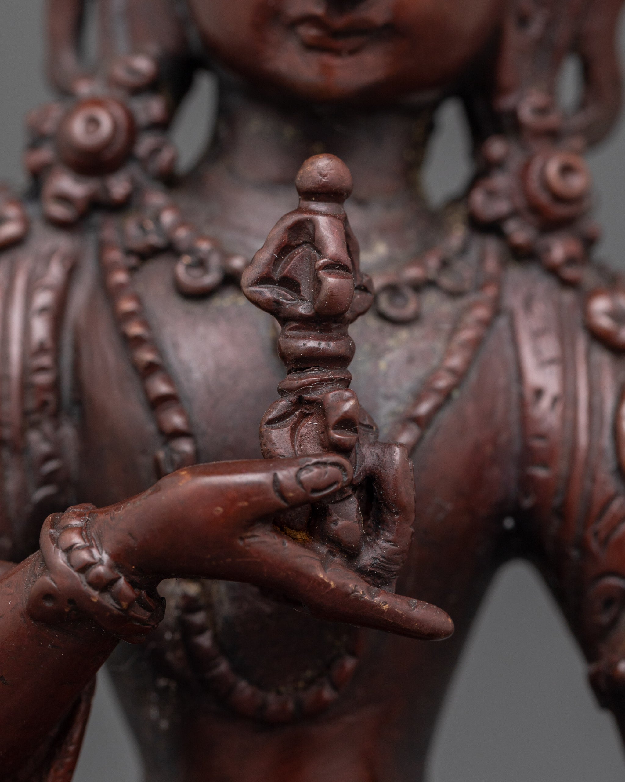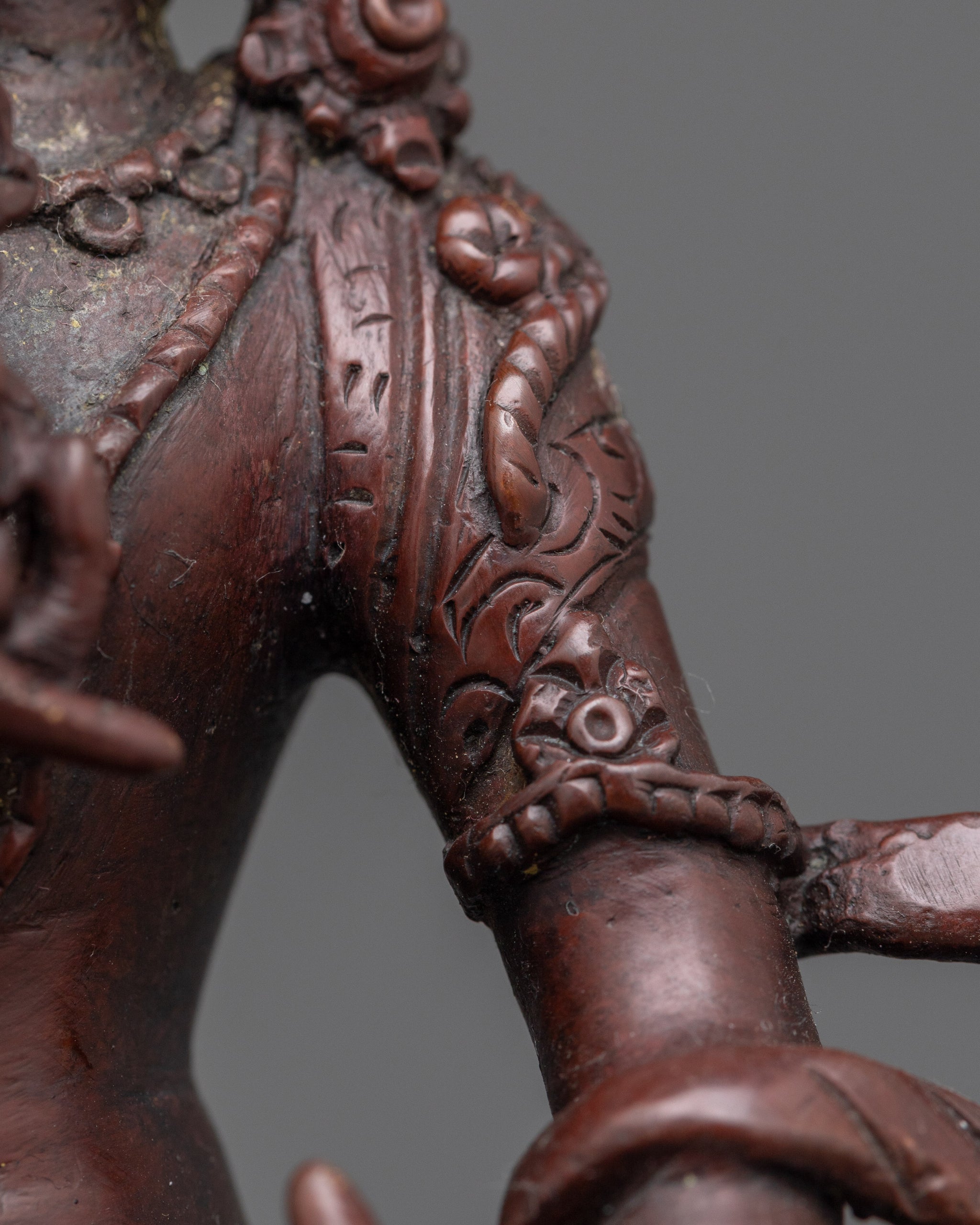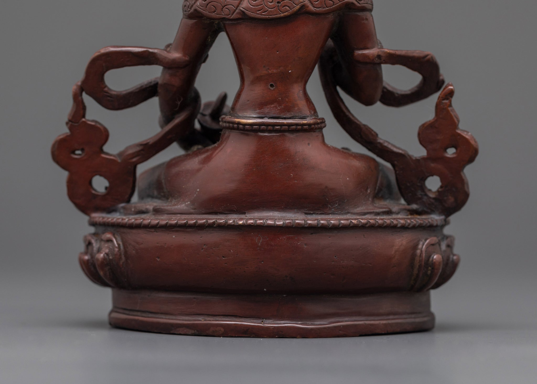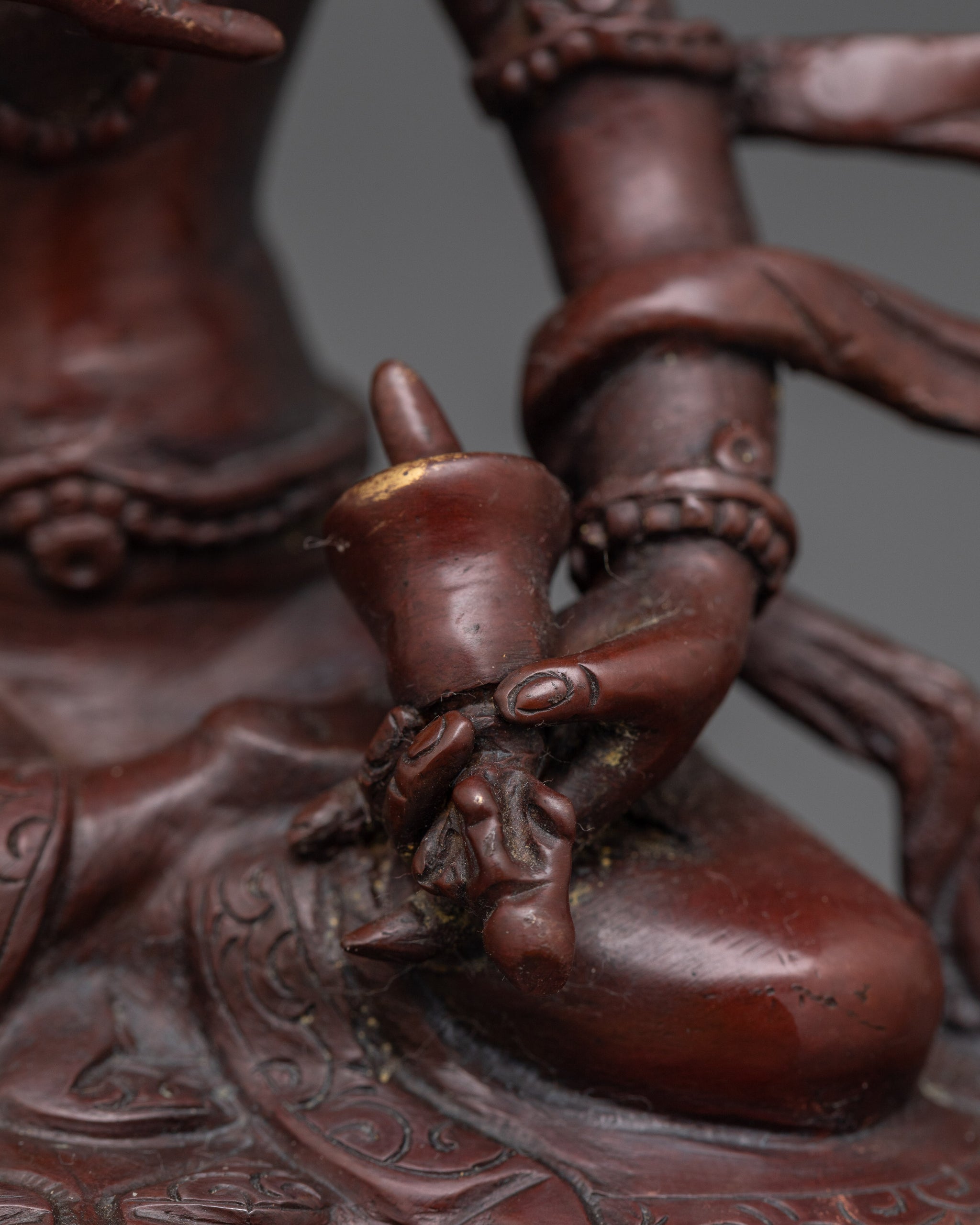 Vajrayogini is stunning. The details are amazing. It's easy to make out her facial expressions, skulls, feet, and the ring of fire around her. You can tell she's handmade. There is a consecration hole in her back.