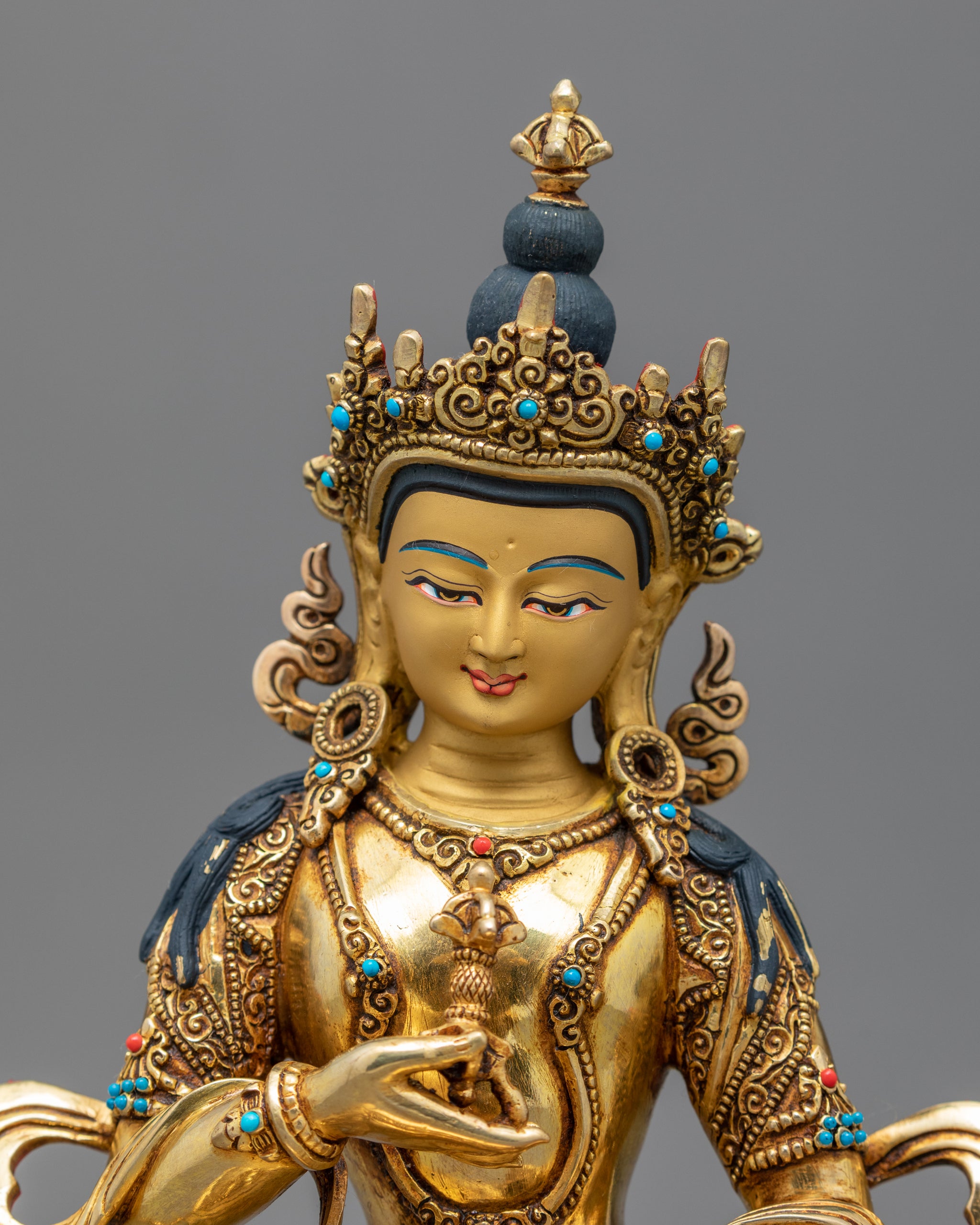 We have magnificently hand-carved the crown of the Tibetan Vajrasattva deity by adorning it with precious turquoise and coral in this Sculpture. We have used genuine 24k gold to gild in a pure copper body which is mesmerizing. The jewels and ornaments embellished with valuable pearls and gemstones are rare in Vajrayana arts. We assure you that the materials used to sculpt the statue are high quality and will last many years. Deity depicted sitting on a top of a moon disc lotus seat will be beneficial for meditation practices. This art of Himalayan will be a tremendous gift from Nepal to a practitioner like you.
