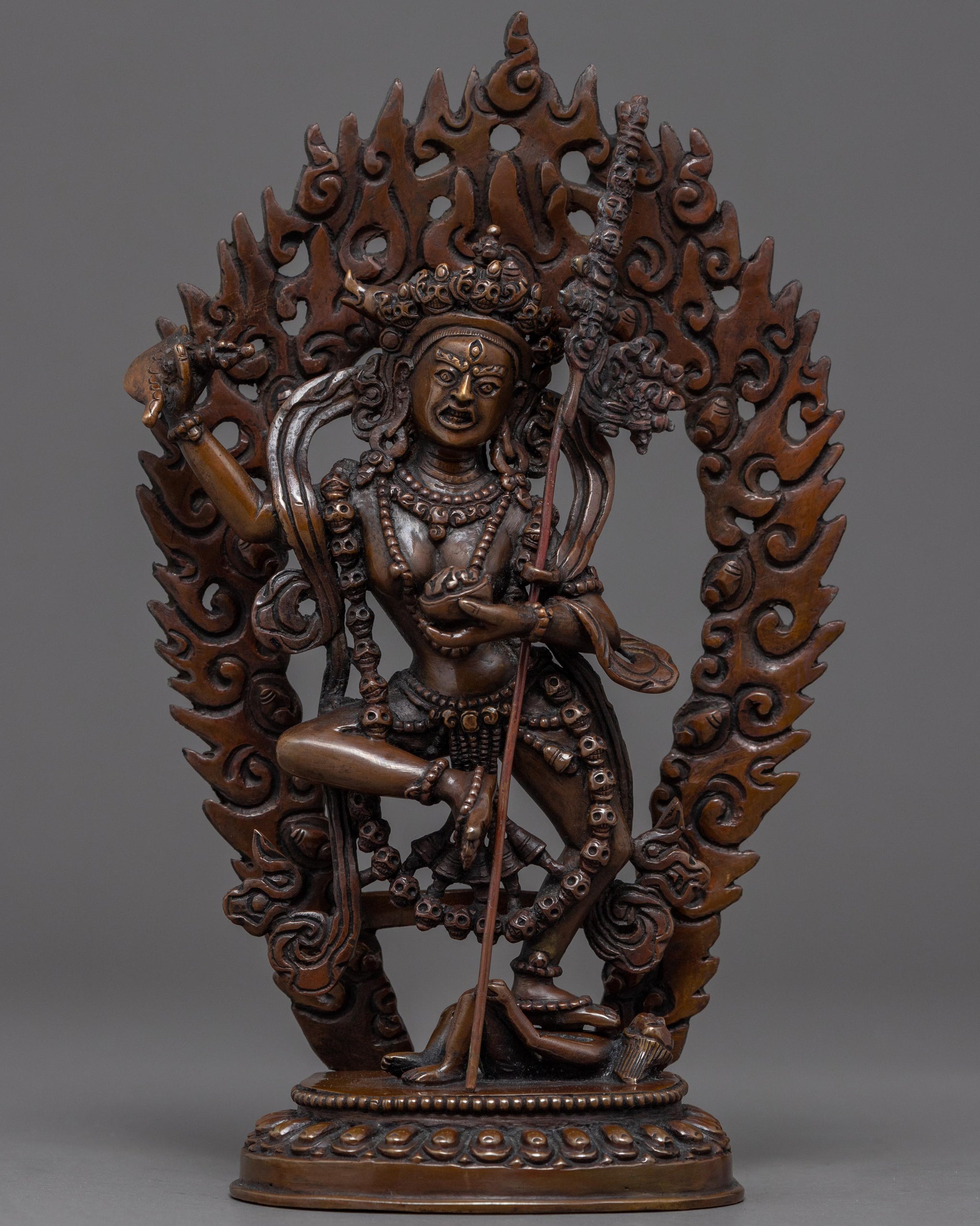 Traditionally crafted, this Vajravarahi Statue is handcrafted by the best craftsmen of Nepal from an oxidized copper body. Vajravarahi is also known as Dorje Sempa. The statue depicts the deity in a wrathful posture and dancing in front of a fiery halo. She wields a graveyard knife in her right hand, while on her left, she holds a skull cup. A khatvanga stick is in the crook of her left elbow, which rests on her shoulder as she takes support from it. Precious ornaments are decorated over the statues, including a garland of human heads that are flawlessly carved. This magnificent statue of the Vajravarahi will be a wonderful present to a practitioner like you.