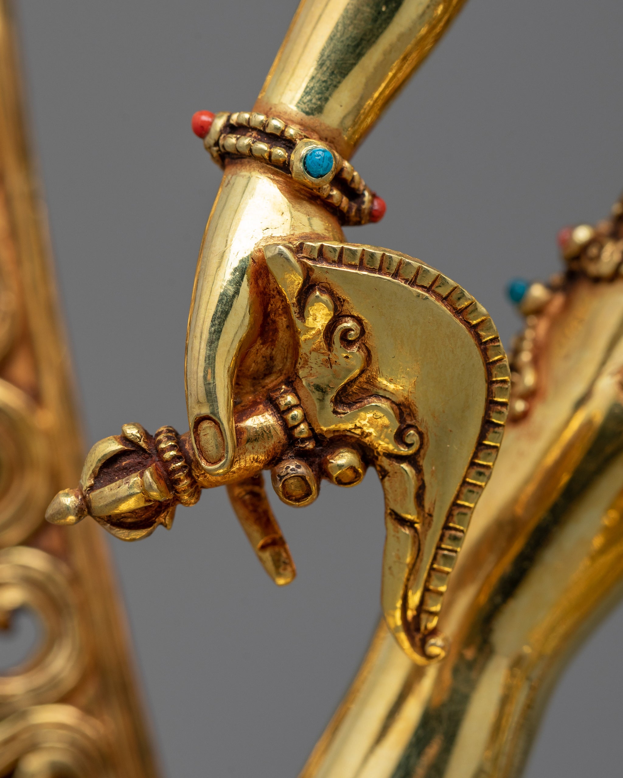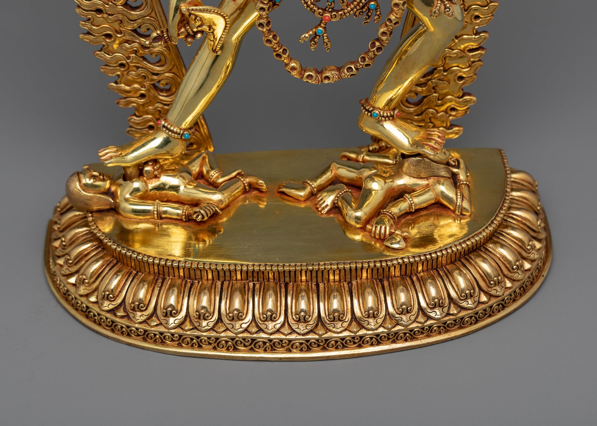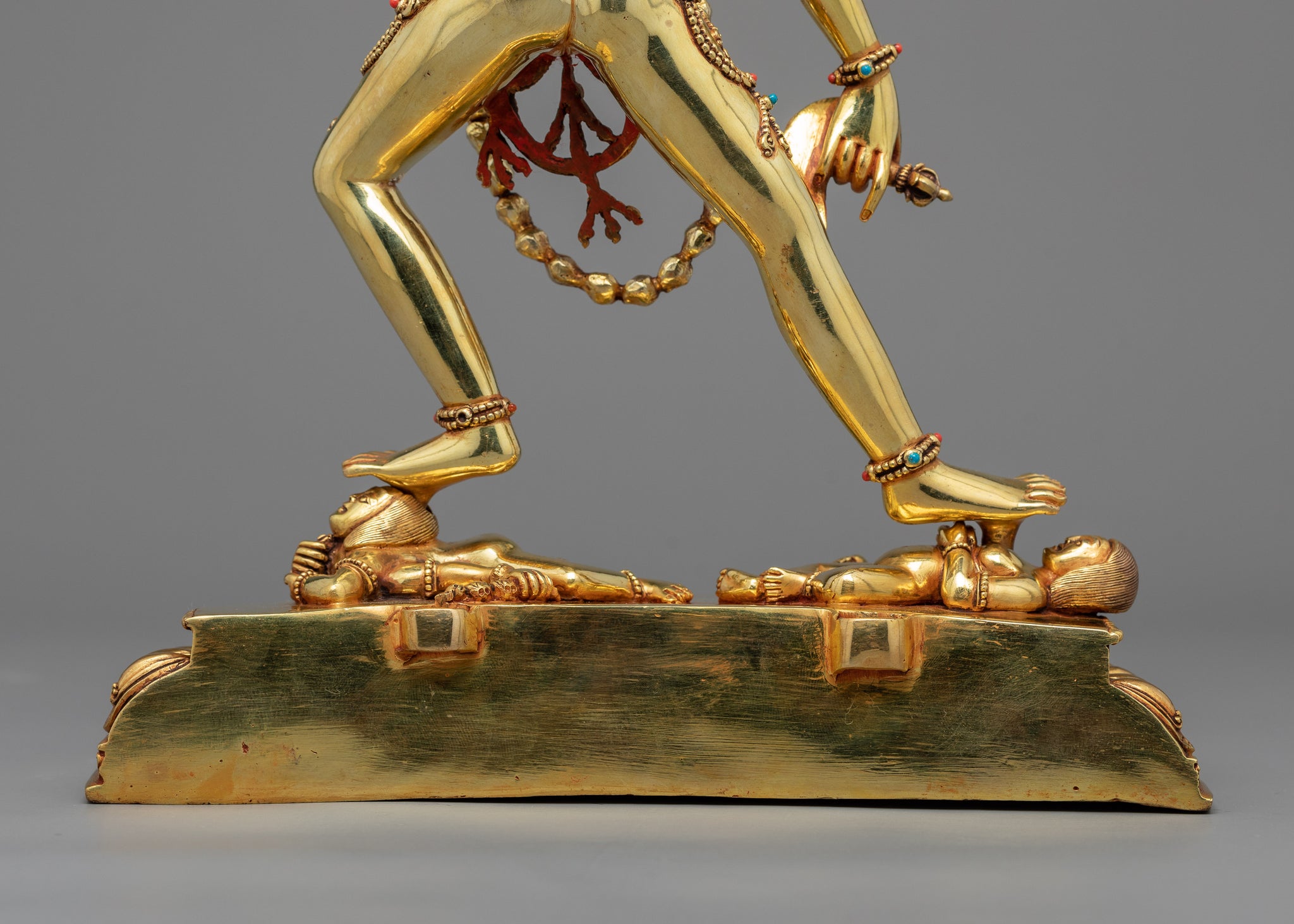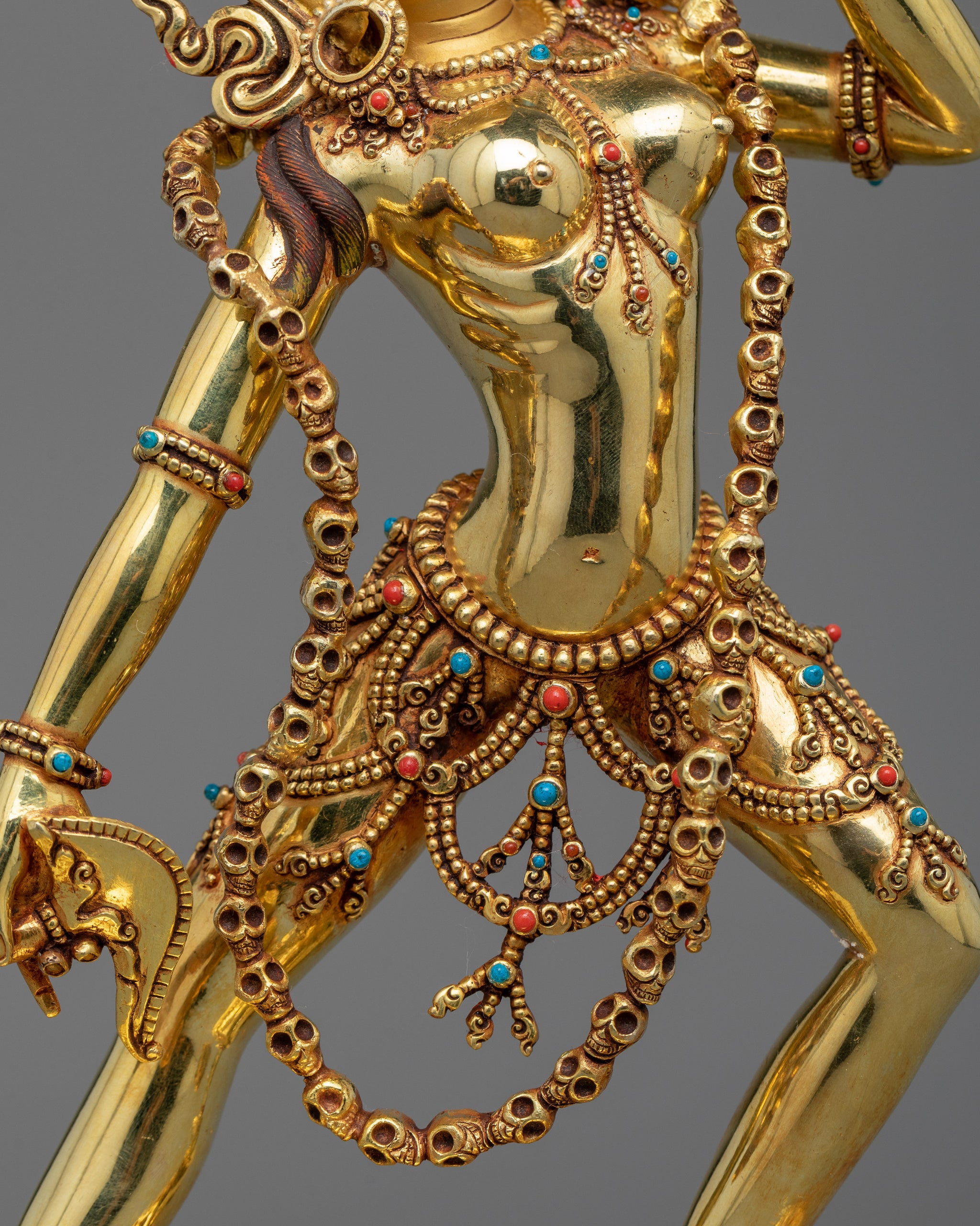 With the help of this wonderful Vajrayogini Art, you may bring Vajrayogini's strong energy into your house or other holy places. This Vajrayogini statue, which is made of three times 24K gold-gilded copper and is decorated with intricate acrylic paintings, captures the essence of the tantric goddess and serves as a reminder of the transformational potential of spiritual practice. Very deeply and carefully carved to give very detailed intricate patterns. As you advance on your journey to enlightenment, place it on your altar or meditation area to channel the divine feminine energy and kindle your inner wisdom.