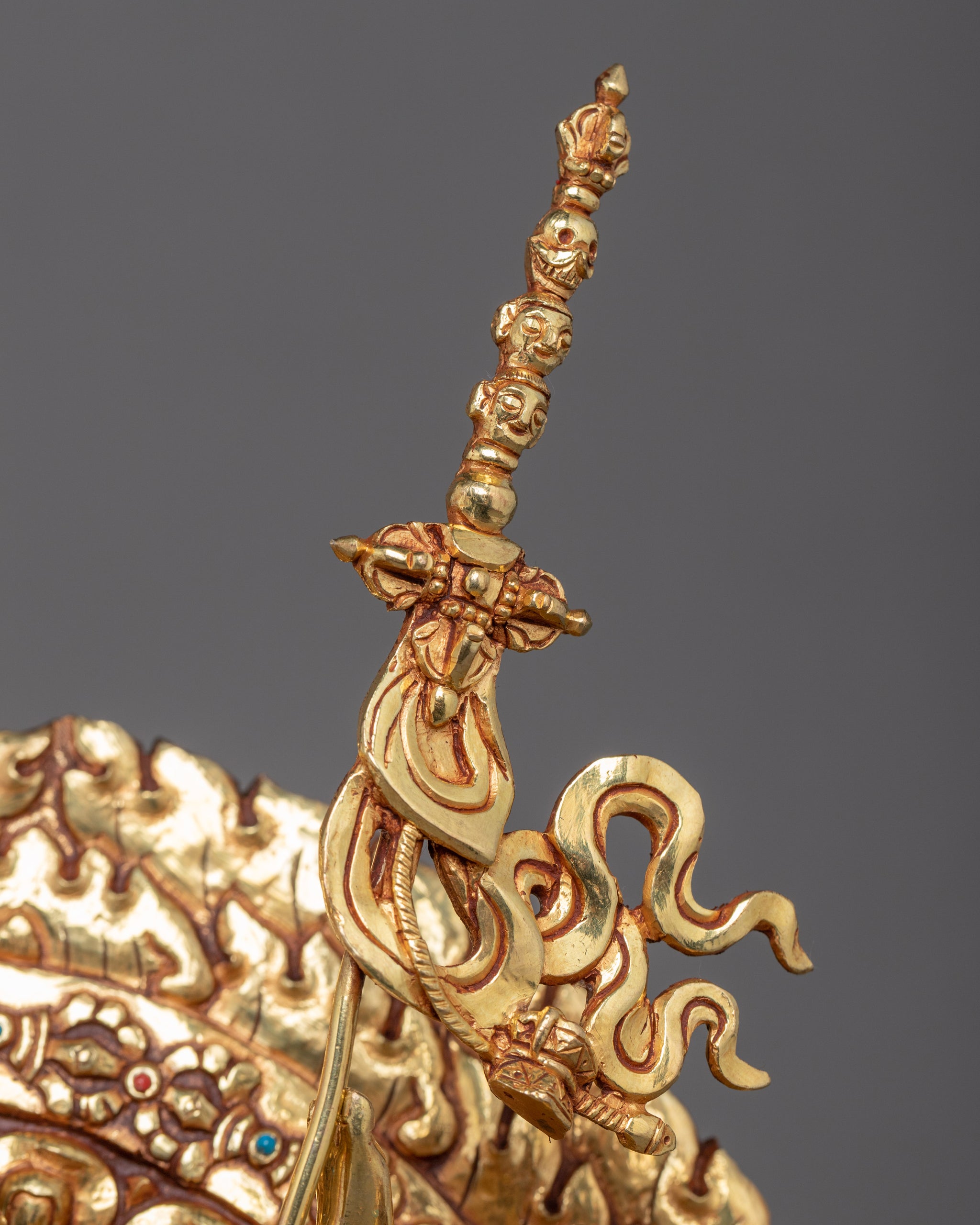 In Buddhism, Vajrayogini is also known as the tantric female Buddha and Dakini. In our studio, we hand-carved Vajrayogini Dakini Sculpture using the traditional Himalayan method. We sculpted the statue in copper body and gilded it with genuine 24k gold with great care. Vajrayogini's glowing red body is encircled by the flames of wisdom and ablaze with the heat of the yogic fire. Her soaring, leaping, and dancing poses declare that she is fully alive and joyfully free. The currents of her swirling energy field cause her flowing hair and swaying bone ornaments to ripple.