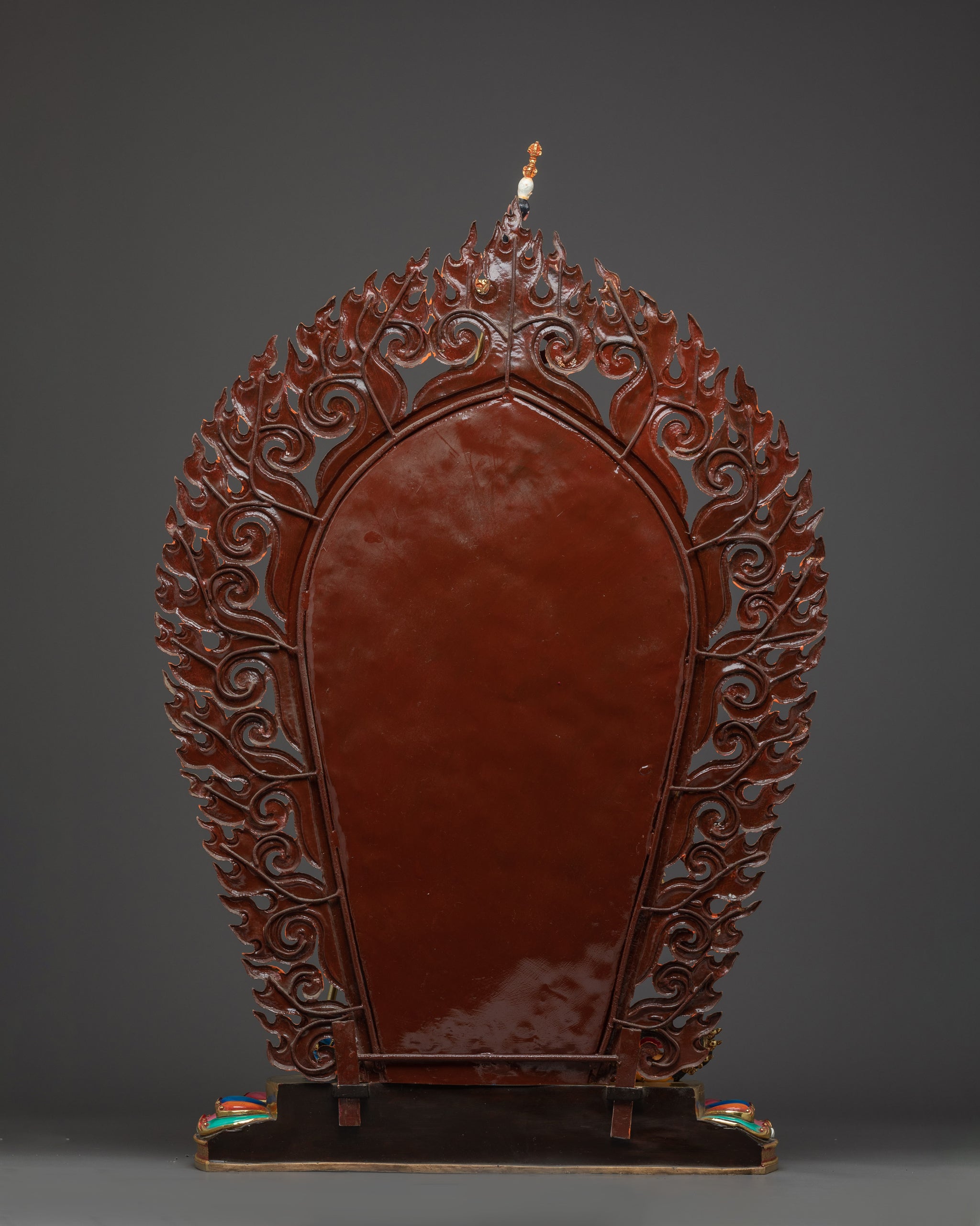 Vajrayogini, Embodiment of Fire and Compassion stands 80 cm tall with a 53 cm wide base and weighs 14.47 kg. Made from a sturdy copper body, it is elegantly adorned with 24K gold, along with detailed gold and acrylic paintings. The statue’s impressive scale and refined craftsmanship make it a captivating centerpiece for sacred spaces, meditation rooms, or distinguished art collections.