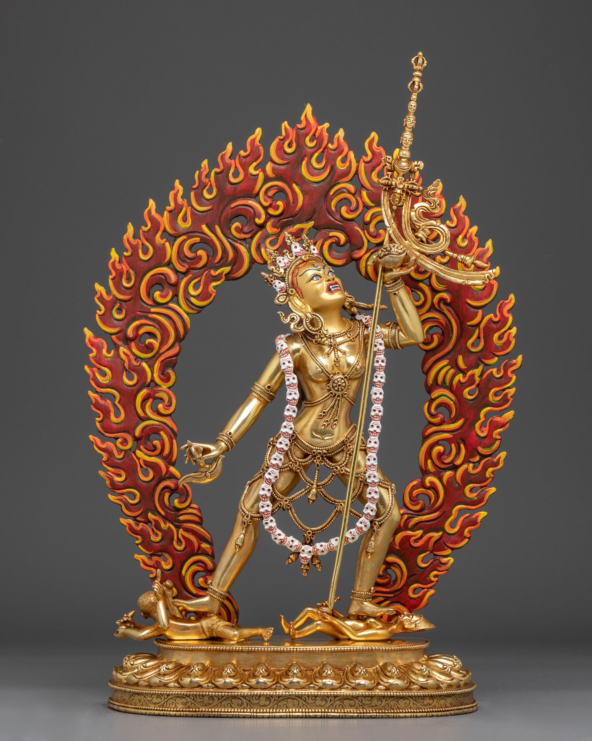 She is depicted drinking blood from a skull cup held in her right hand and holding Kartika—the flaying knife—in her left. A garland of fifty skulls hangs from her neck, symbolizing the transcendence of ego, while a five-skull crown represents mastery over the five poisons. She stands upon two beings, signifying the subjugation of ignorance and delusion, atop a sun disc and lotus base radiating with a fiery halo. Resting across her shoulders is the khatvanga trident, symbol of her tantric consort.