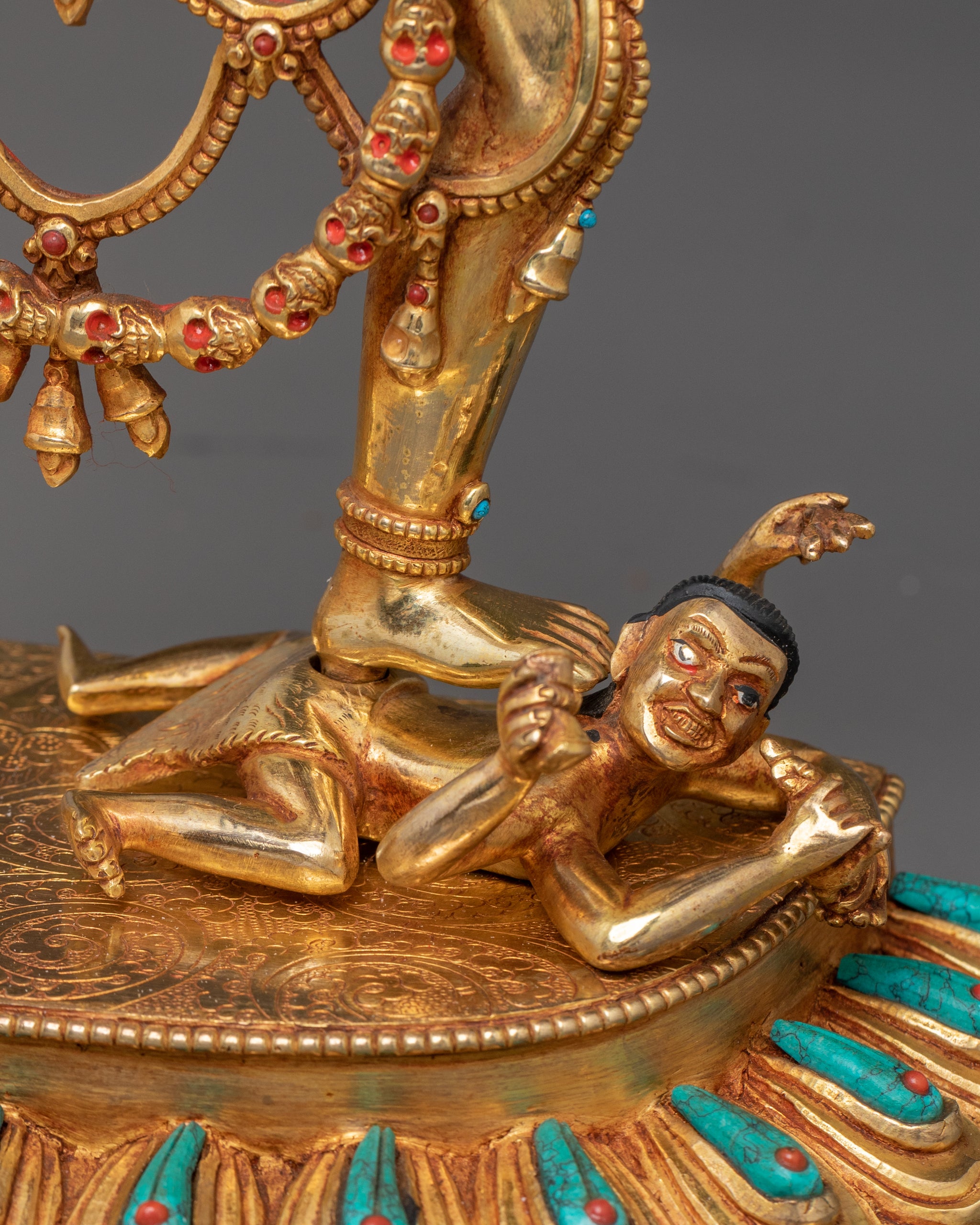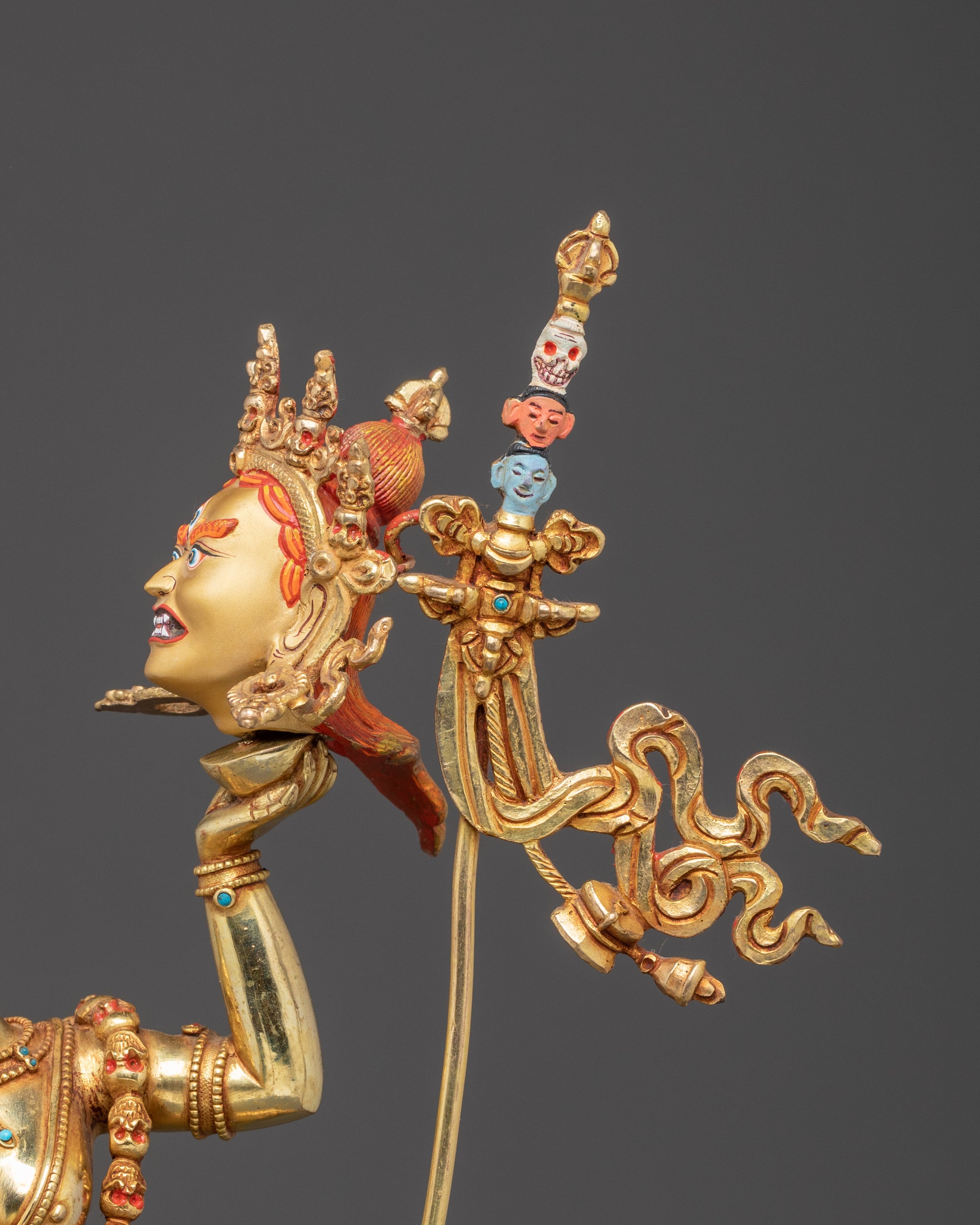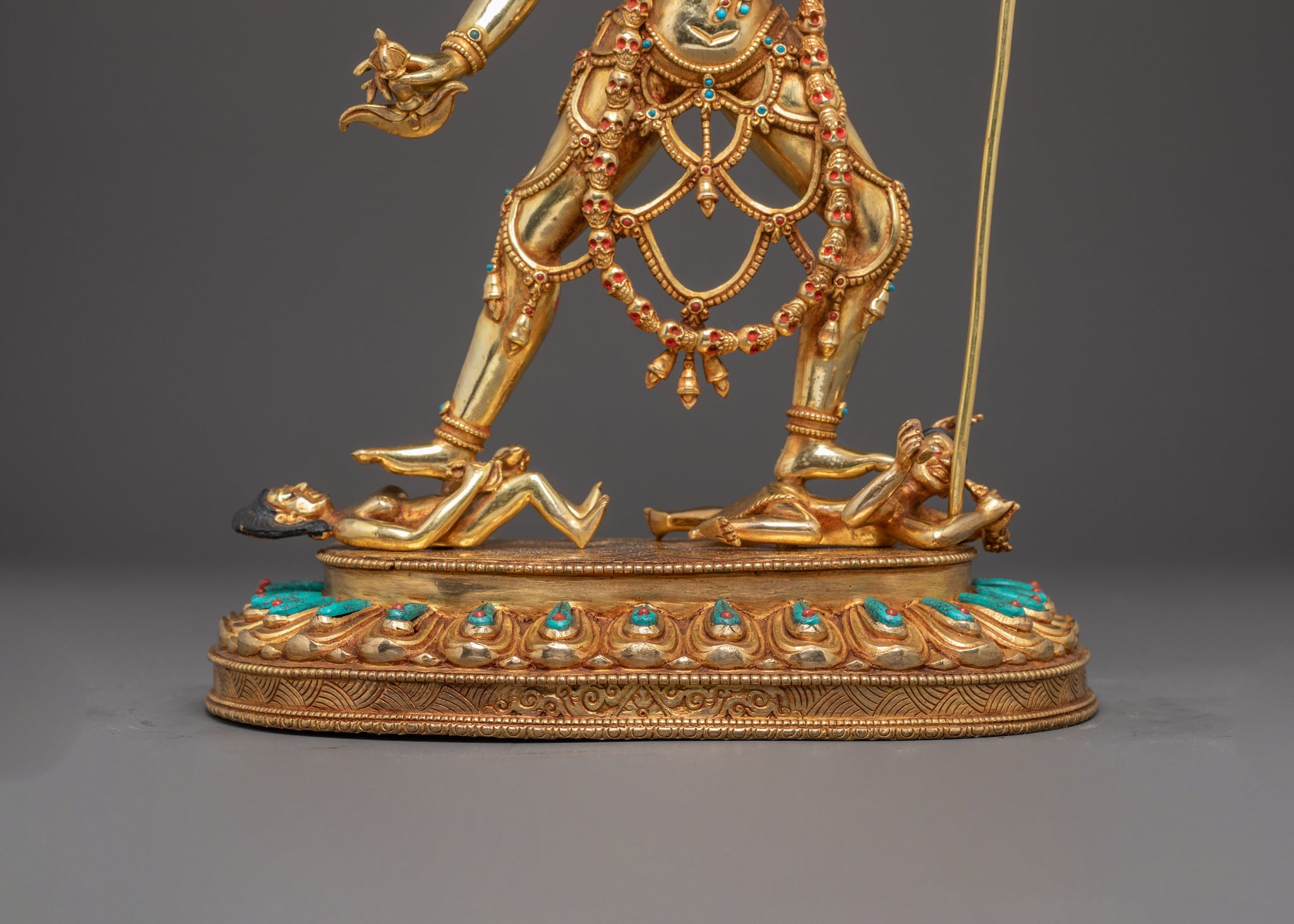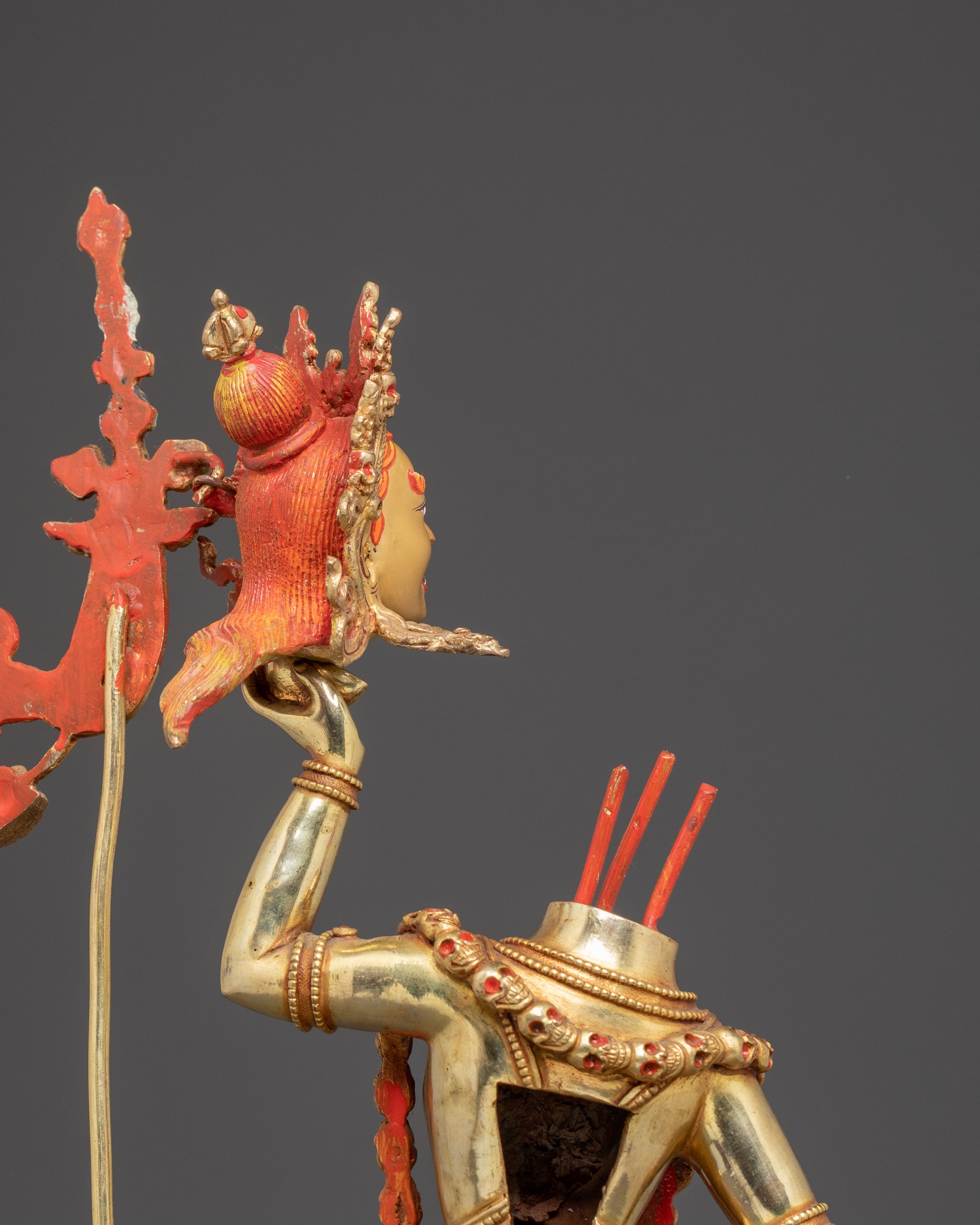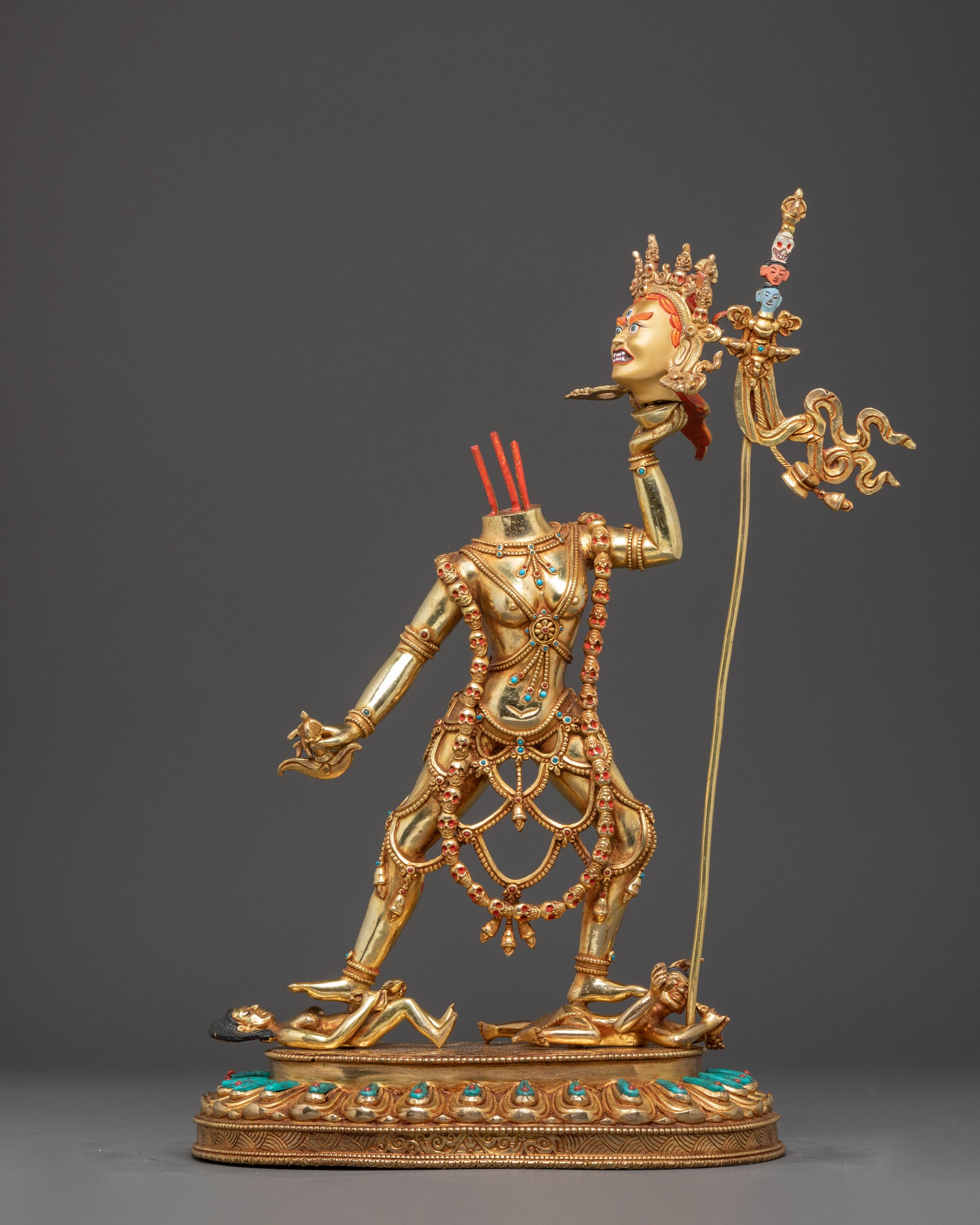 The Headless Vajrayogini, inspired by the fierce form of Chinnamasta, stands in a dynamic posture upon the figures of Rati and Kama, symbolizing the triumph over desire and ego. Her right hand holds a kartika knife, while her left carries a skull cup that supports her own severed head, signifying the transcendence of the self. From her open neck flow three streams of blood—one entering her own mouth, representing the continuous cycle of life, death, and enlightenment. She is adorned with a garland of skulls and wears a fierce expression with three eyes, embodying wisdom and awareness that pierce through illusion. The goddess stands gracefully upon a sun-disc lotus base, encircled by a halo of radiant flames, symbolizing purity and spiritual transformation. This form of Vajrayogini reflects the ultimate realization of emptiness and the self-offering of the ego to attain supreme wisdom.