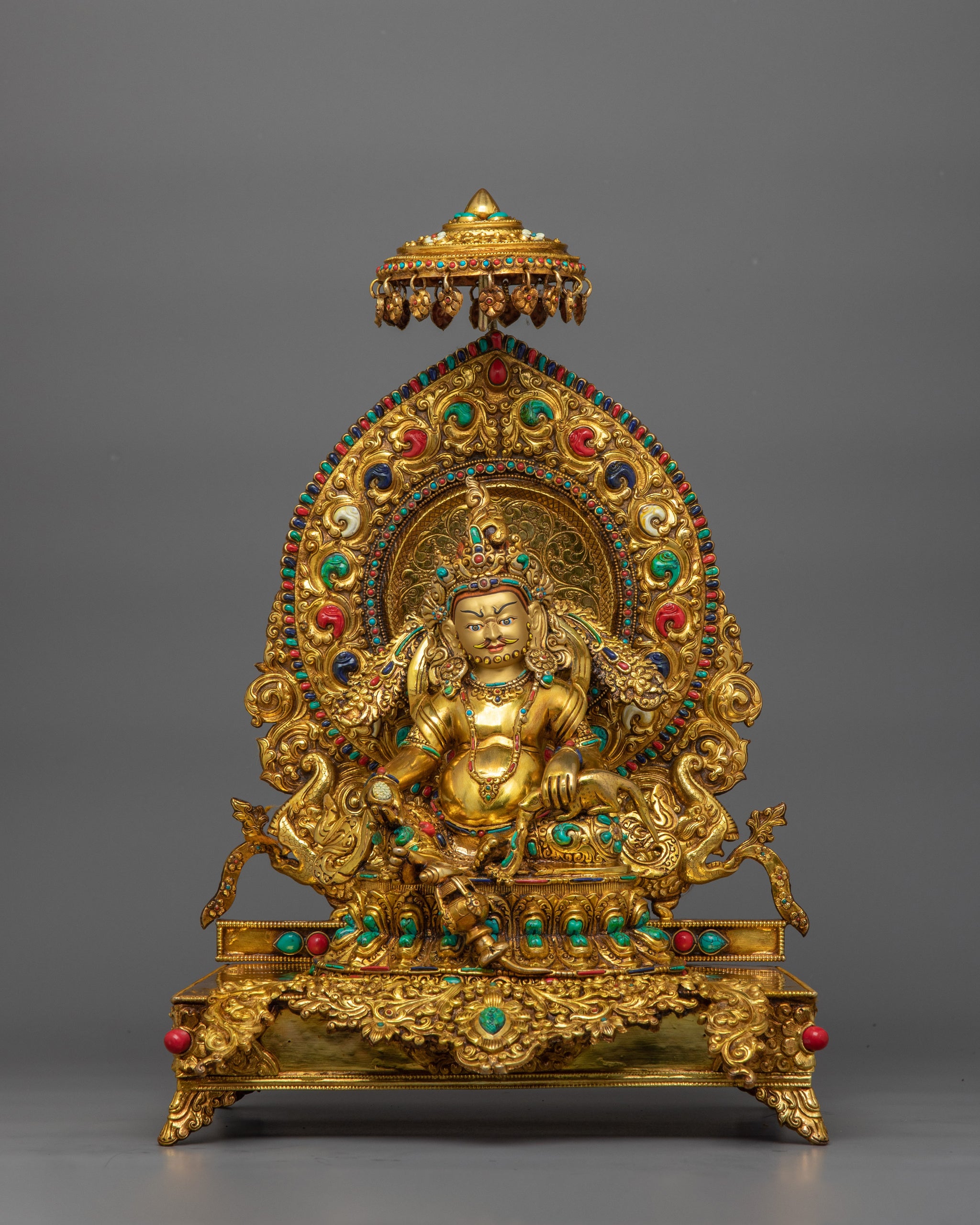 The halo throne of Dzambhala is a remarkable feature of this statue, radiating divine authority and spiritual protection. The halo is intricately engraved with sacred symbols and adorned with hand-carved gemstones, representing divine energy and infinite abundance. Dzambhala is shown sitting, holding a mongoose in his left hand to represent the removal of material and spiritual impediments, while his right hand holds a precious "mani" citron fruit. Dzambhala's strong yet sympathetic visage reminds practitioners of his protective nature and capacity to alleviate poverty by providing spiritual and practical gifts.