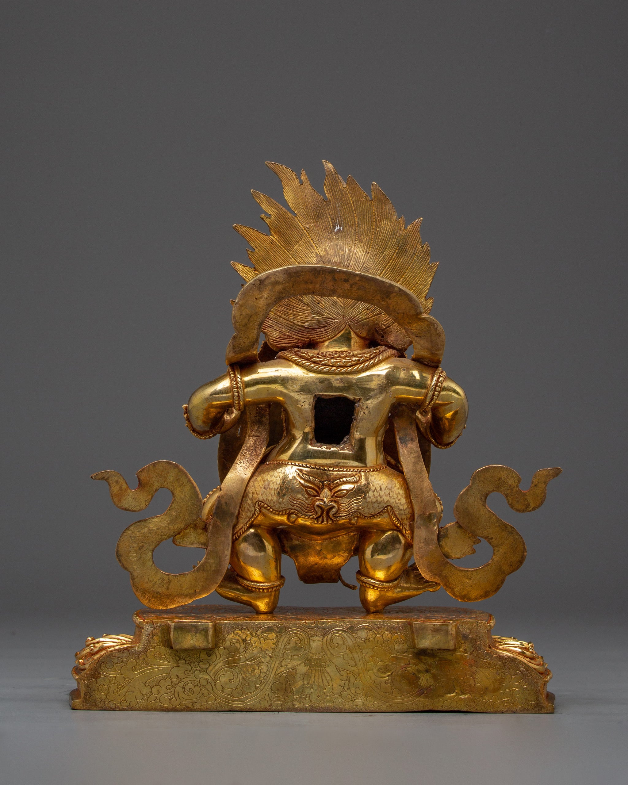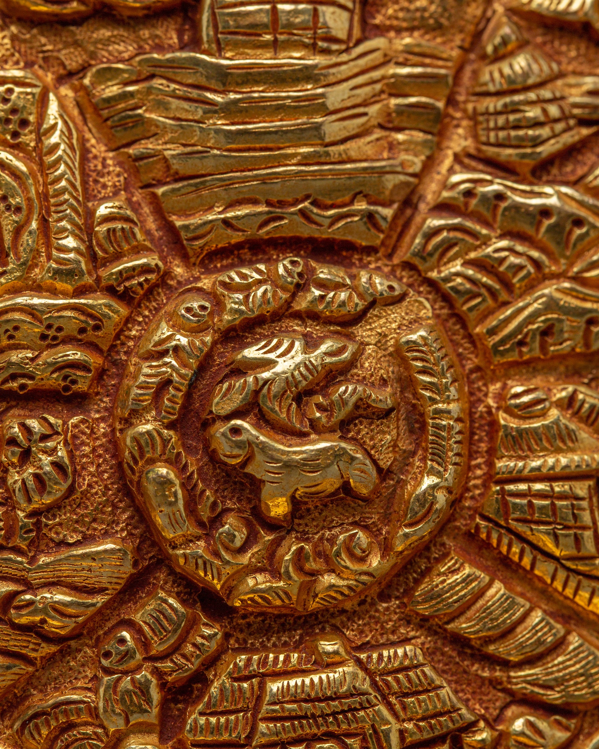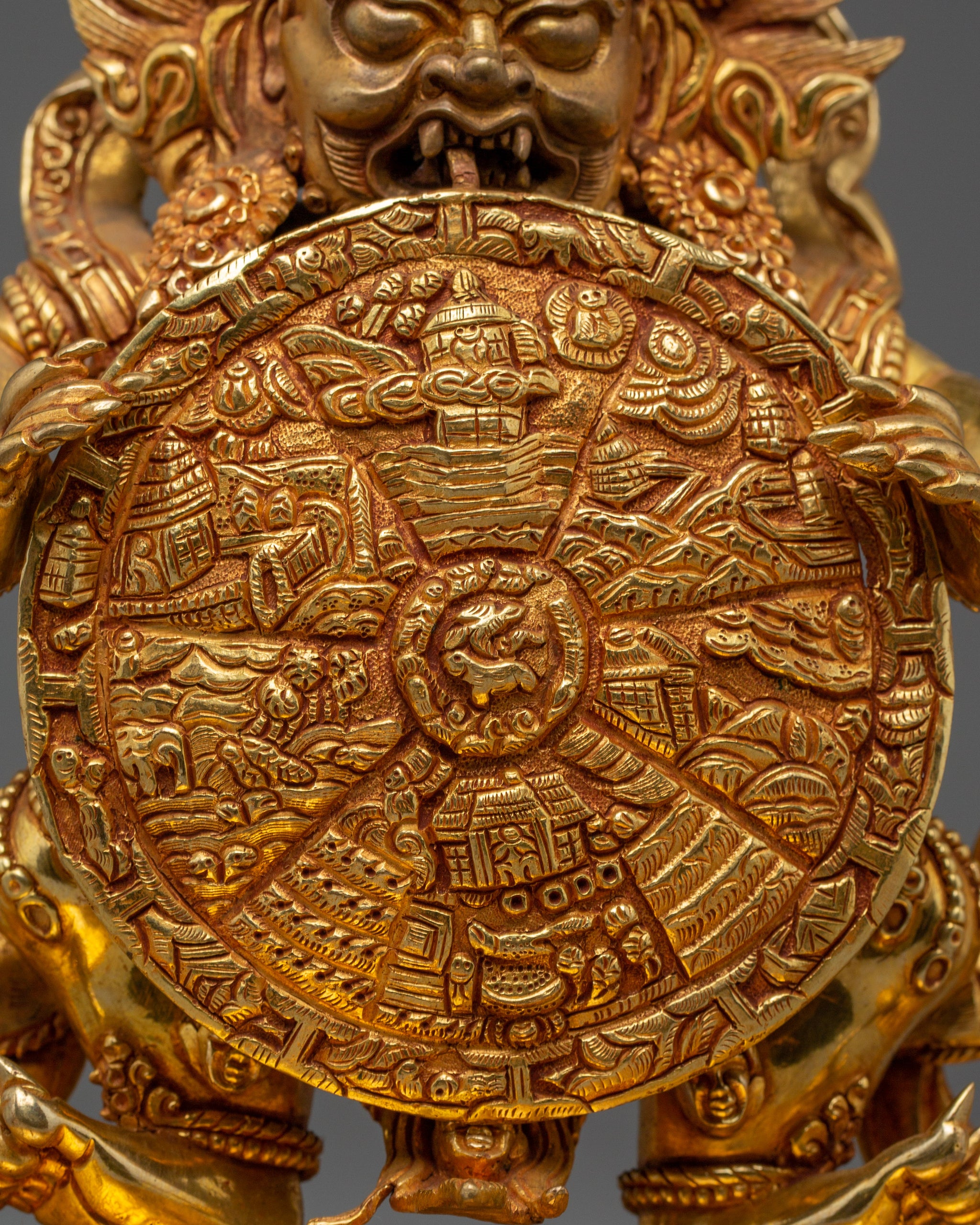 This stunning 13.8-inch Wheel of Life Buddhist Statue is a special and profoundly representation of the Buddhist cosmology's cycle of existence. It is both a reminder and an instructional piece for appreciating karma, reincarnation, and freedom. It depicts the furious deity Yama, Lord of Death, holding the Wheel of Samsara. This statue is a genuine collector's item and spiritual relic, expertly created in Nepal with a copper, covered with a triple layer of 24K gold gilding, and carved with deeply engraved carvings that produce a magnificent 3D-like effect. This sculpture, adorned with handcrafted by expert Nepalese artisans, elegantly symbolizes Himalayan Buddhism's sacred traditions, making it an appropriate addition to altars, meditation places, or sacred collections.
