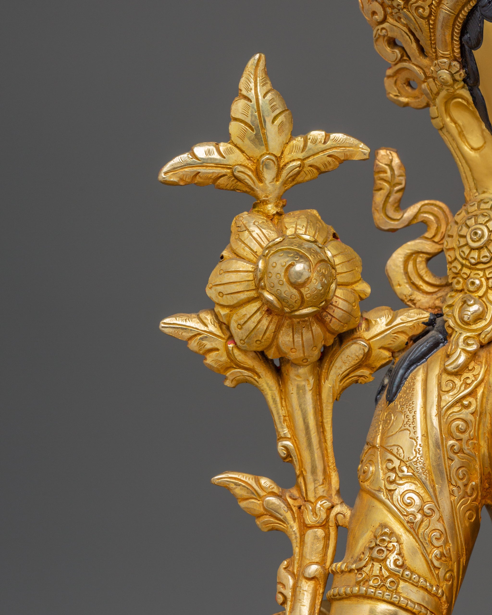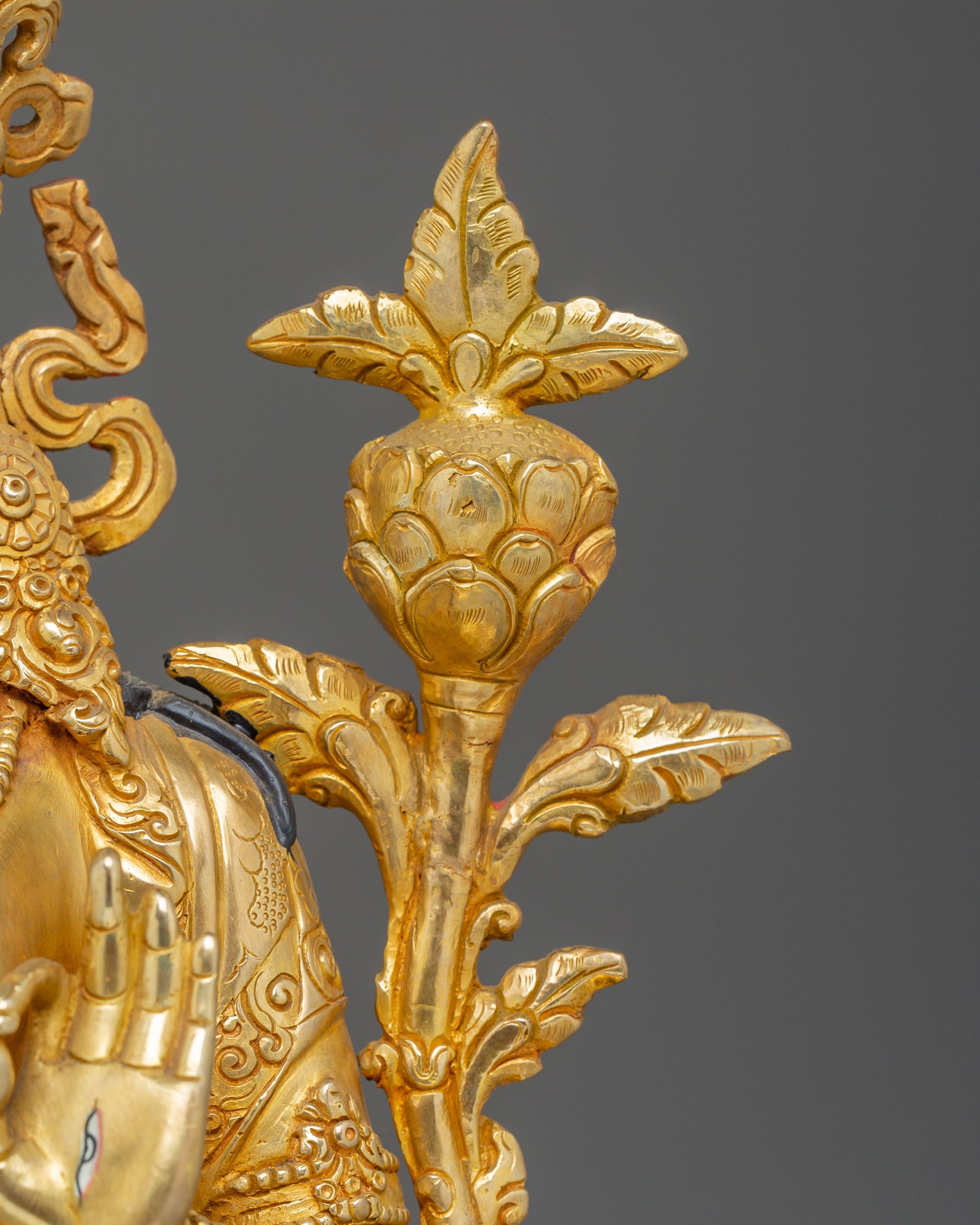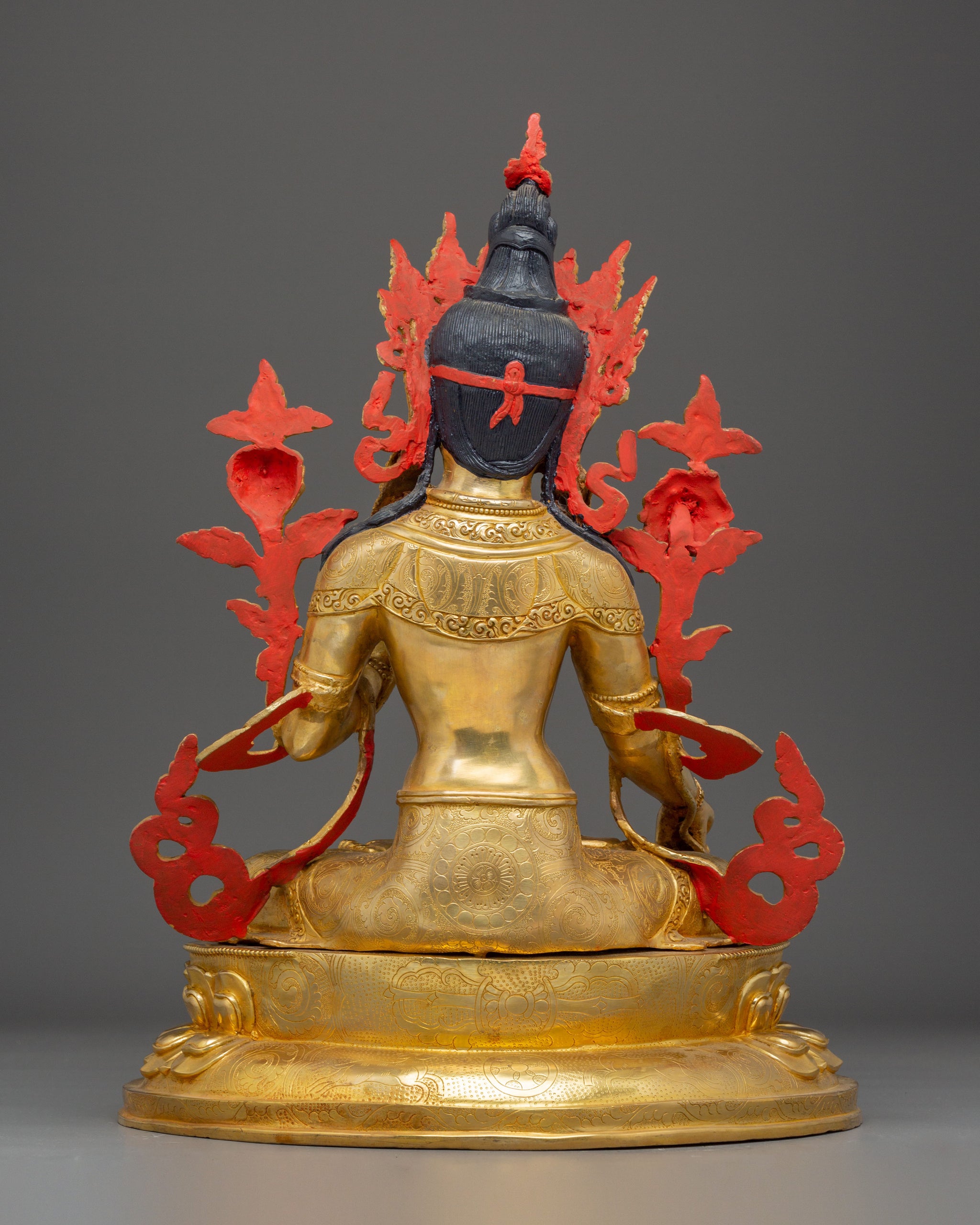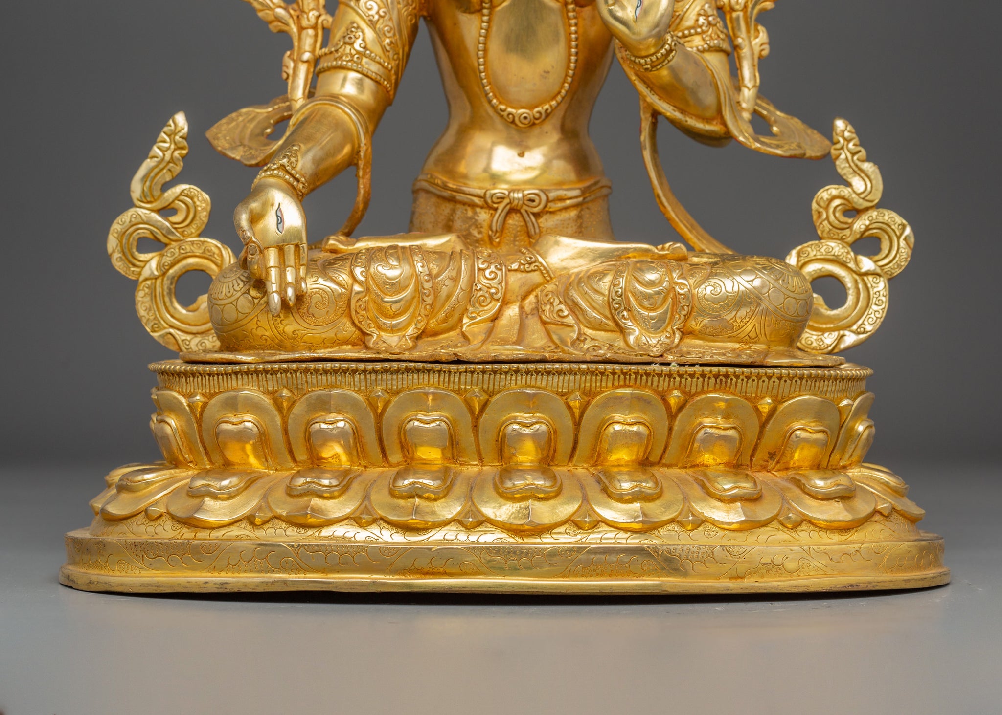 White Tara Artwork, Goddess of Longevity and Healing, measures 48 cm in height with a 35.5 cm wide base and weighs 9.33 kg. Crafted from a copper, covered with 24K gold gilding. This sculpture, handcrafted by expert Nepalese artisans, elegantly symbolizes Himalayan Buddhism's sacred traditions, making it an appropriate addition to altars, meditation places, or sacred collections.