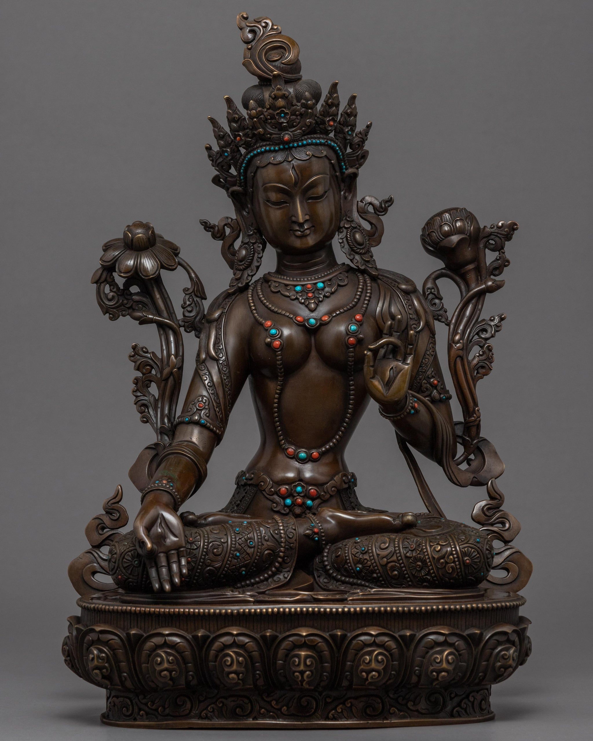 The traditional White Tara Art Sculpture was expertly crafted in Himalayan art style. We carefully molded the statue in an oxidized copper body. The Intricate design patterns are carved and embellished on the crown, utpala, and other embellishments, which signifies the importance of the statue. We have depicted a deity seated on top of a moon disc lotus seat with a tranquil expression. She makes the Surya Ravi mudra with her right hand and a Vitarka mudra with her left. We assure you that the materials used for the statue are of the highest quality and will last for years. This magnificent sculpture of the White Tara will be a wonderful present to a practitioner like you.