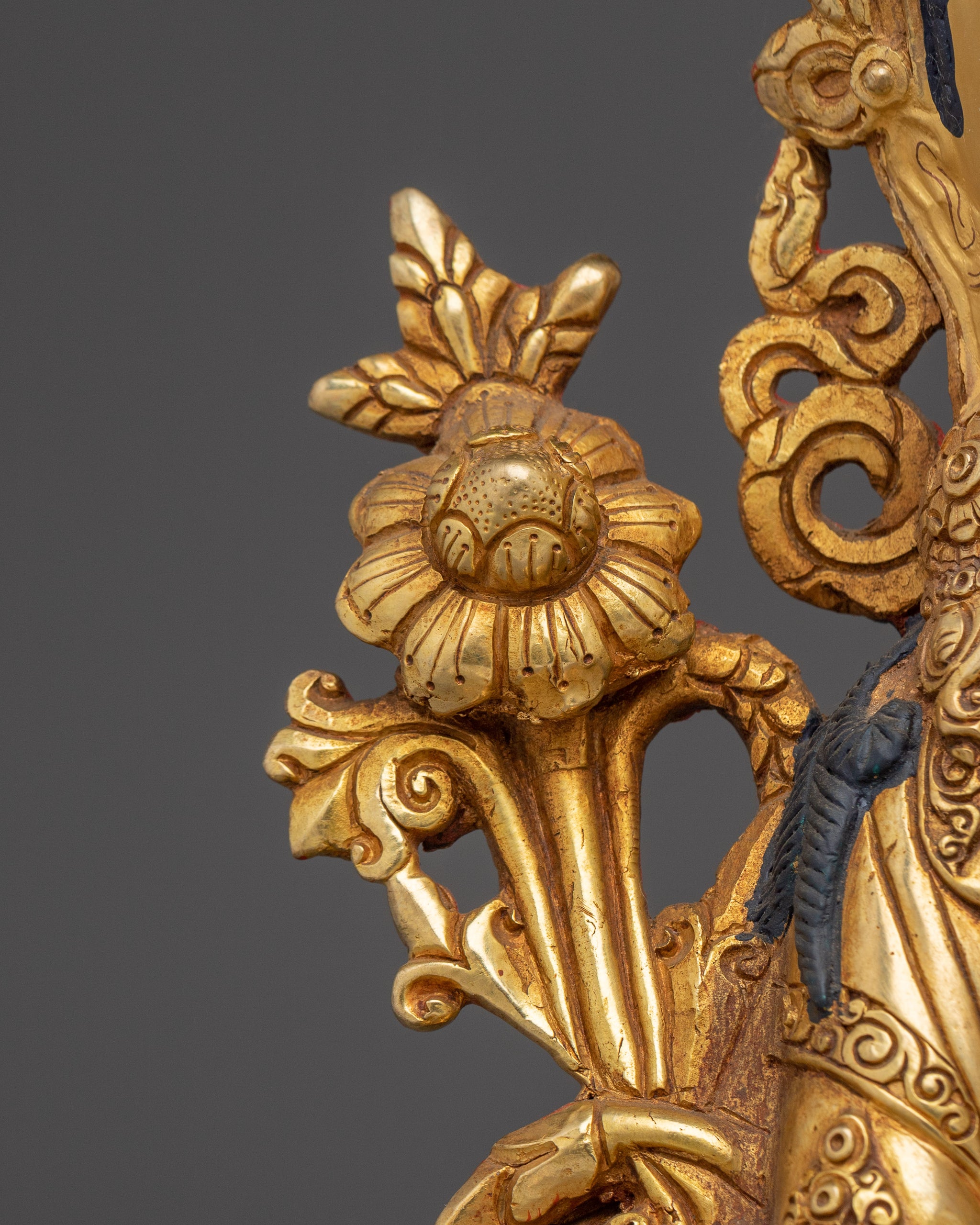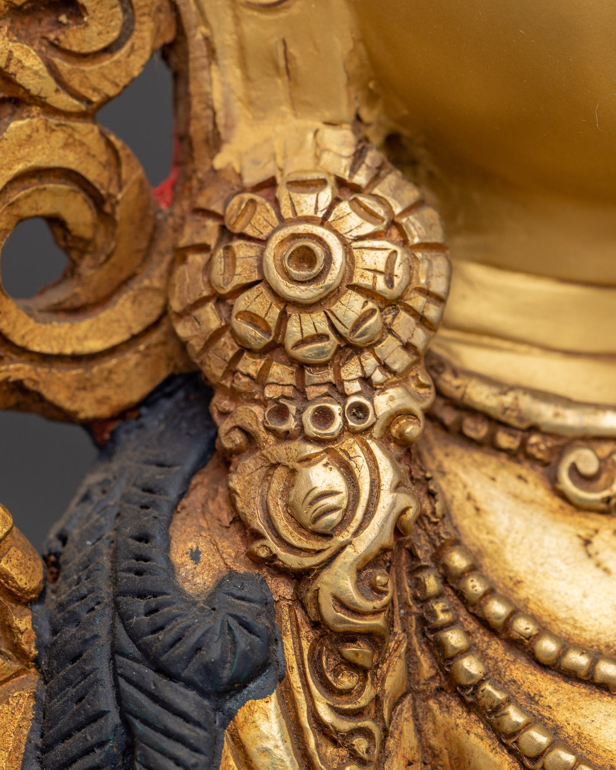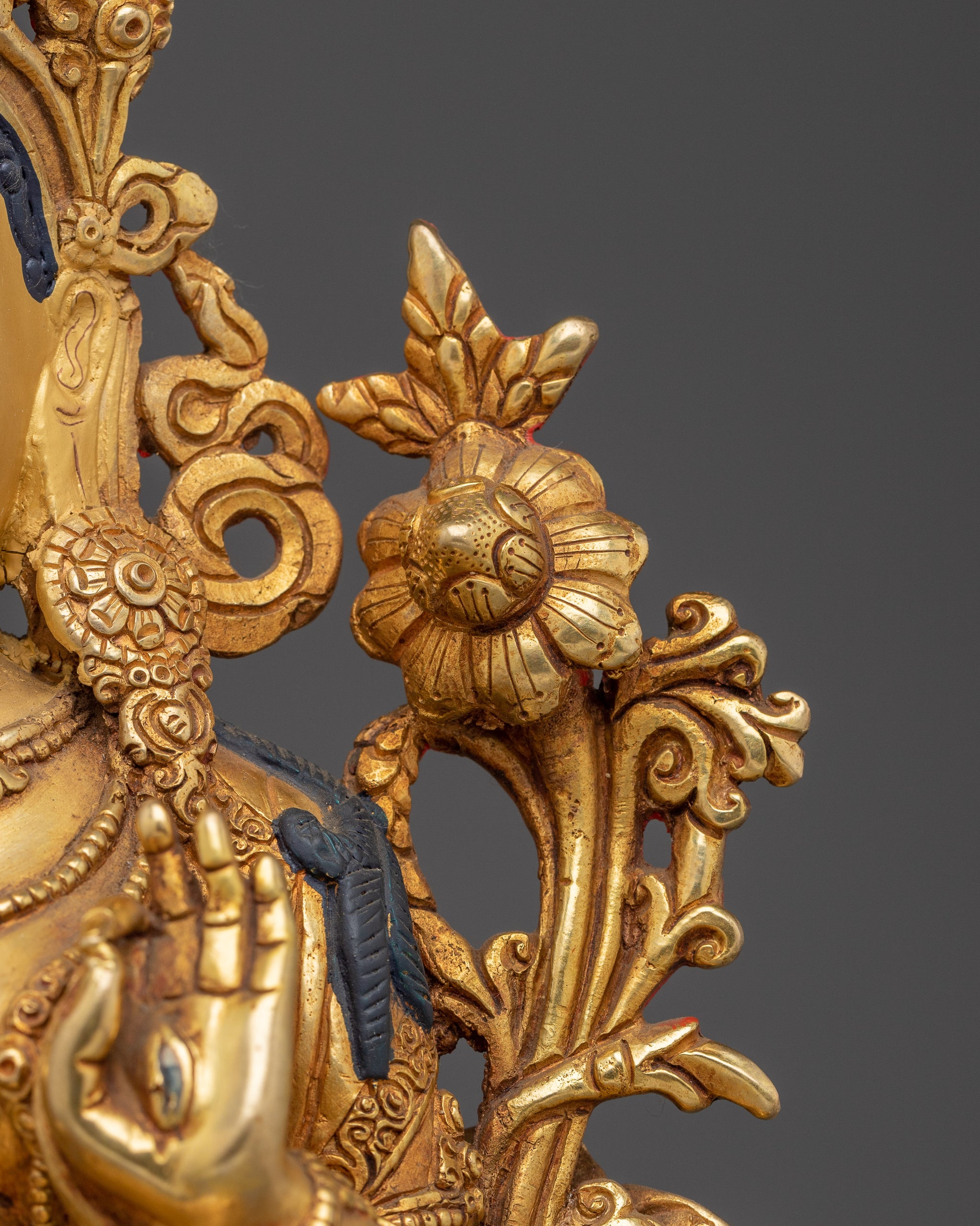 Standing 13.8" (35 cm) tall, this attractive White Tara Bodhisattva of Compassion and Healing Statue is a striking representation of compassion, purity, and healing energy. The statue is an incredible and spiritual presence, handcrafted with great care from copper and gilded with 24K gold. Traditionally, White Tara is shown sitting on a lotus throne, her elegant stance signifying compassion and peace. She is holding a healing stem in one hand, signifying her function in easing suffering, while she is making an offering action with the other hand.