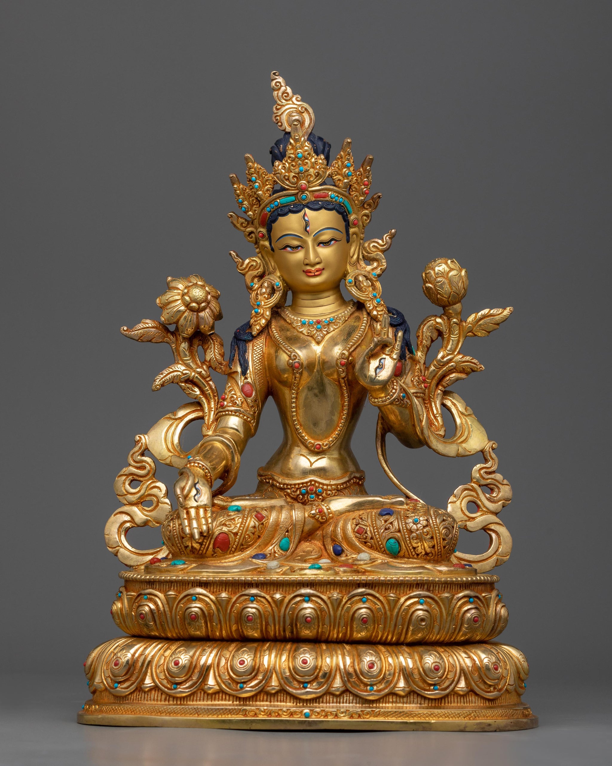 Our White Tara Buddha statue, a beautiful fusion of spiritual symbolism and Nepalese artistry, has been unveiled. White Tara, a divinity connected with compassion, long life, healing, and peace, is depicted in this exquisite statue. Its solid copper body, embellished with 24k gold gilding, precise acrylic paintings, and intricate hand-carved gemstones, provides a physical sense of stability as well as an aesthetic delight.
