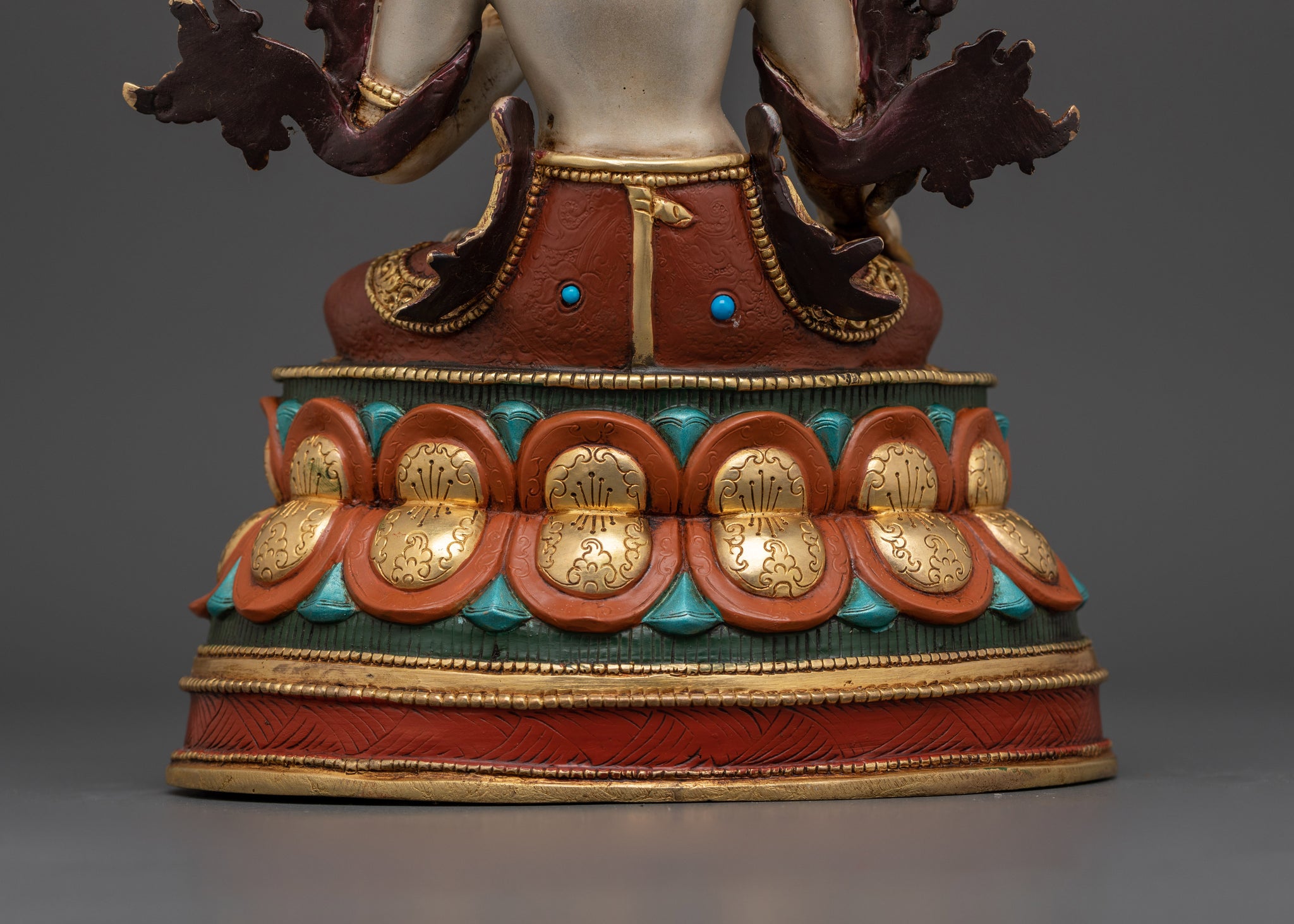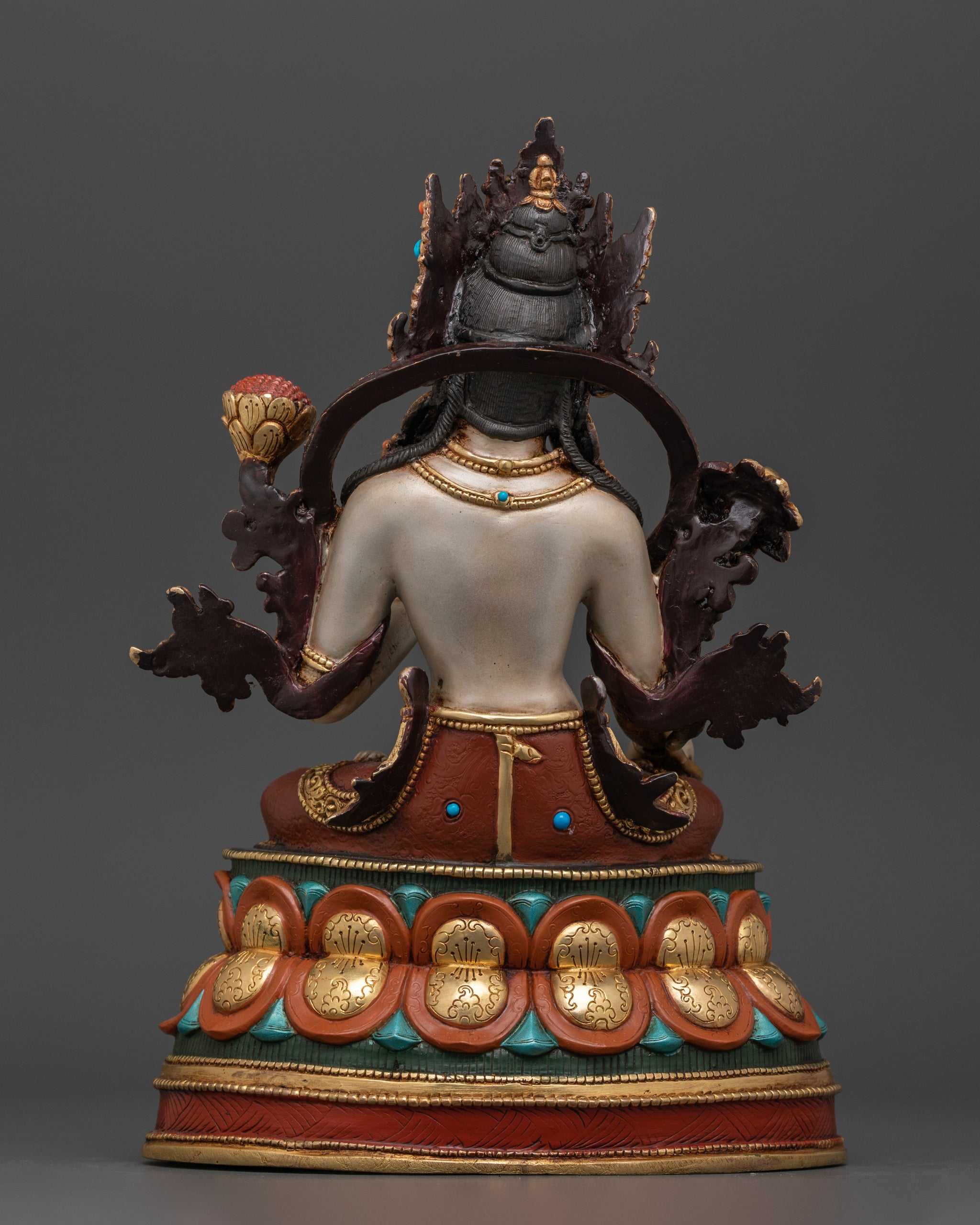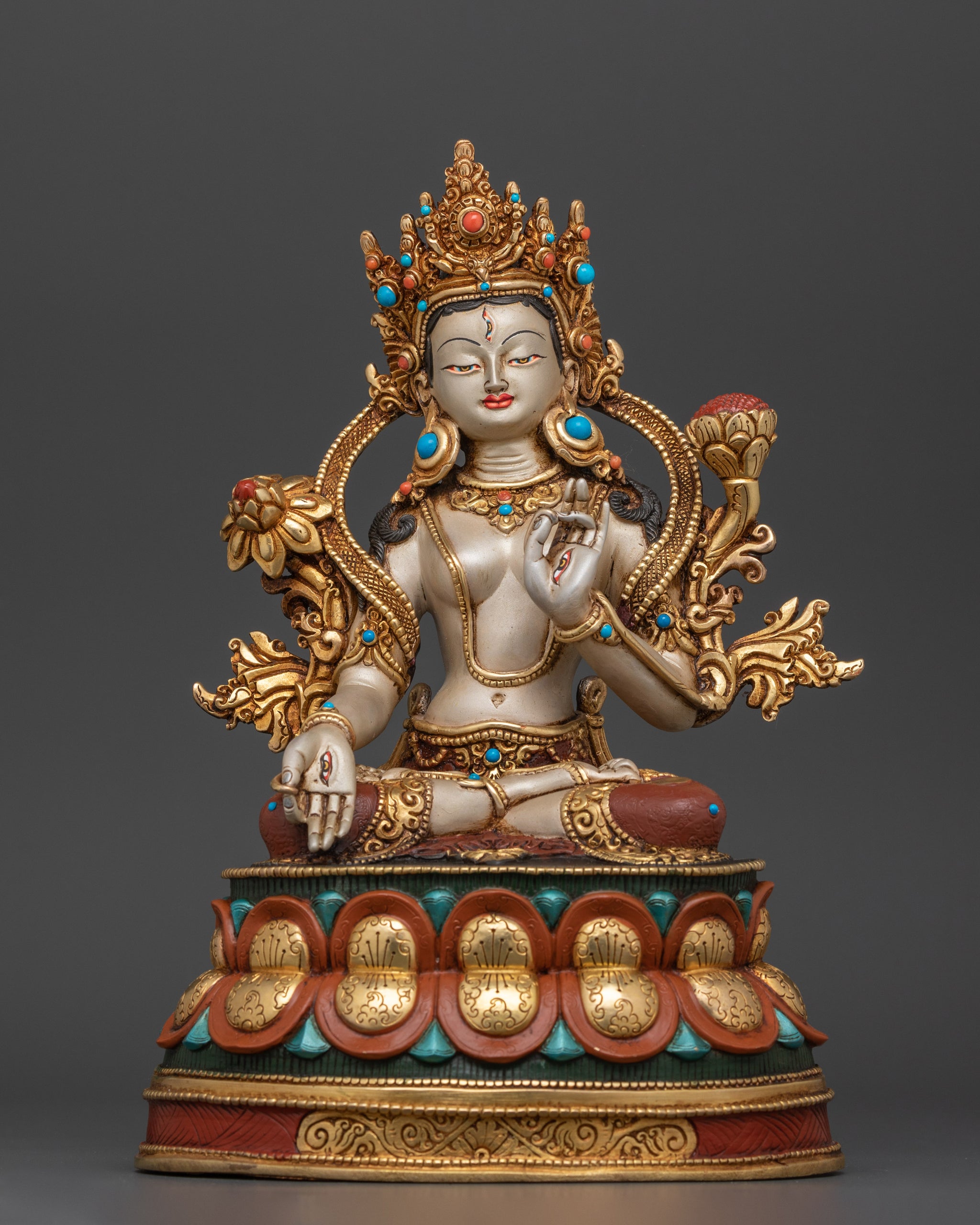 This magnificent White Tara Buddha figurine is a divine symbol of compassion and longevity, meticulously created to capture the tranquil beauty of this venerated goddess. This 10.4-inch-tall statue is crafted of high-quality copper, gilded in 24K gold, and finished with beautiful acrylic paints. The incorporation of hand-carved jewels heightens the spiritual and visual appeal, resulting in a dazzling and sacred artwork.