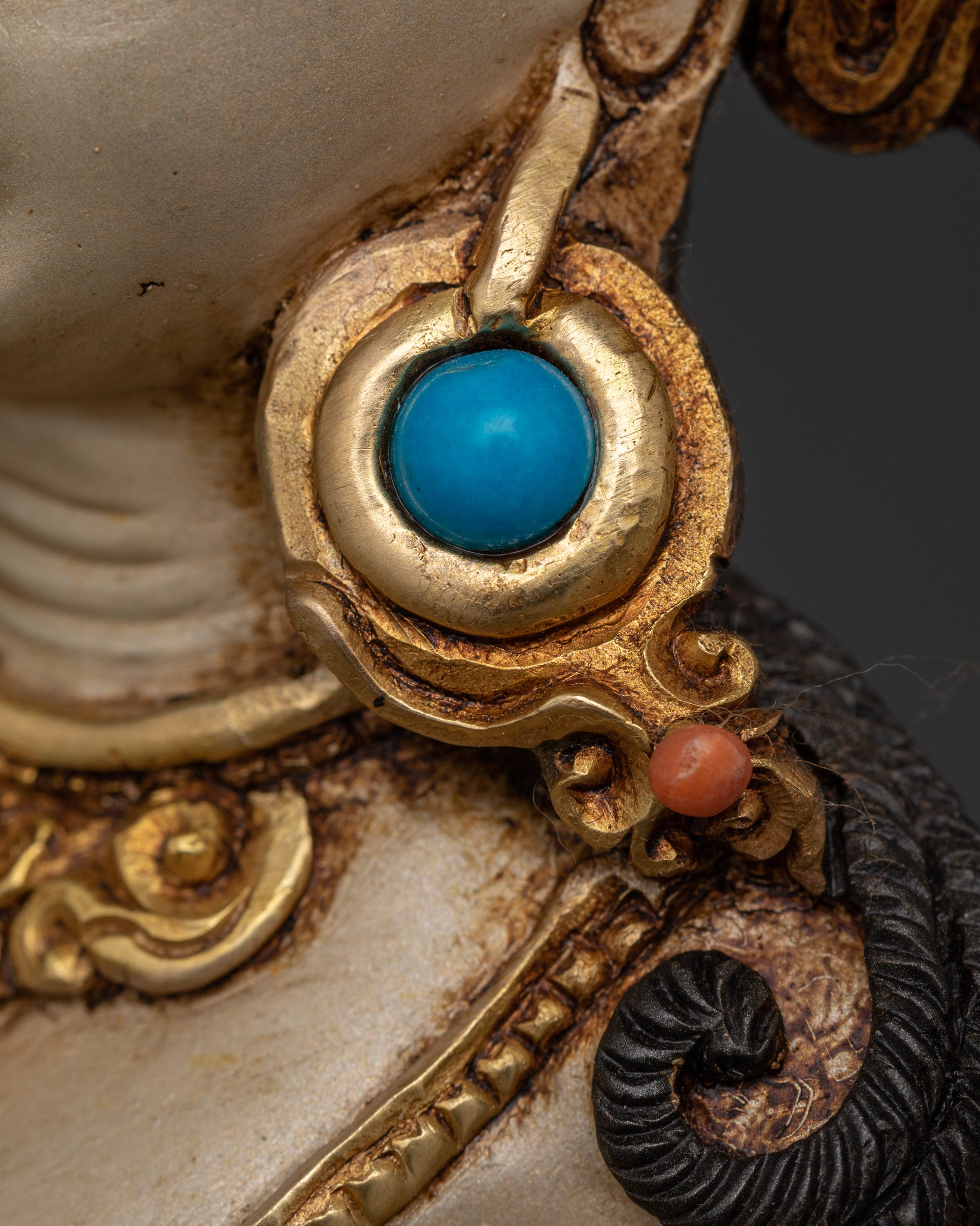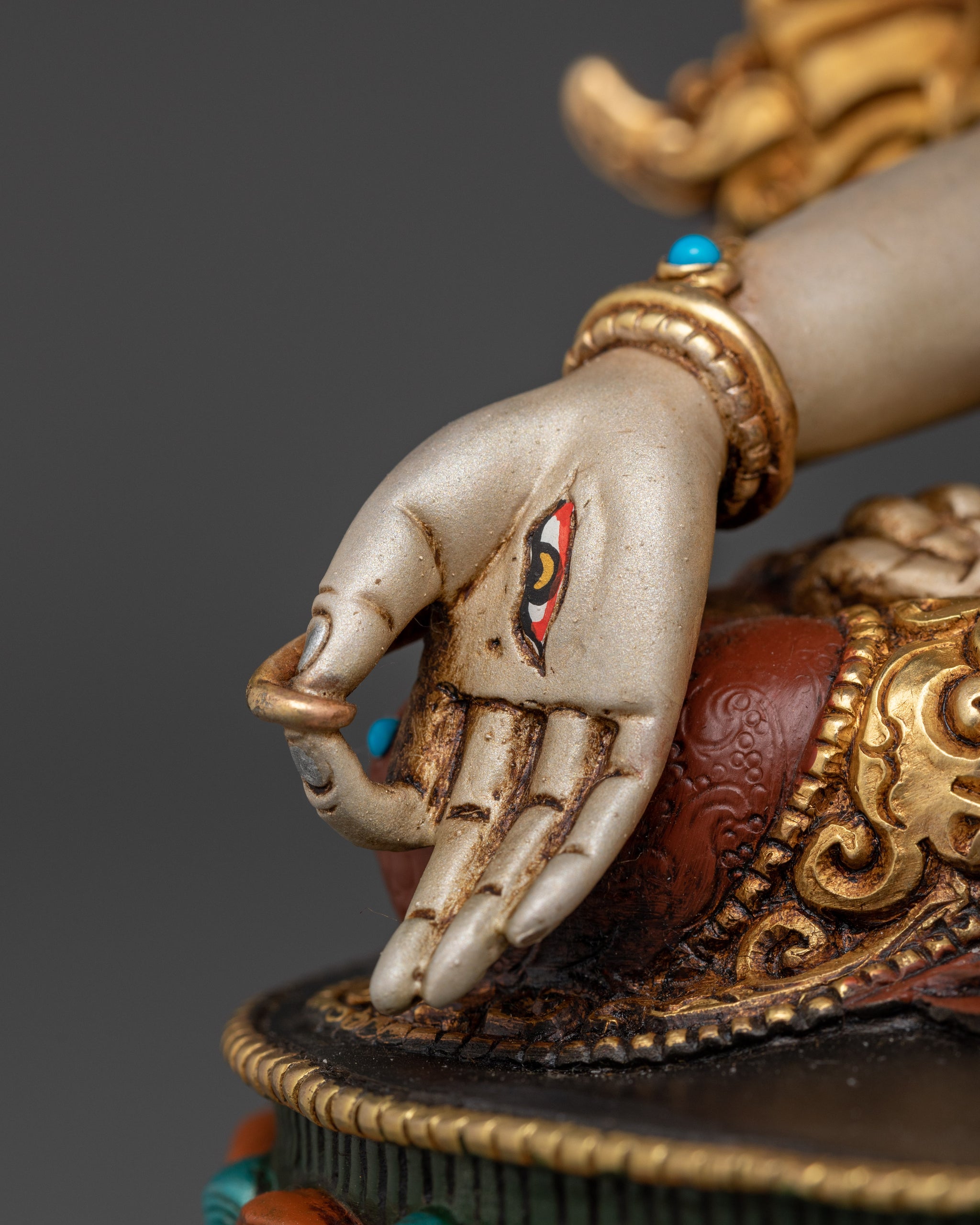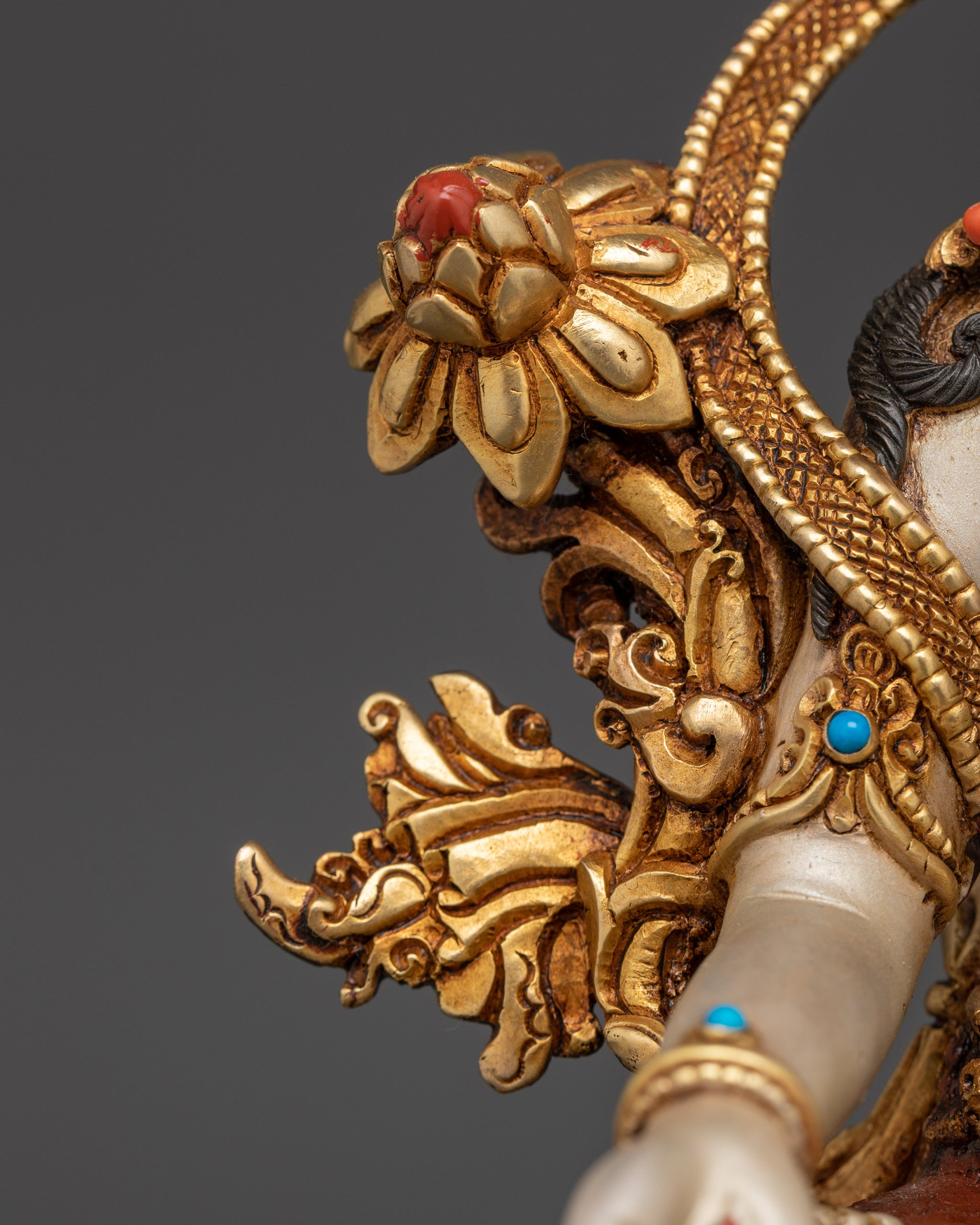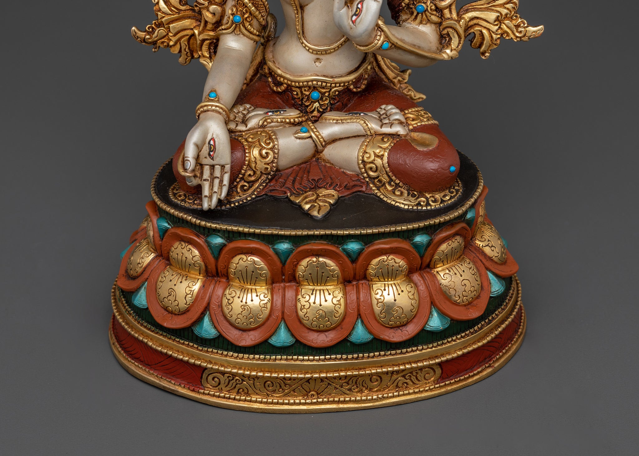 White Tara, a meticulously hand-carved Buddhist figure, sits beautifully cross-legged on a lotus. Her seven eyes, which symbolize her loving vigilance, set her distinct. Aside from her two normal eyes, she has a third eye on her forehead, one on each hand, and one on the soles of her feet. These differentiating features reflect her capacity to identify sorrow in all levels, as well as her motivation to help and compassionately treat all beings.