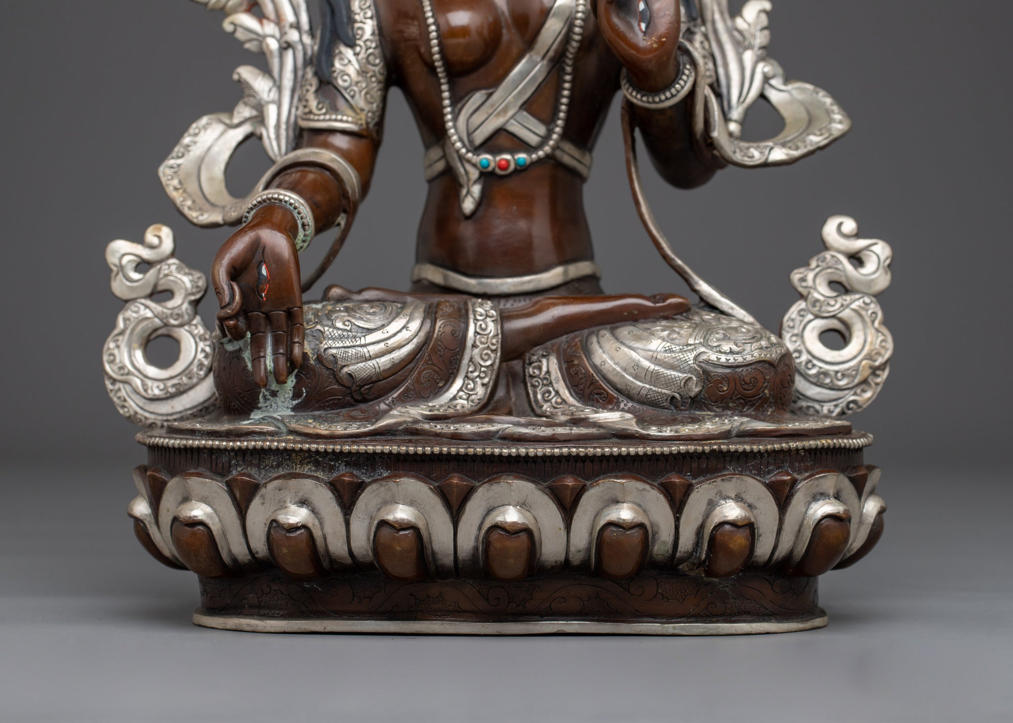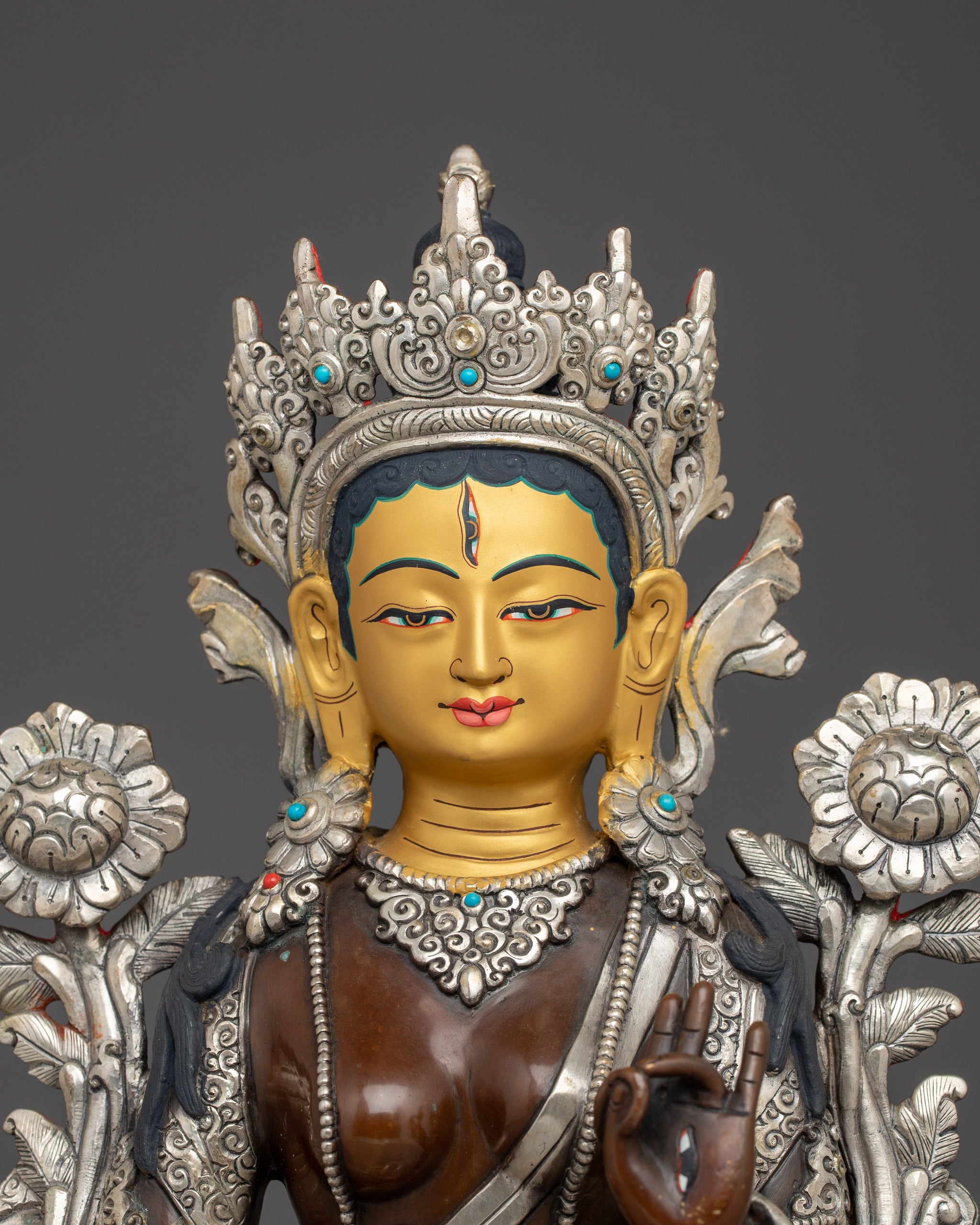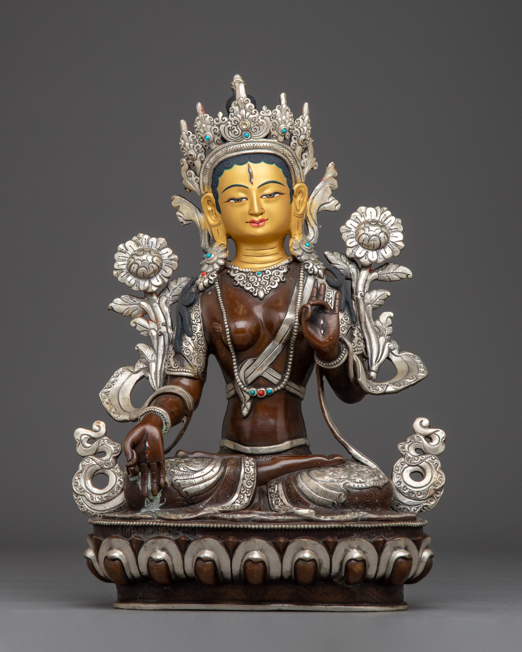 White Tara Copper Statue with Silver | Gold Painted Copper Buddhist Deity