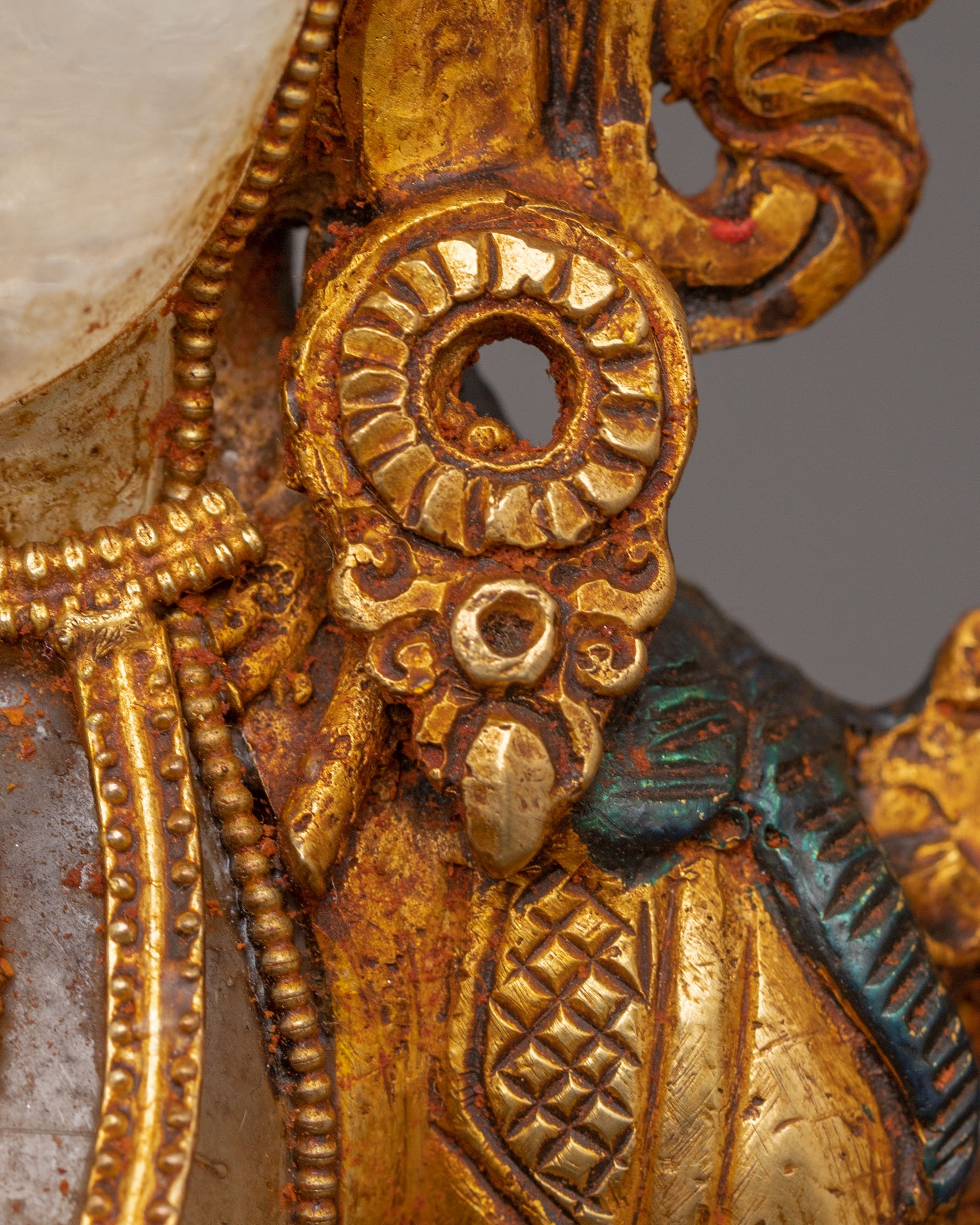Introducing our White Tara Crystal Handcrafted Statue, which was lovingly made by skilled artisans in Patan, Nepal. This statue, which has a base diameter of 6.5 inches and a height of 8.9 inches, is made of copper and has a crystal body and Mercury gold that has been expertly gilded. In addition to highlighting her divine features, the delicate acrylic paints give the statue a feeling of refinement and grace.