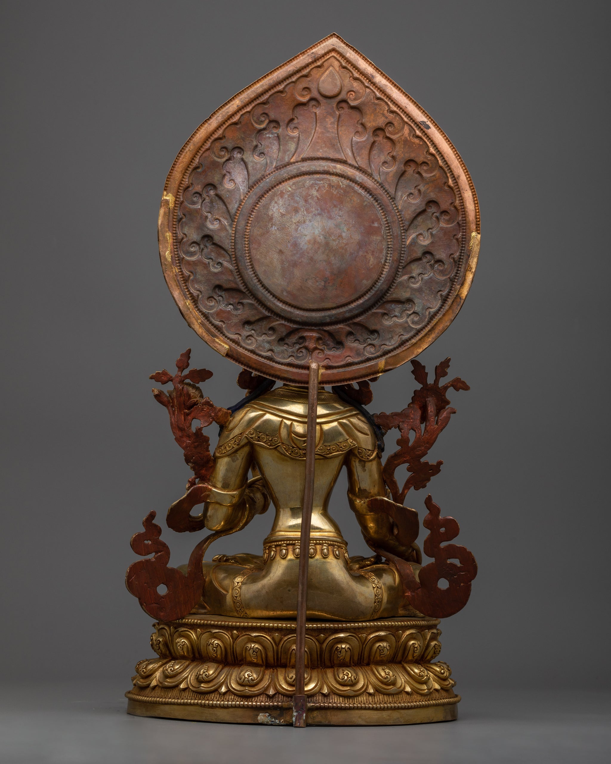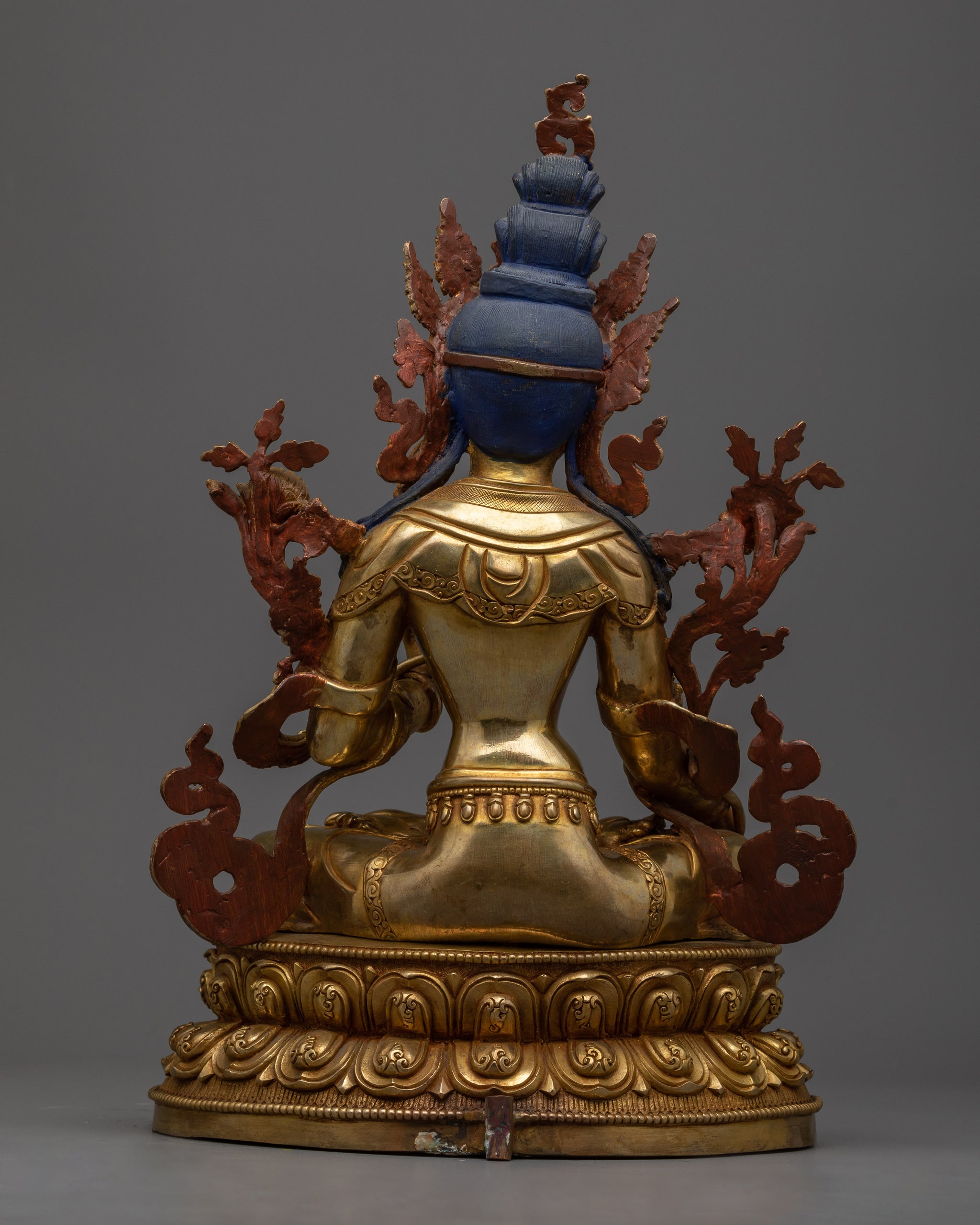 Vajrayogini is stunning. The details are amazing. It's easy to make out her facial expressions, skulls, feet, and the ring of fire around her. You can tell she's handmade. There is a consecration hole in her back.