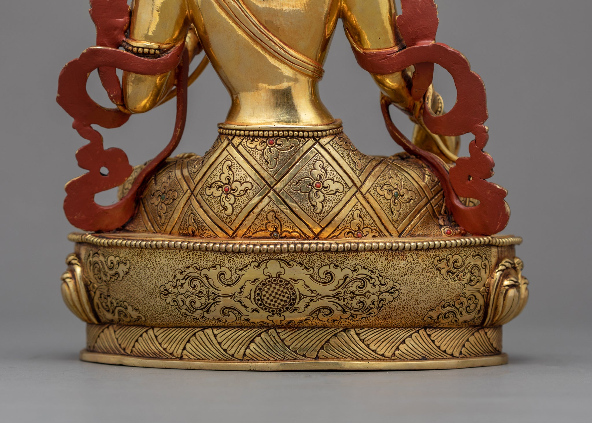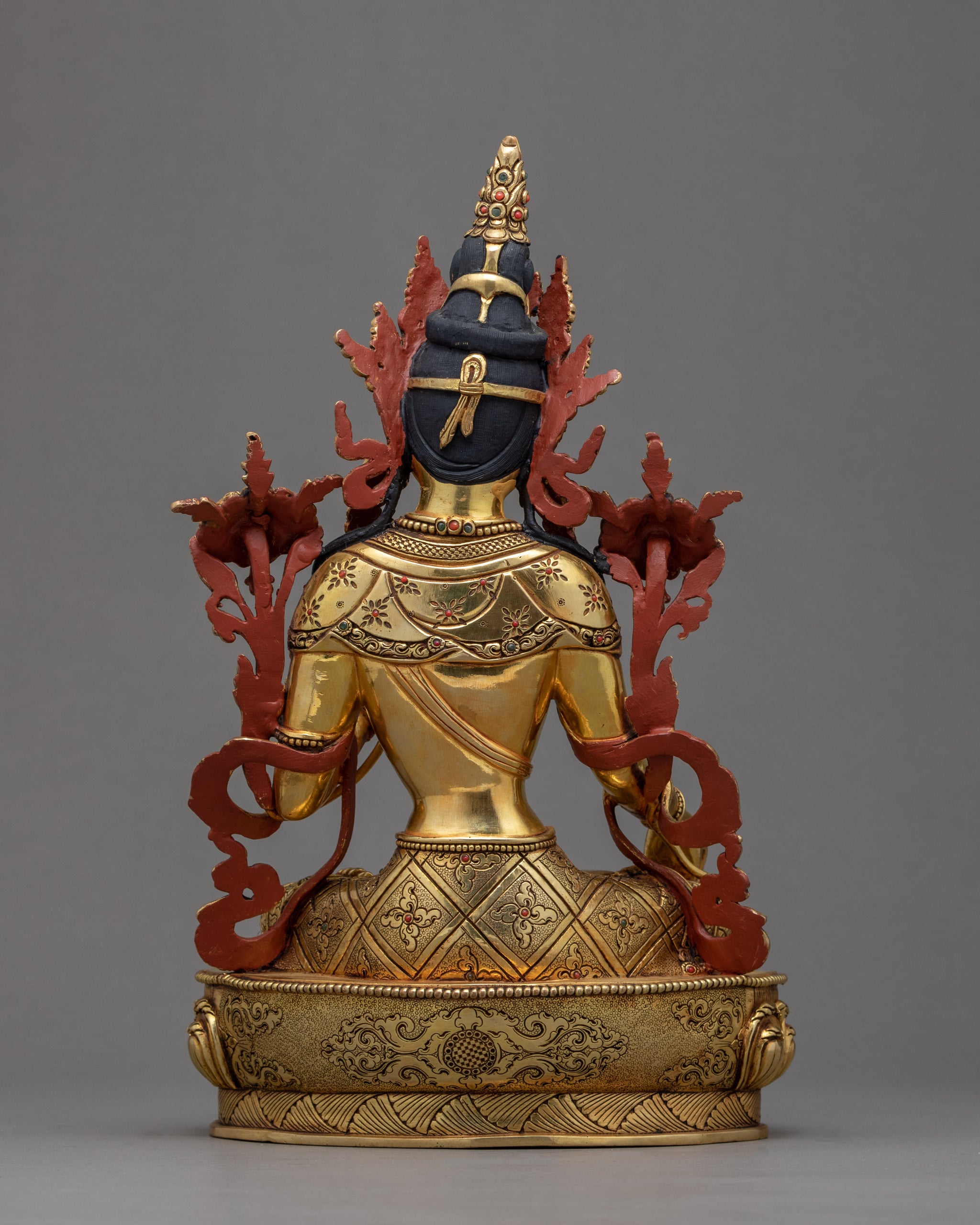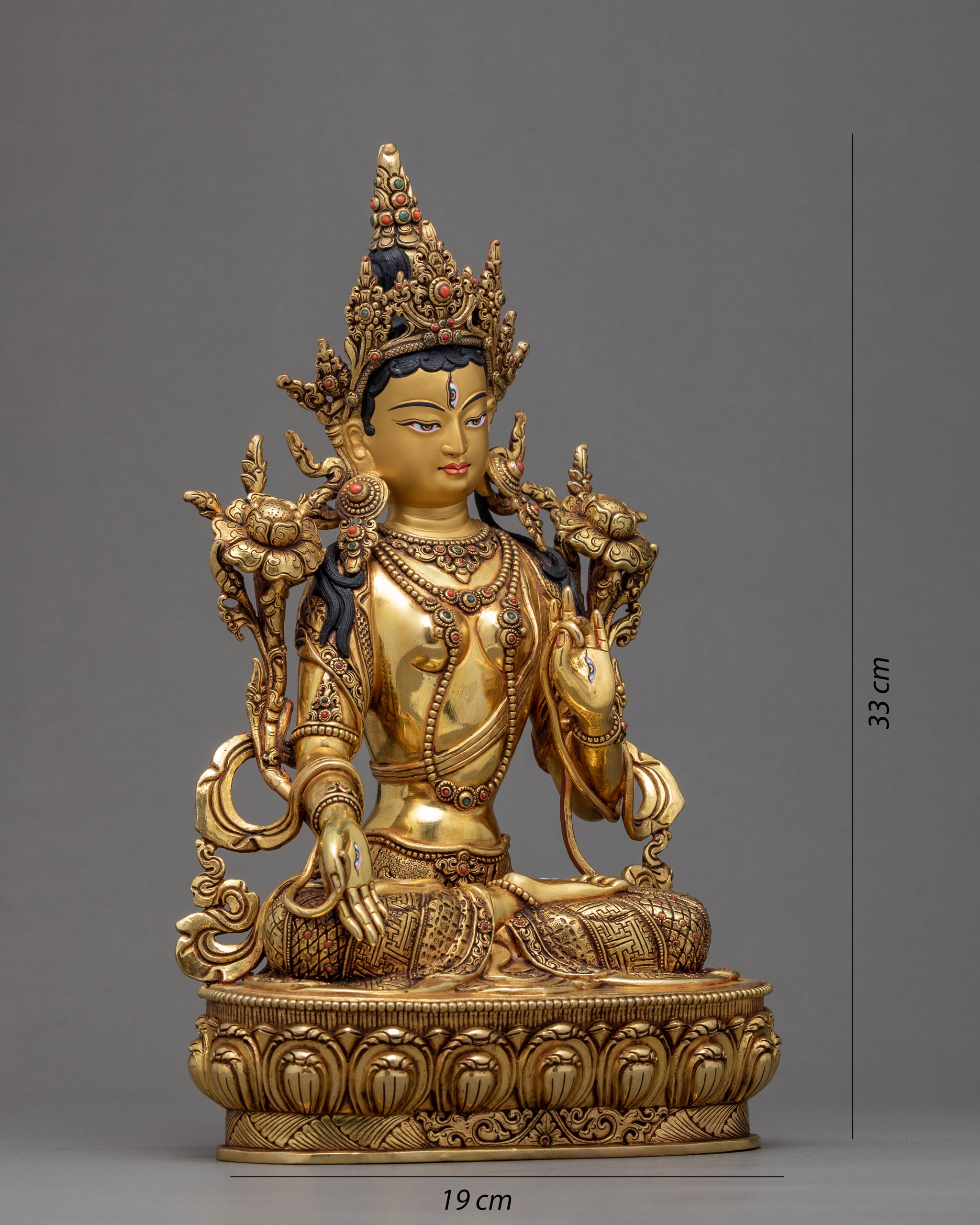 We have exquisitely hand-carved the statue of the White Tara Goddess in traditional Himalayan art of Nepal. This statue will be a tremendous meditational and yoga component for a practitioner like you. You can also use the sculpture in various Buddhist traditions and auspicious occasions. We are the Kathmandu Valley artist whose artisan has passed through generations reflecting Buddhism. We have used materials like 24k gold for gilding the statue and copper body for carving it. We assure you that the figure will endure long-lasting for many years since the materials are high quality.