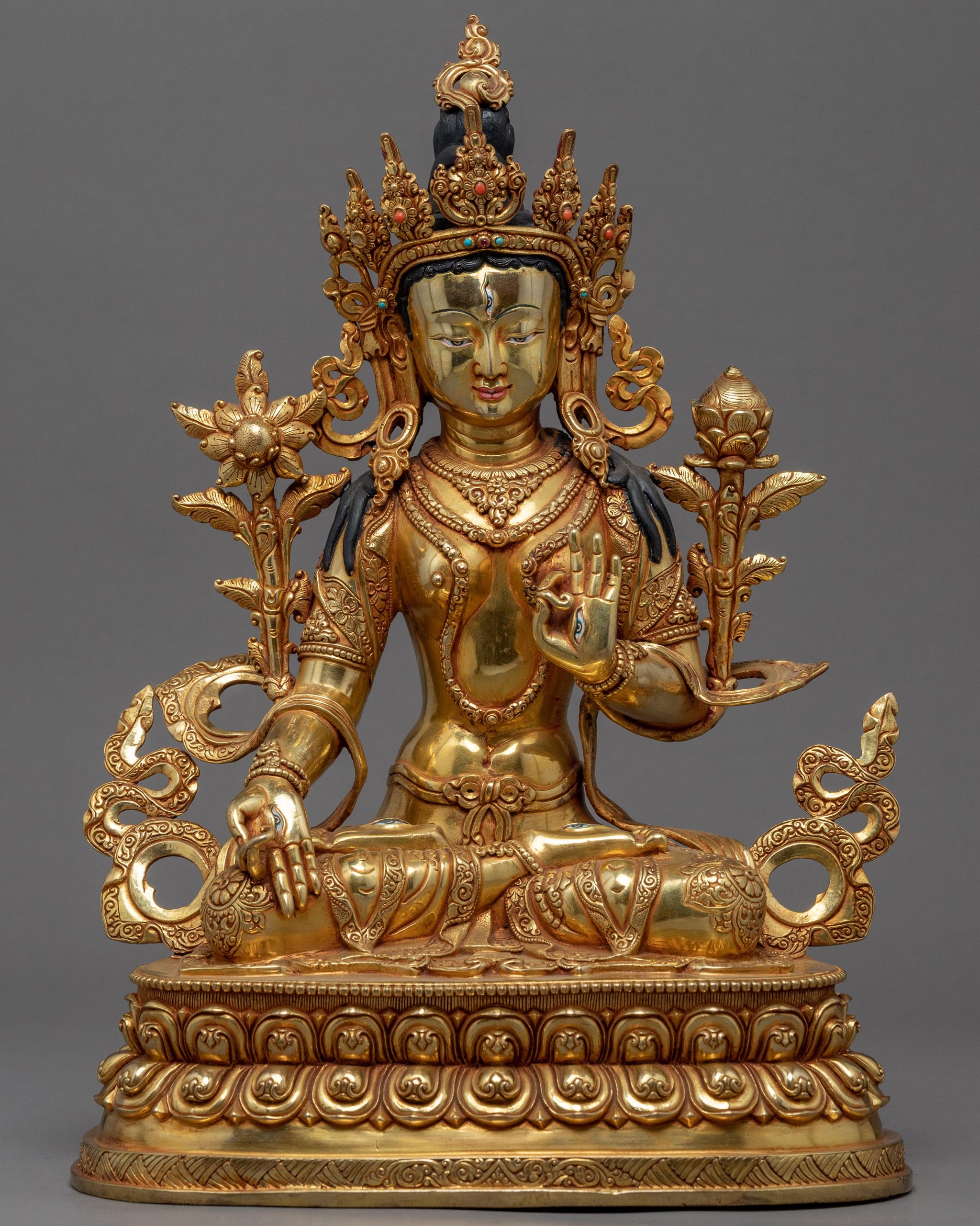 This White Tara Gold Statue was traditionally crafted by the master craftsmen of Nepal. This flawless piece of art was sculpted from a copper body and then gilded with 24k genuine gold. With a calm and tranquil smile, the deity is seated atop a moon disc lotus, holding an utpala in her left hand and resting her right hand on her right knee. The use of Acrylic painting highlights the statue to a greater extent giving it mesmerizing look. The deity is adorned in multiple body ornaments and majestic robes, which signify her importance. You can use this figurine for different Buddhist Rituals and meditational practices, and it will be a perfect gift for a practitioner like yourself.