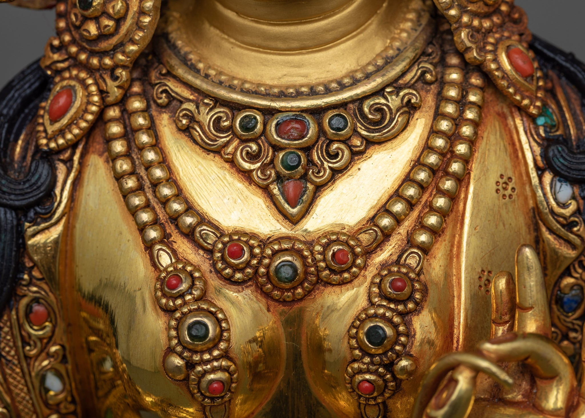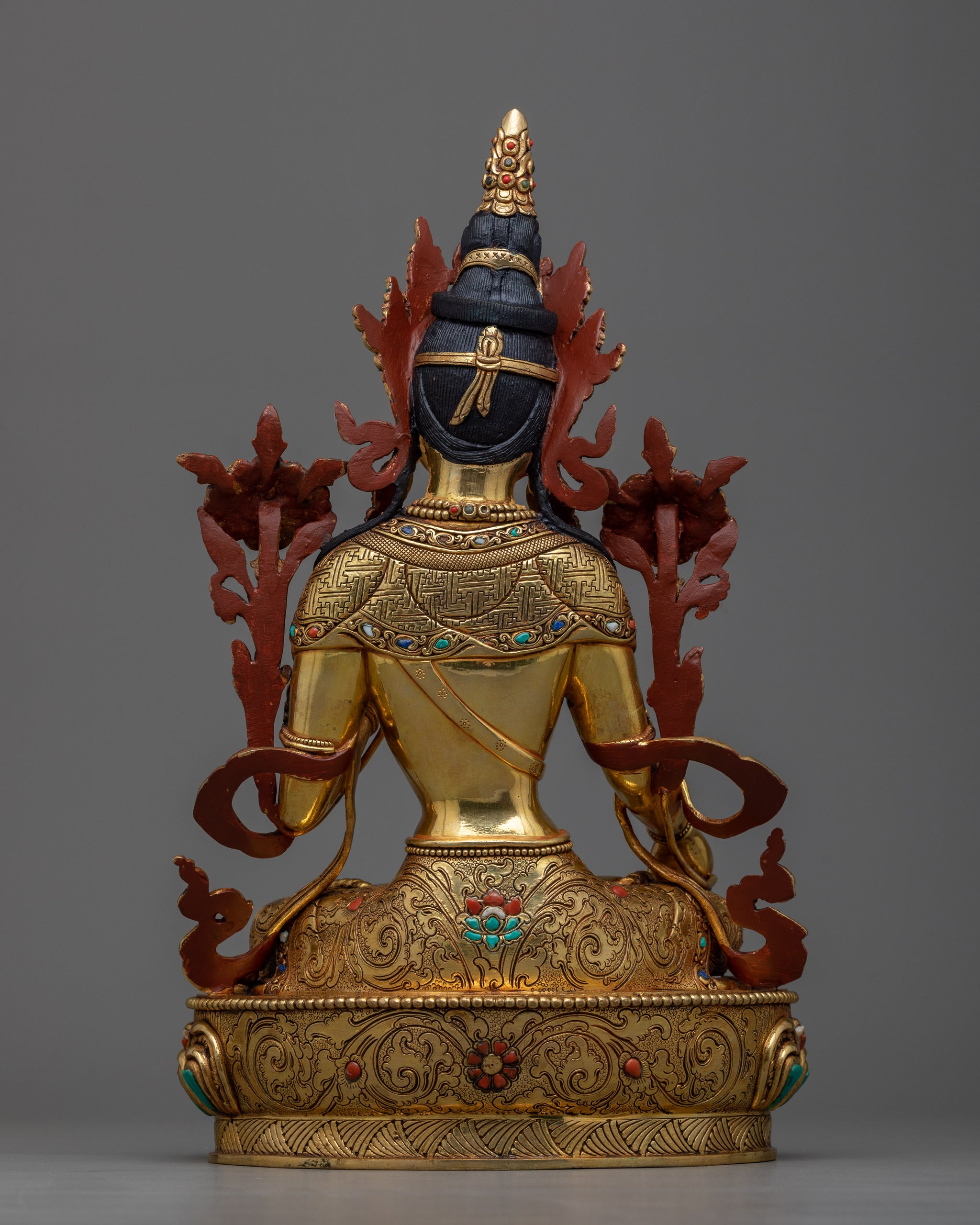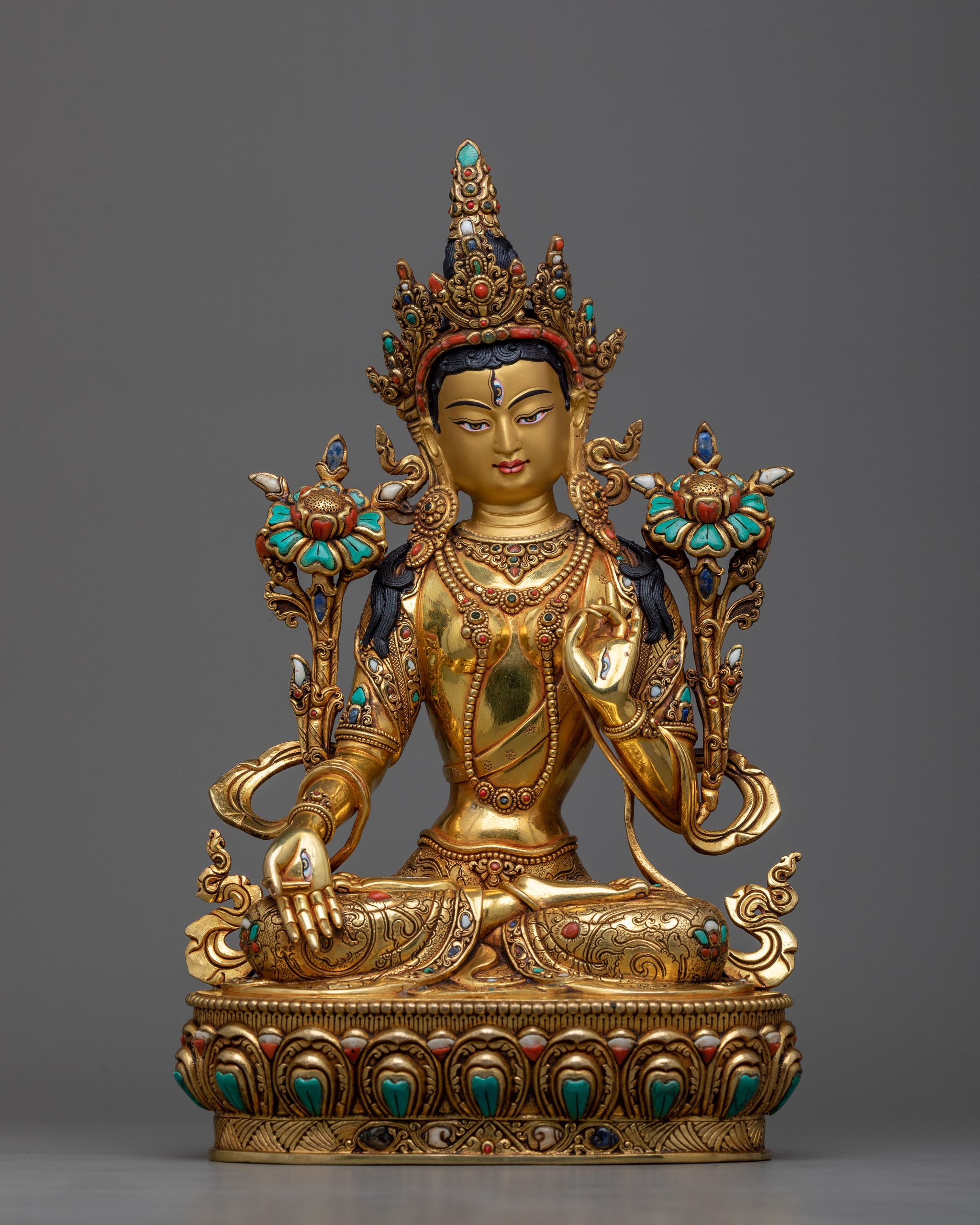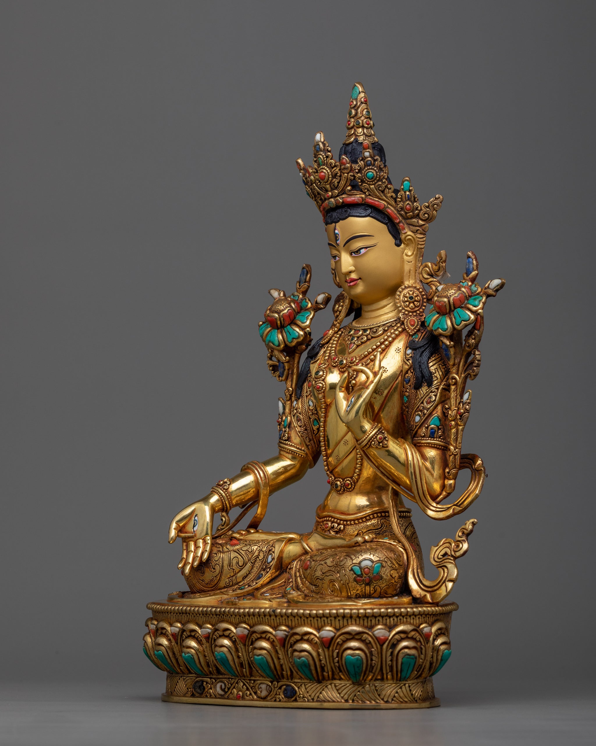 The White Tara, also known as Sita Tara, is a brilliant expression of compassion, healing, and longevity, representing the ultimate spiritual elegance. This statue is meticulously created and exudes peace, becoming a nexus of spiritual elegance and rich artistry in your sacred settings. Immerse yourself in the gleaming brilliance of its triple layers of 24k gold gilded finish, which reflects White Tara's ethereal beauty and ageless dedication to offering consolation and serenity. Deeply engraved patterns and those perfectly fitted in hand-carved gemstones further add value to the artistry.