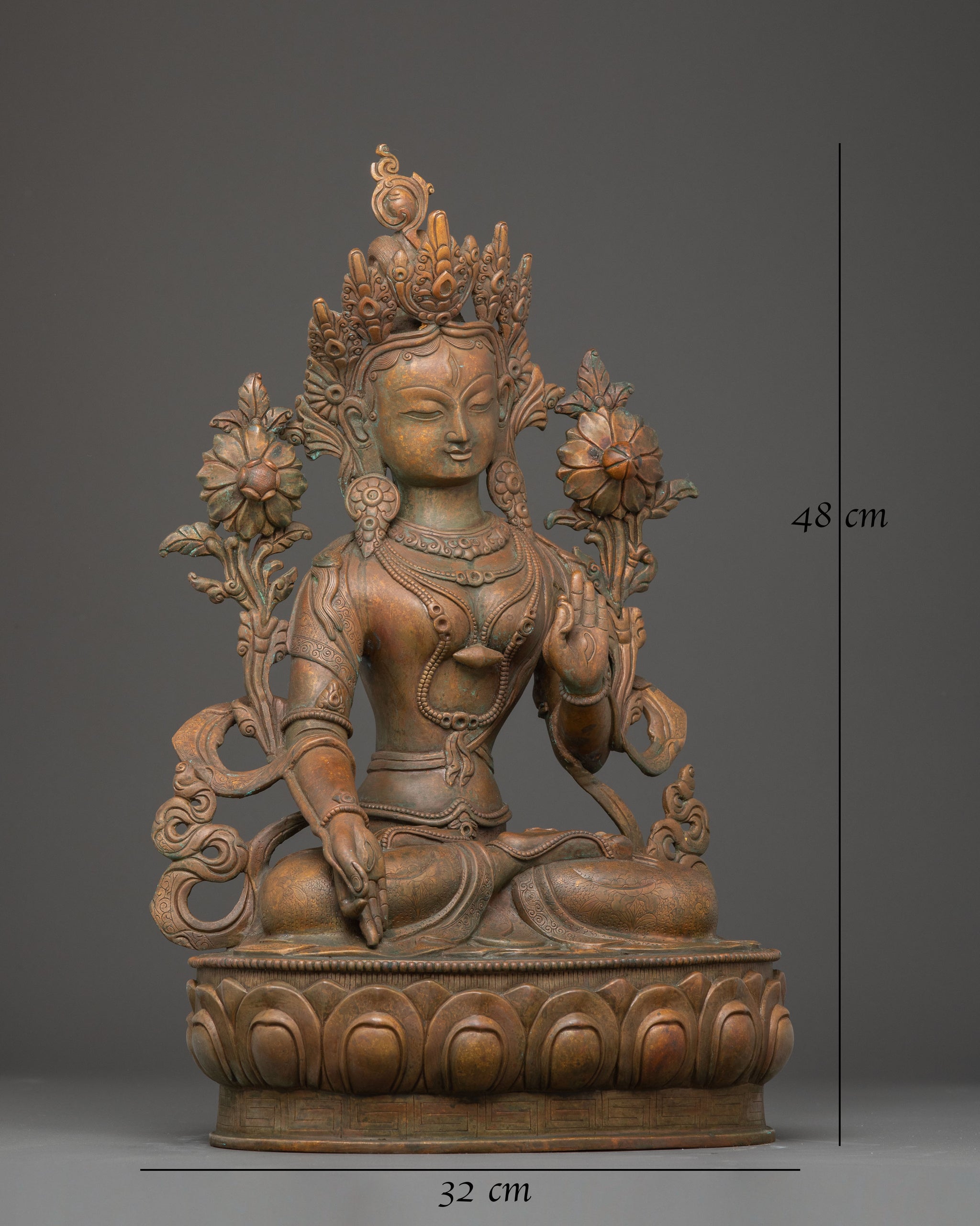 White Tara Statue of Long Life, a symbol of compassion and longevity, radiates divine grace and spiritual blessings. This wonderfully handcrafted statue, which measures 18.9" (Height) x 12.6" (Base) and weighs 10.09 kg, is made of copper body, antique finish, and represents the female Buddha in the Tibetan Buddhist tradition.