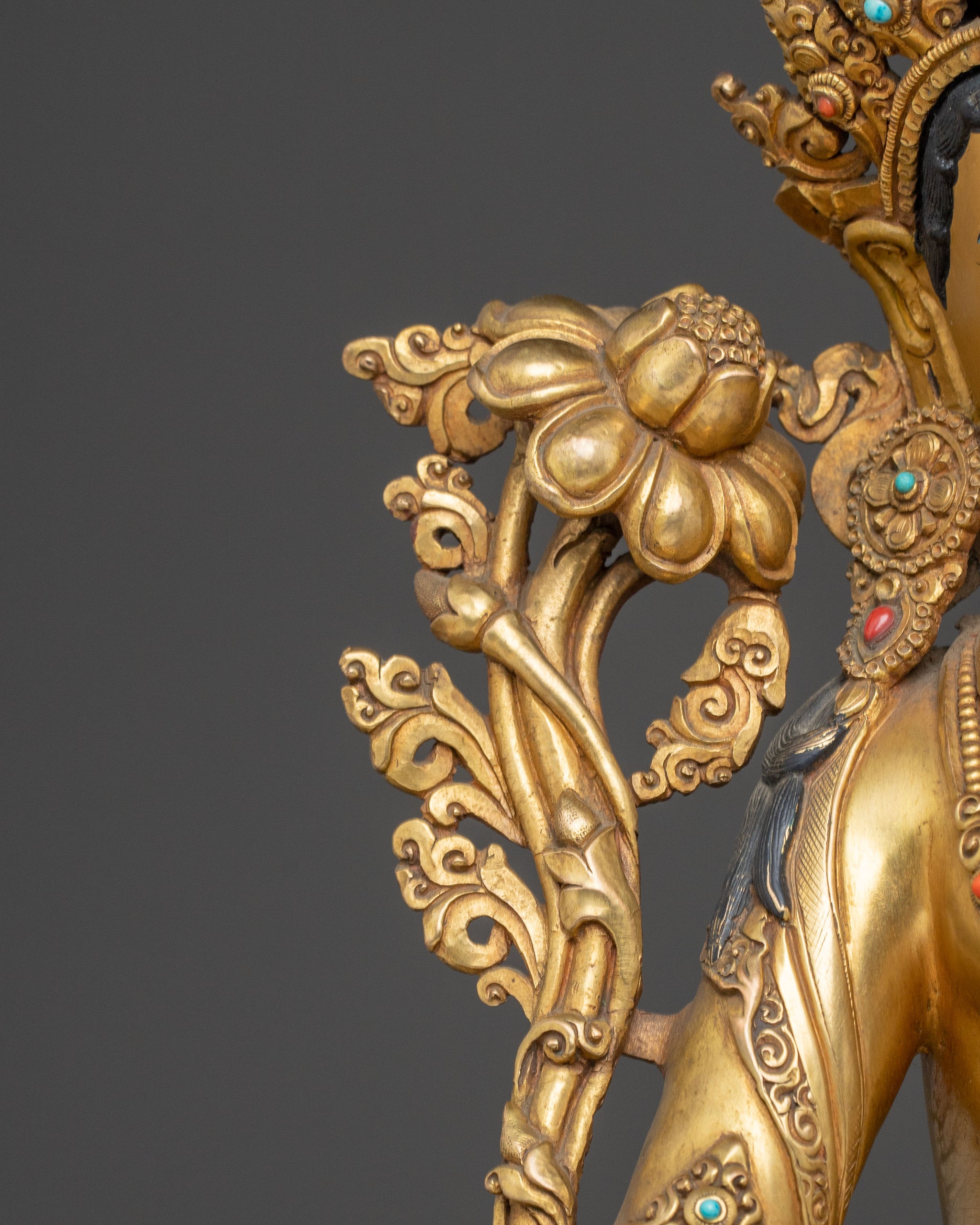 This handcrafted White Tara Statue stands at 15.2”/38.5cm in height and 9.4”/24cm at the base, weighing 6.52 kg. Made from a copper body with mercy gold plating and 24K gold gilding, it features detailed acrylic paintings that enhance her serene presence. Expertly crafted by skilled Nepali artisans, this piece reflects traditional craftsmanship and makes a refined addition to altars, meditation spaces, or spiritual collections.