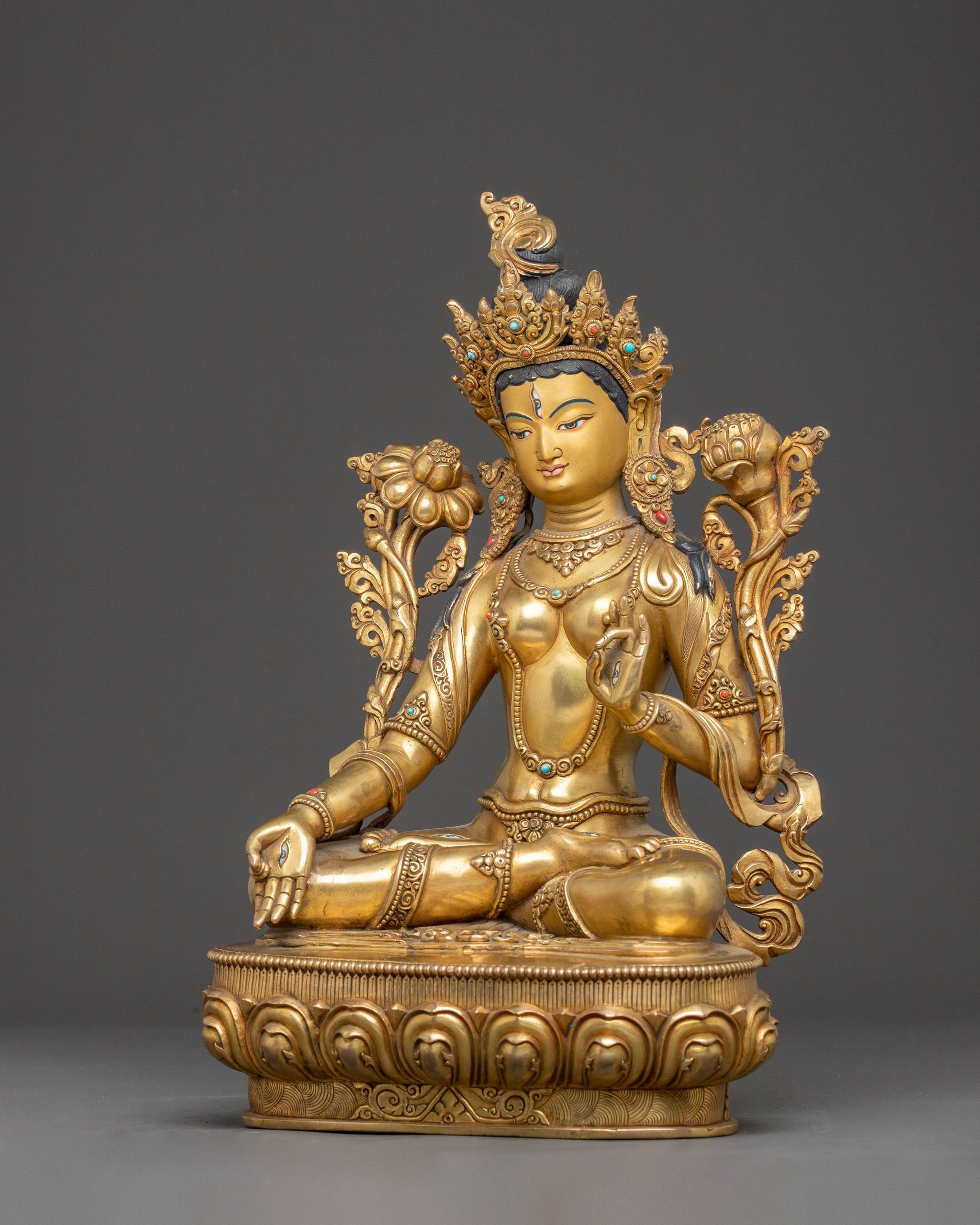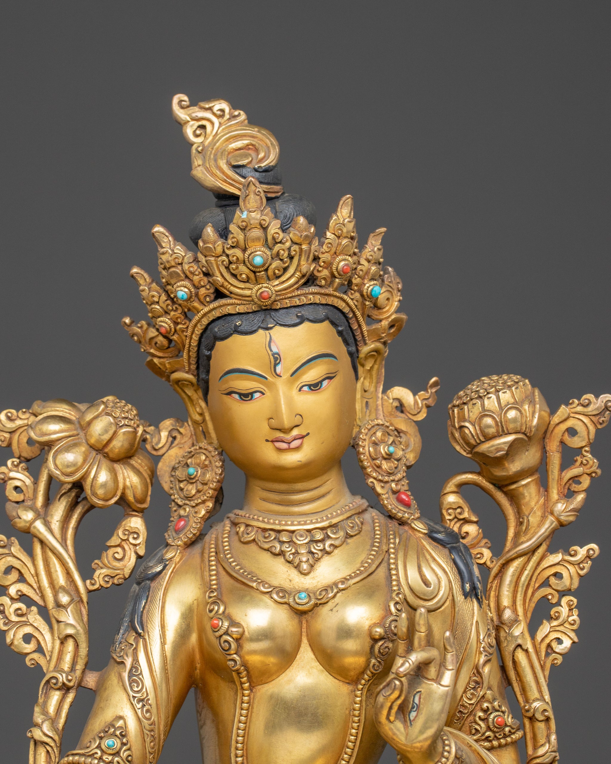 The White Tara Statue depicts the peaceful bodhisattva goddess seated in padmasana (lotus posture) atop a lotus base, symbolizing purity and enlightenment. Her right hand shows the varada mudra, offering blessings and compassion, while her left hand holds a lotus flower, representing spiritual growth and transcendence. She is adorned with a five-pointed crown representing the Five Dhyani Buddhas, along with necklaces and earrings that enhance her divine presence. This statue embodies her qualities of healing, longevity, and protection.