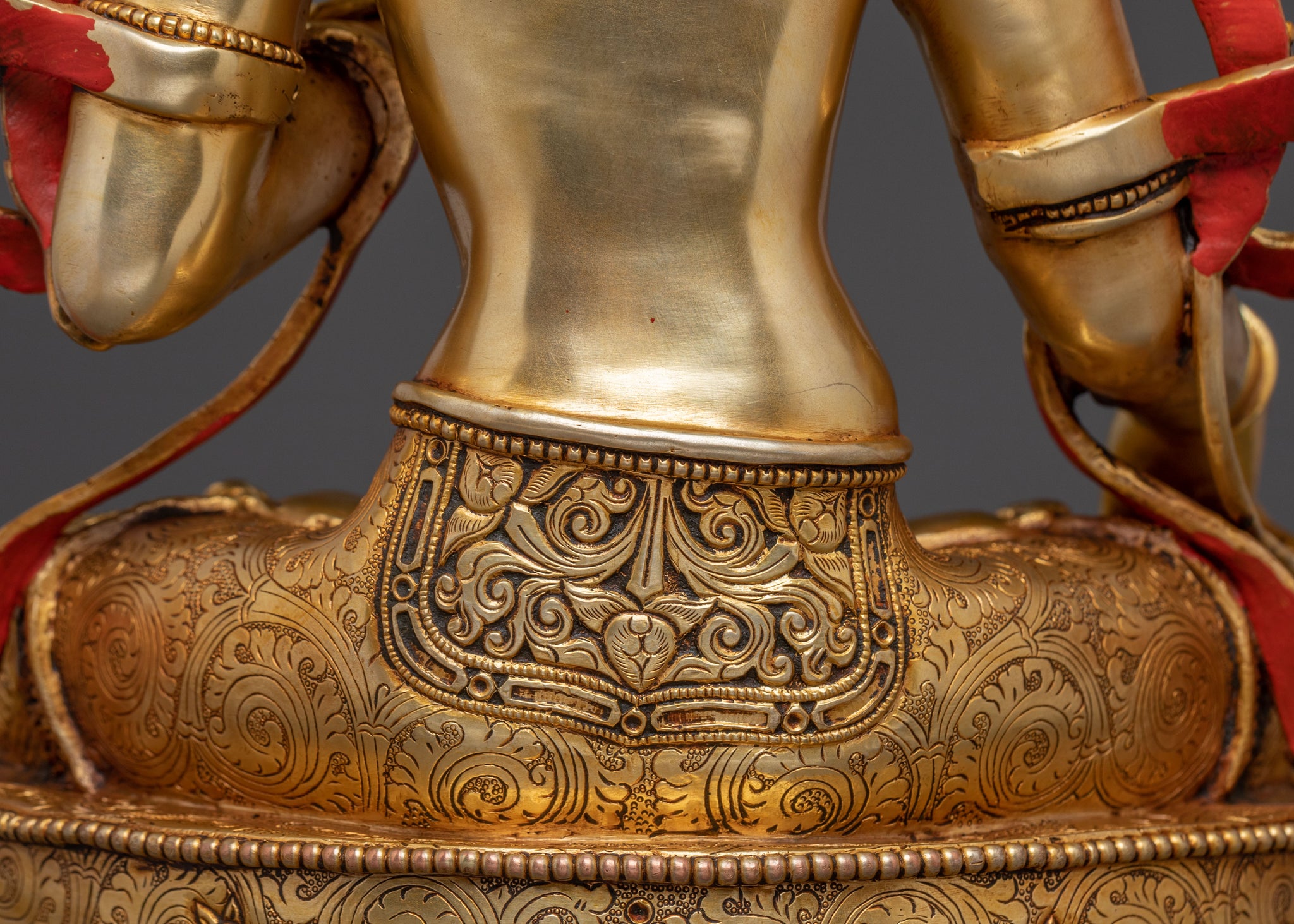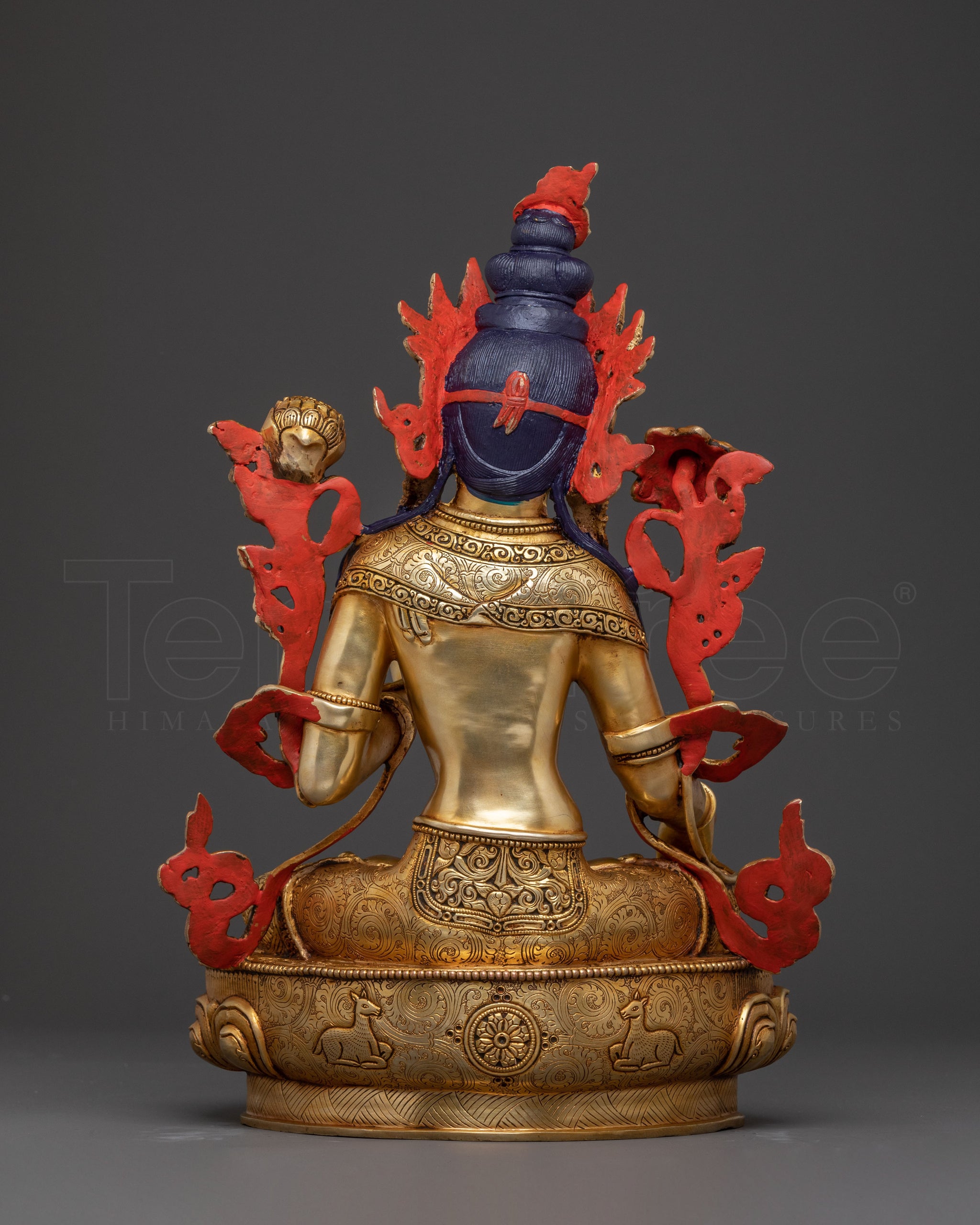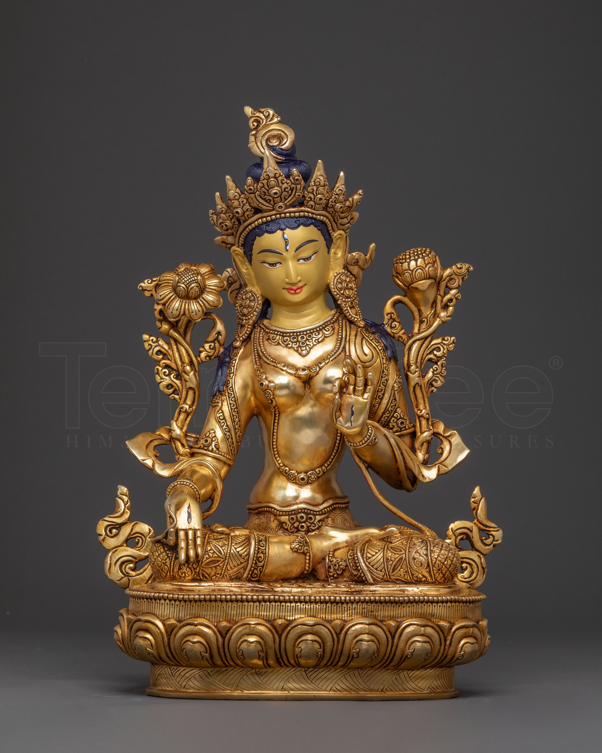 The Handcrafted White Tara Golden Statue stands 37 cm tall with a 25.5 cm base and weighs 6.73 kg. Made with 24K gold gilding, acrylic paints, and a copper body, this statue is skillfully crafted in Nepal, showcasing the country's rich artistic and religious traditions.