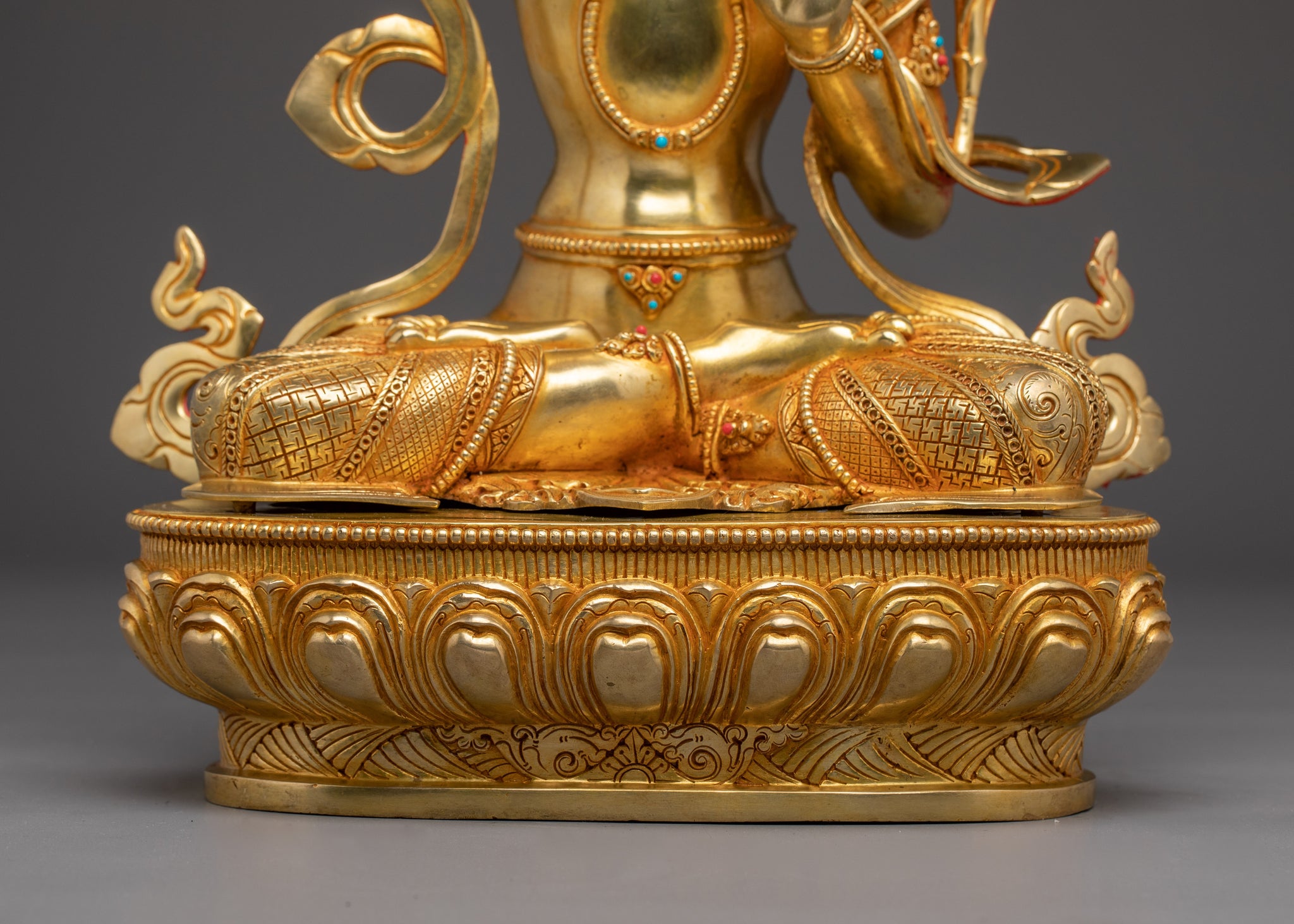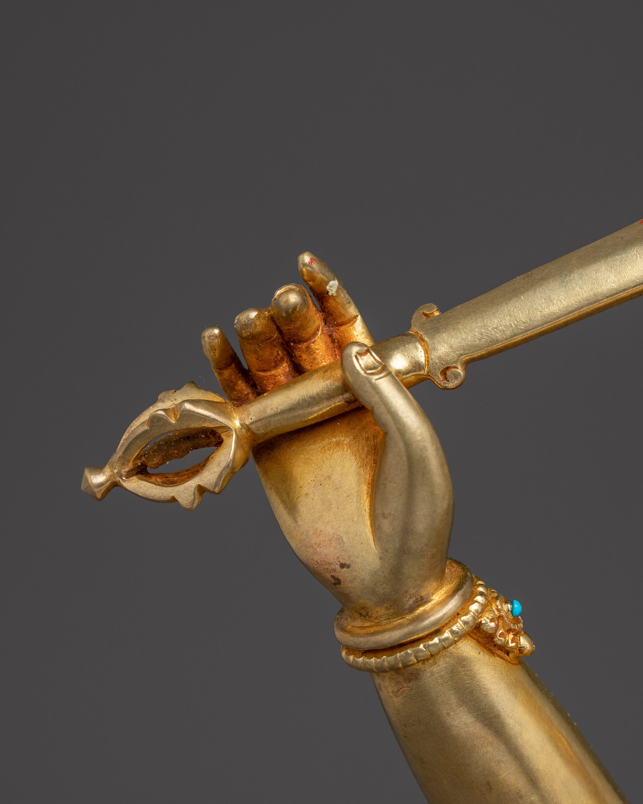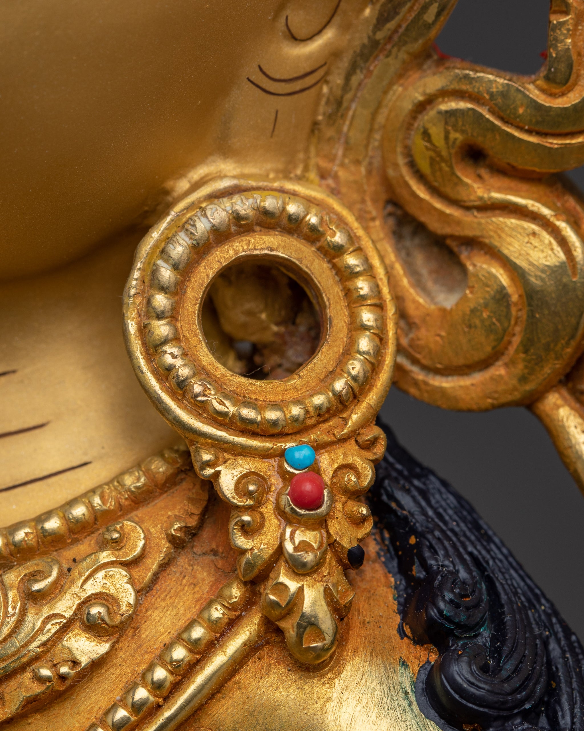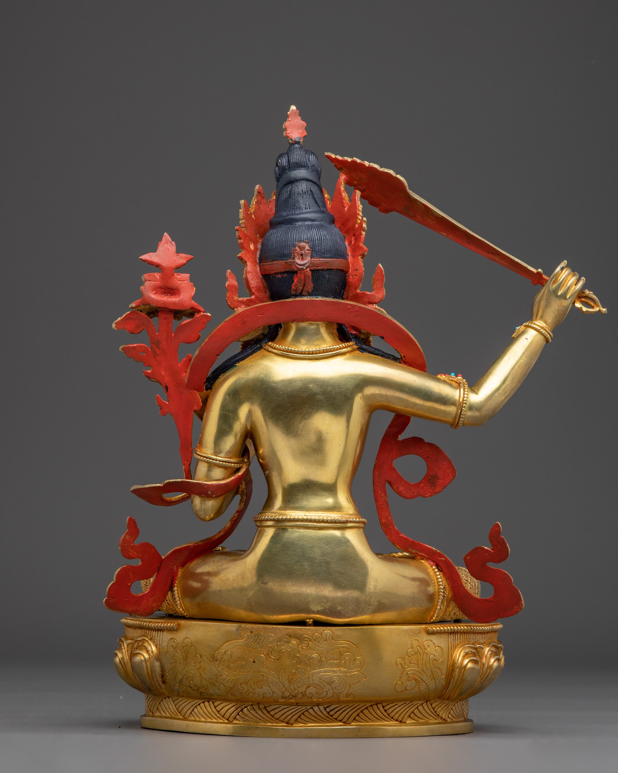 The Wisdom Deity Manjushri Art measures 15.2 inches (38.5cm) in height and 11.4 inches (29cm) at the base. The Bodhisattva of Wisdom is crafted from a copper body adorned with 24K gold gilding, enhancing its spiritual and visual appeal. The fine details are accentuated with intricate gold and acrylic paintings, while gemstones are thoughtfully placed to add depth and vibrancy. Crafted by expert artisans, this item symbolizes the rich traditions of Himalayan Buddhism, making it an important addition to altars, meditation places, or holy collections.