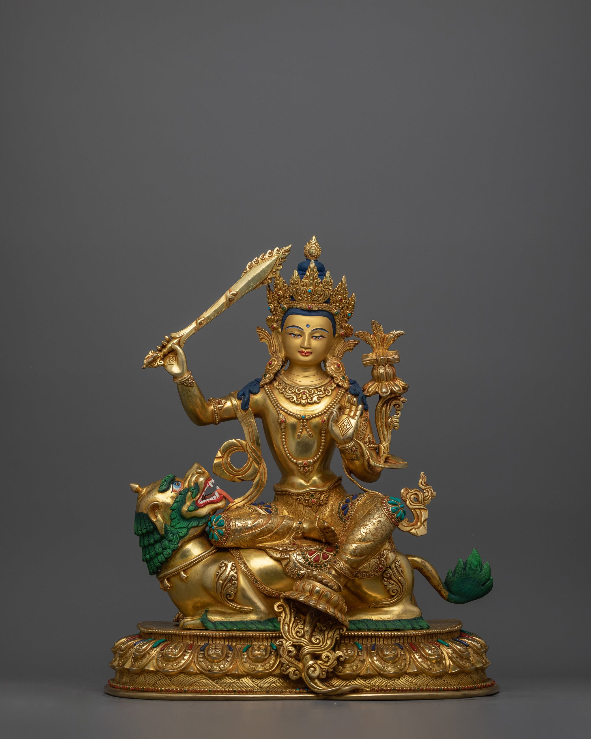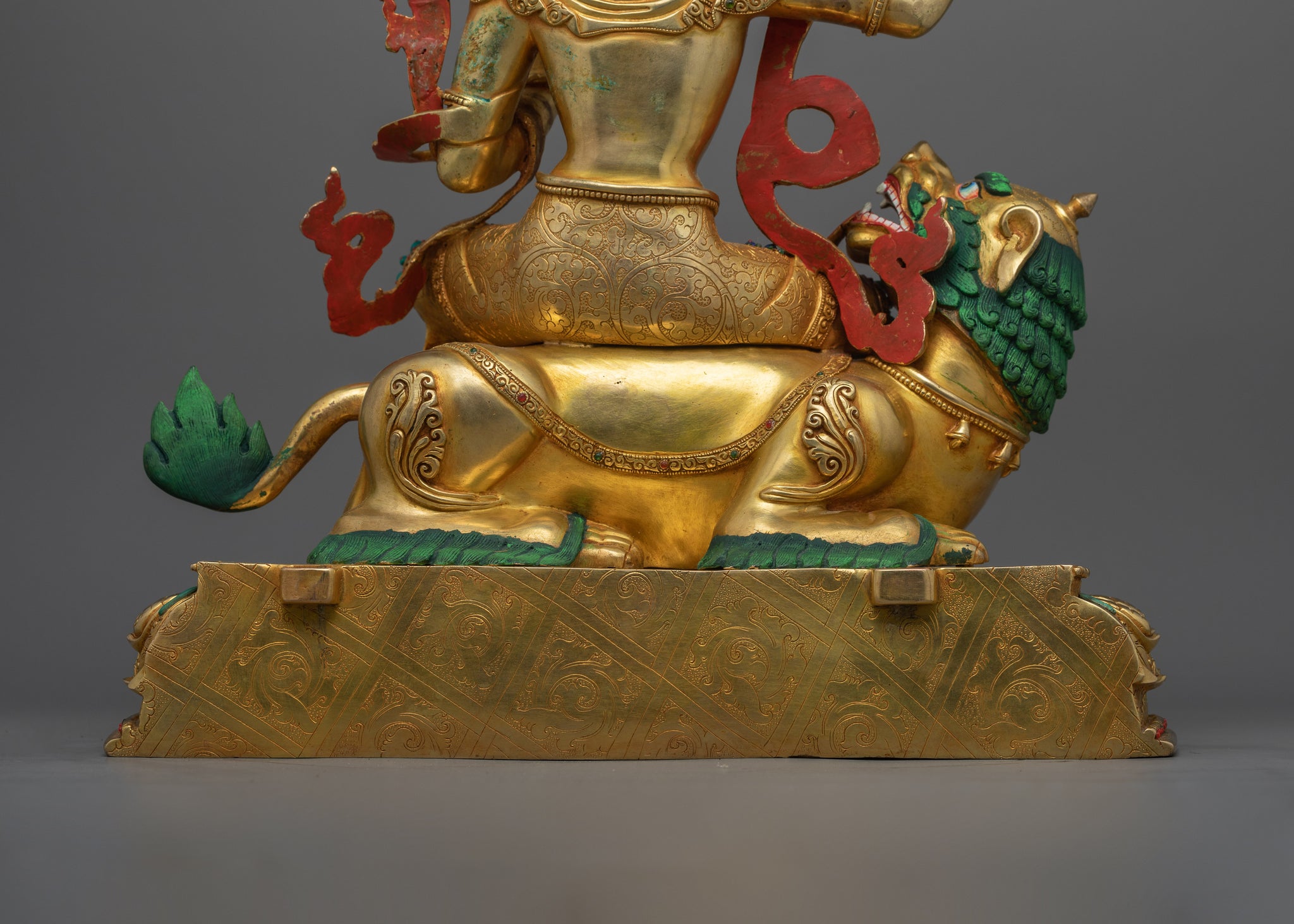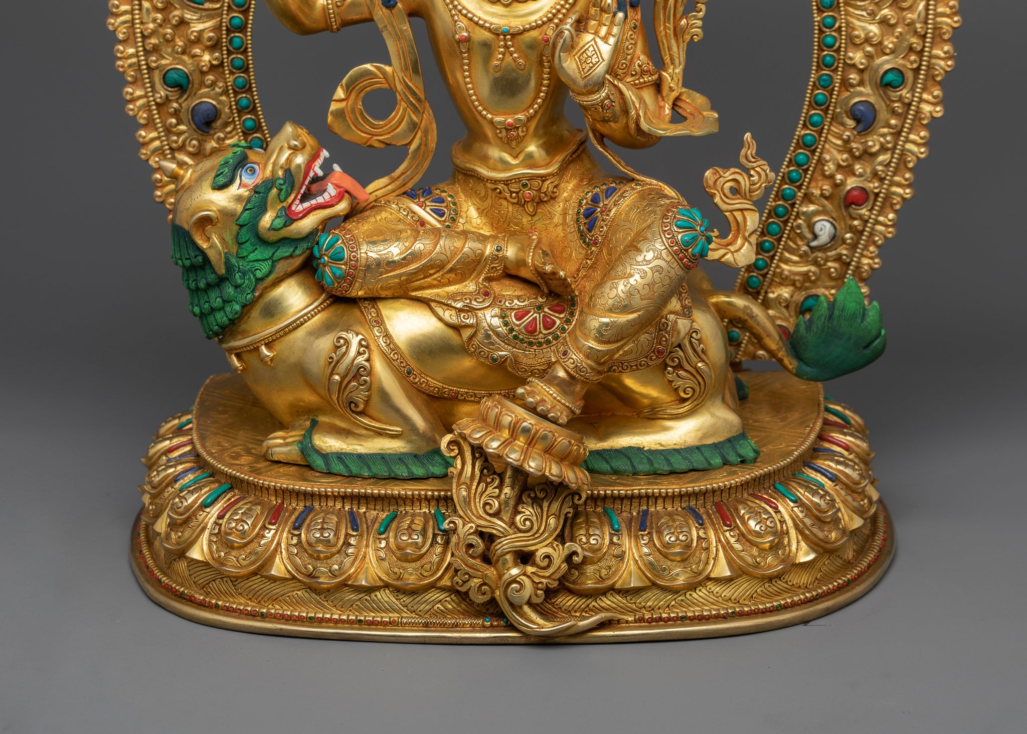 Wisdom Deity Simhanada Manjushri Statue on a Lion | Handmade in Nepal