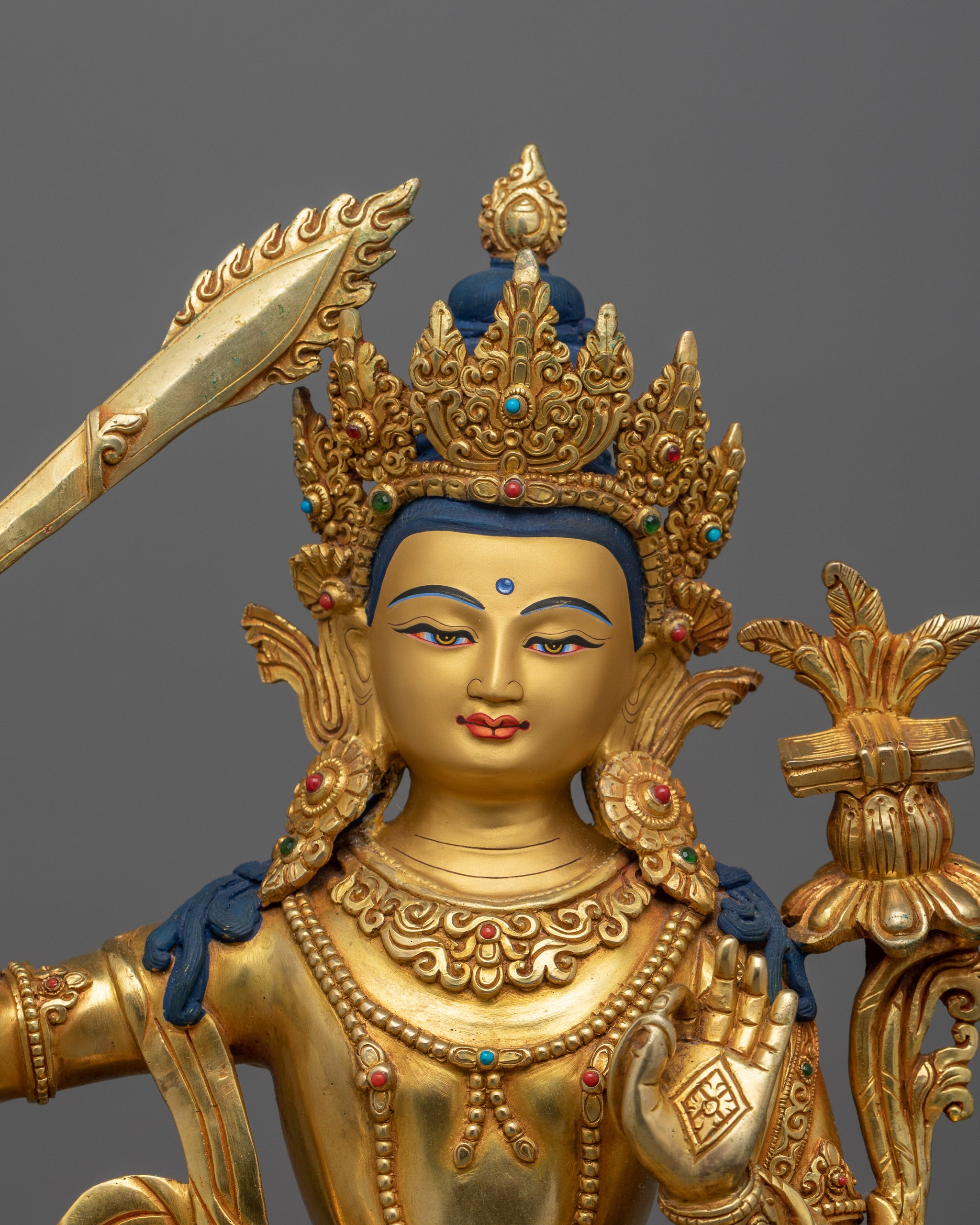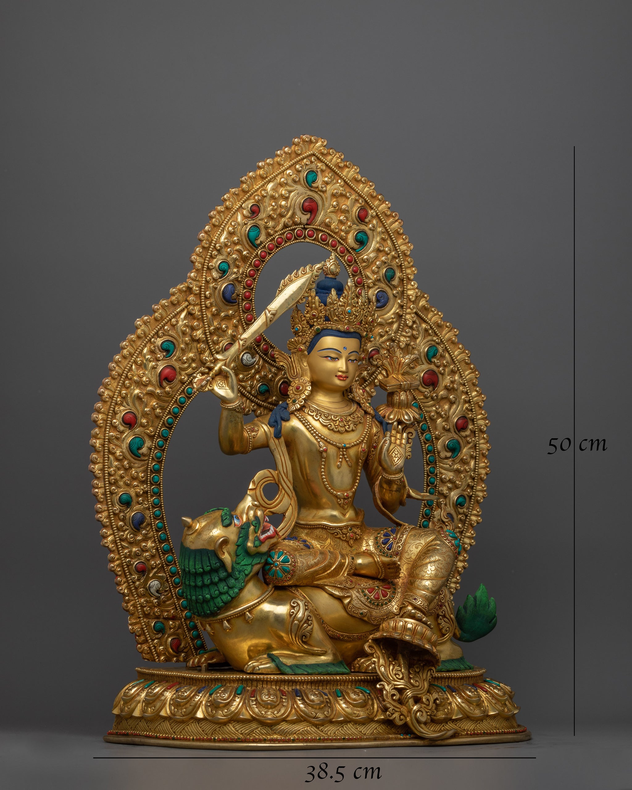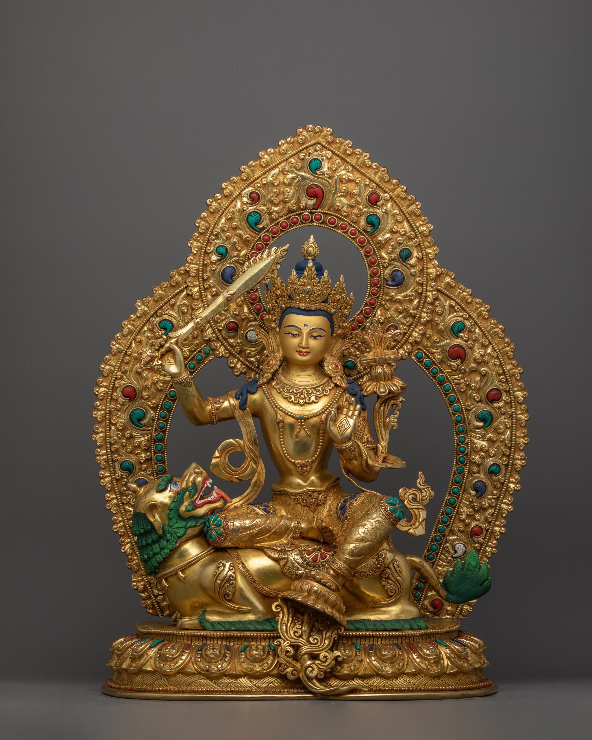 Wisdom Deity Simhanada Manjushri Statue on a Lion | Handmade in Nepal