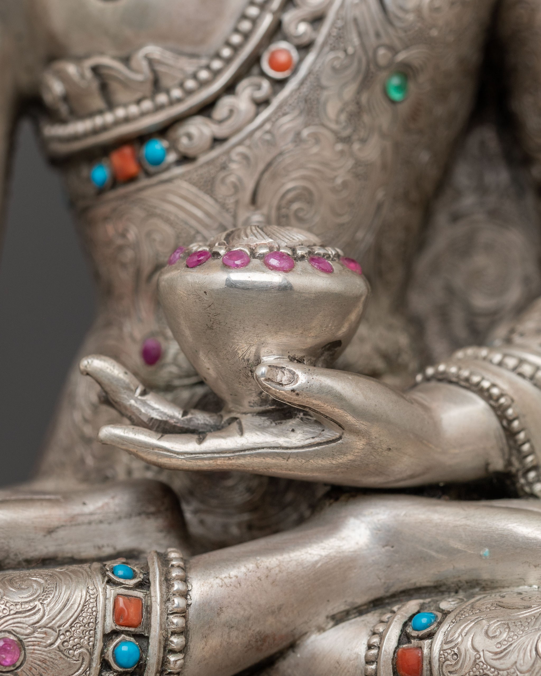 Originating from the revered artisans of Nepal, this exquisite statue is meticulously crafted upon a solid copper body. The form is then skillfully adorned with a rich casing of 92.5 Silver, applied with precision through traditional repoussé and chasing techniques. Delicate engraving highlights the intricate robes and features, while carefully set gemstones add a subtle, sacred luminescence, showcasing an extraordinary level of Himalayan craftsmanship and devotional artistry.