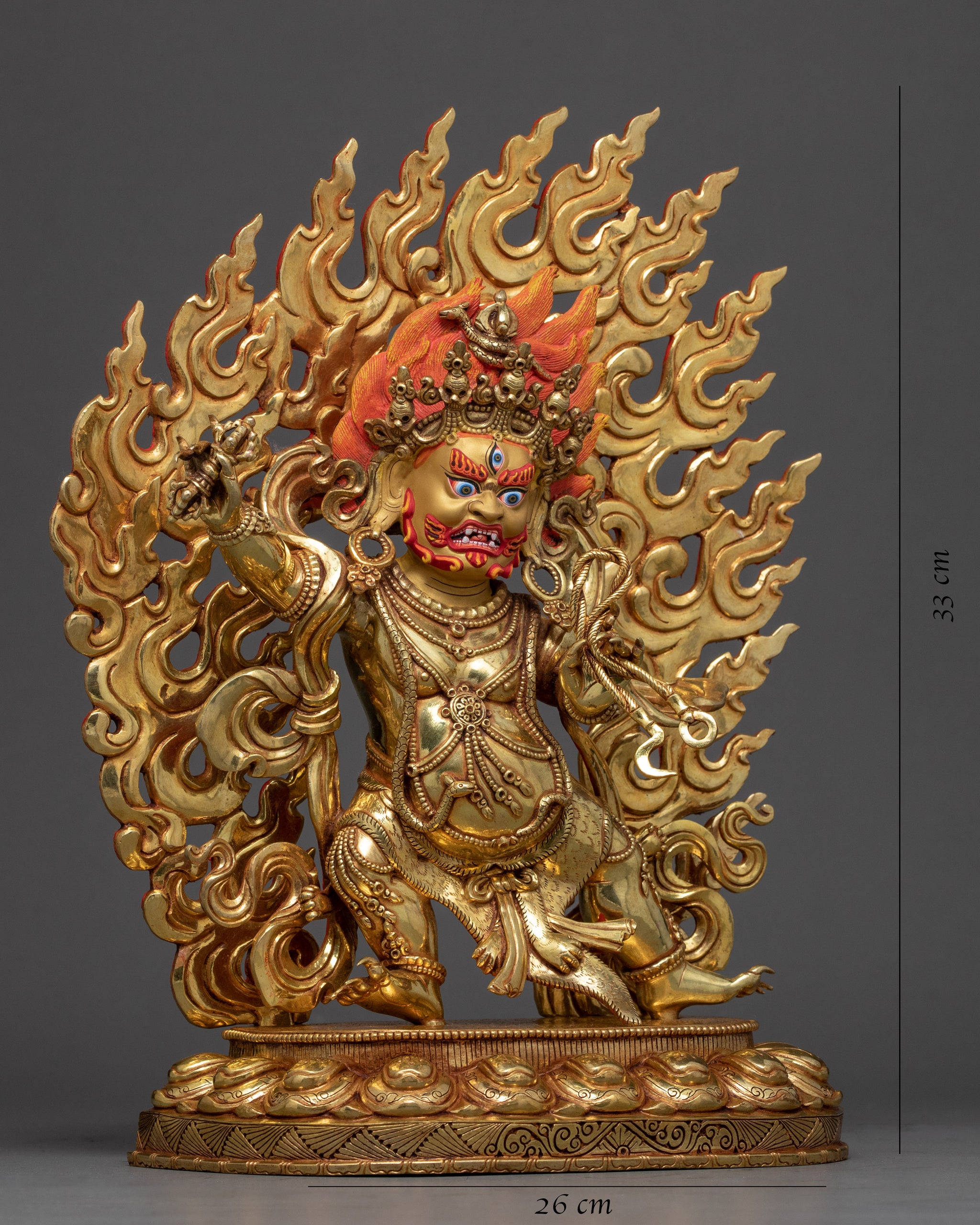 With the skillset and technique, inherited from centuries, we have beautifully crafted the sculpture Wrathful Vajrapani in our studio. The deity is depicted expressing wrathful expression, dancing fiercely within the halo flames. His left hand is holding a lasso, and his right hand is holding a Vajra (thunderbolt). The body is molded using copper. We have hand-craved beautiful design patterns on the statue which is then glided with pure 24K gold. We also used acrylic paintings on the statue. It took us months and months of hard work the completion the statue. You can use this statue for different Buddhist Rituals. It will be a perfect gift and addition to your shrine from Nepal.