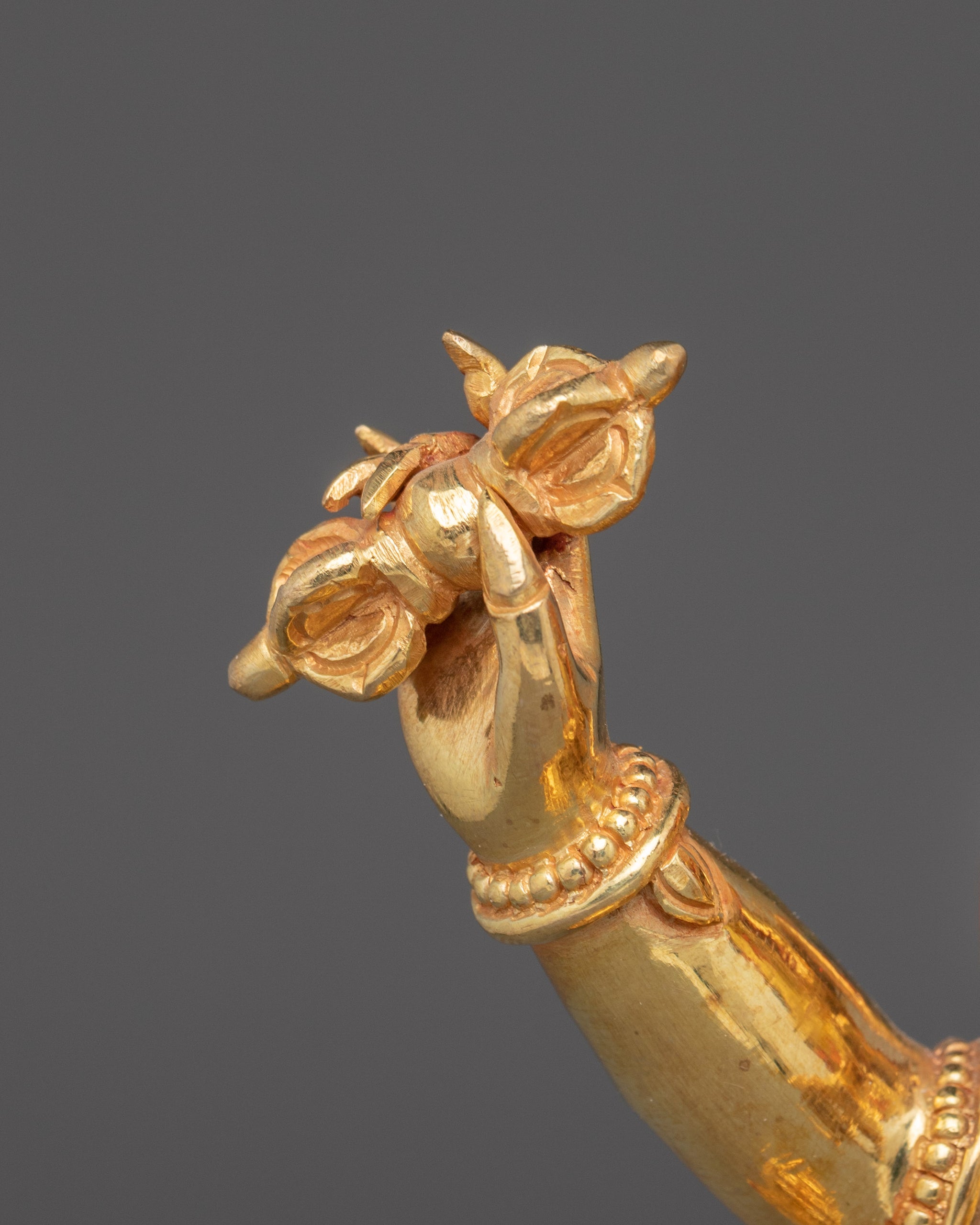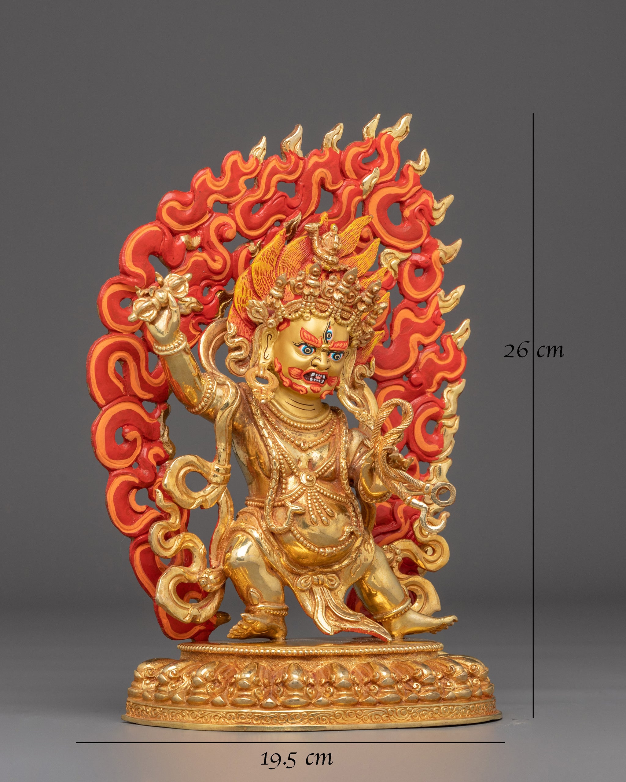 This 10.2 Inch Handmade Vajrapani Statue measures 10.2”/26cm in height and 7.7”/19.5cm in width, weighing 2.02kg. Expertly crafted from a copper body and adorned with 24K gold gilding and intricate gold and acrylic paintings, it reflects the skill and devotion of Nepali artisans, making it a powerful addition to altars, meditation spaces, or spiritual collections.