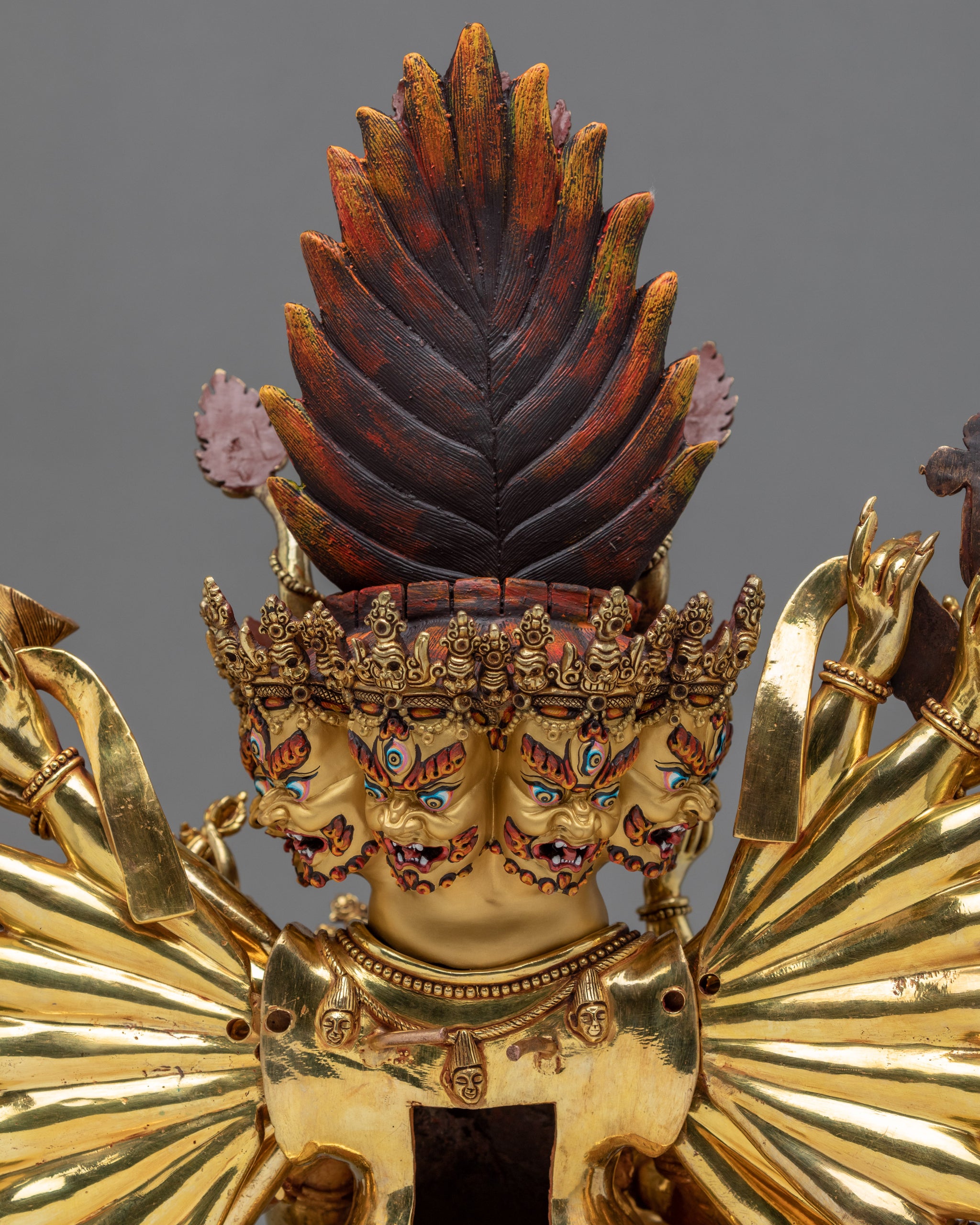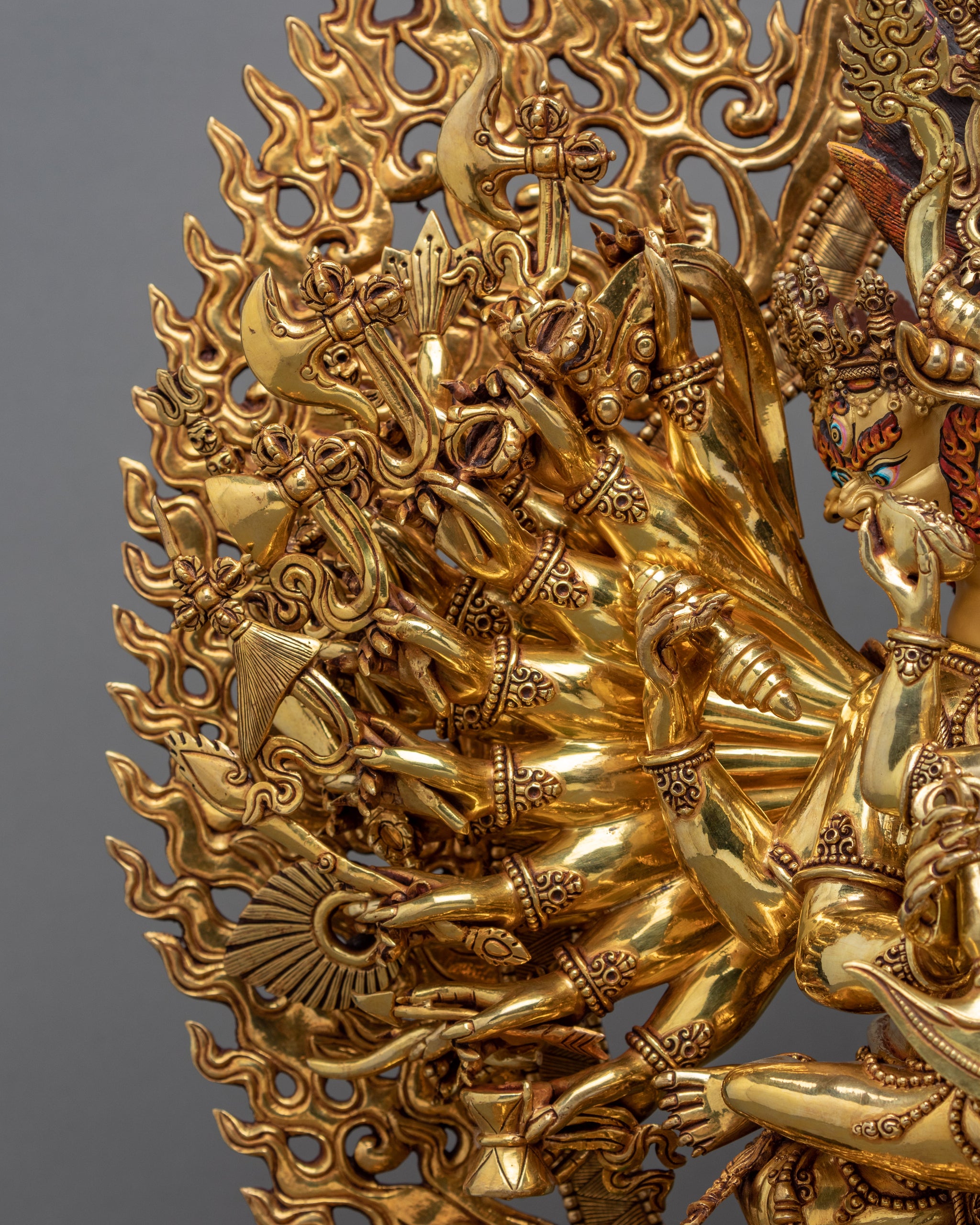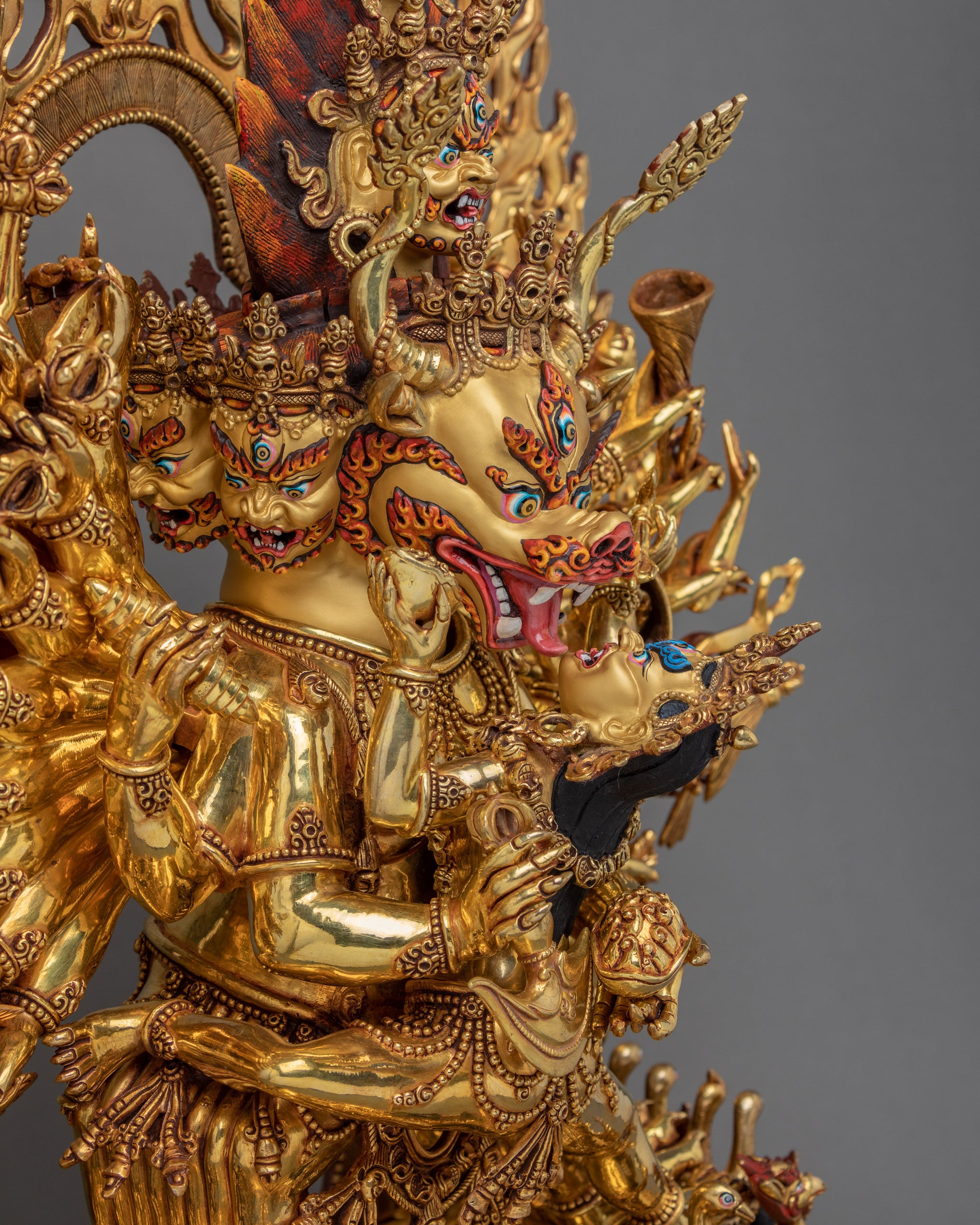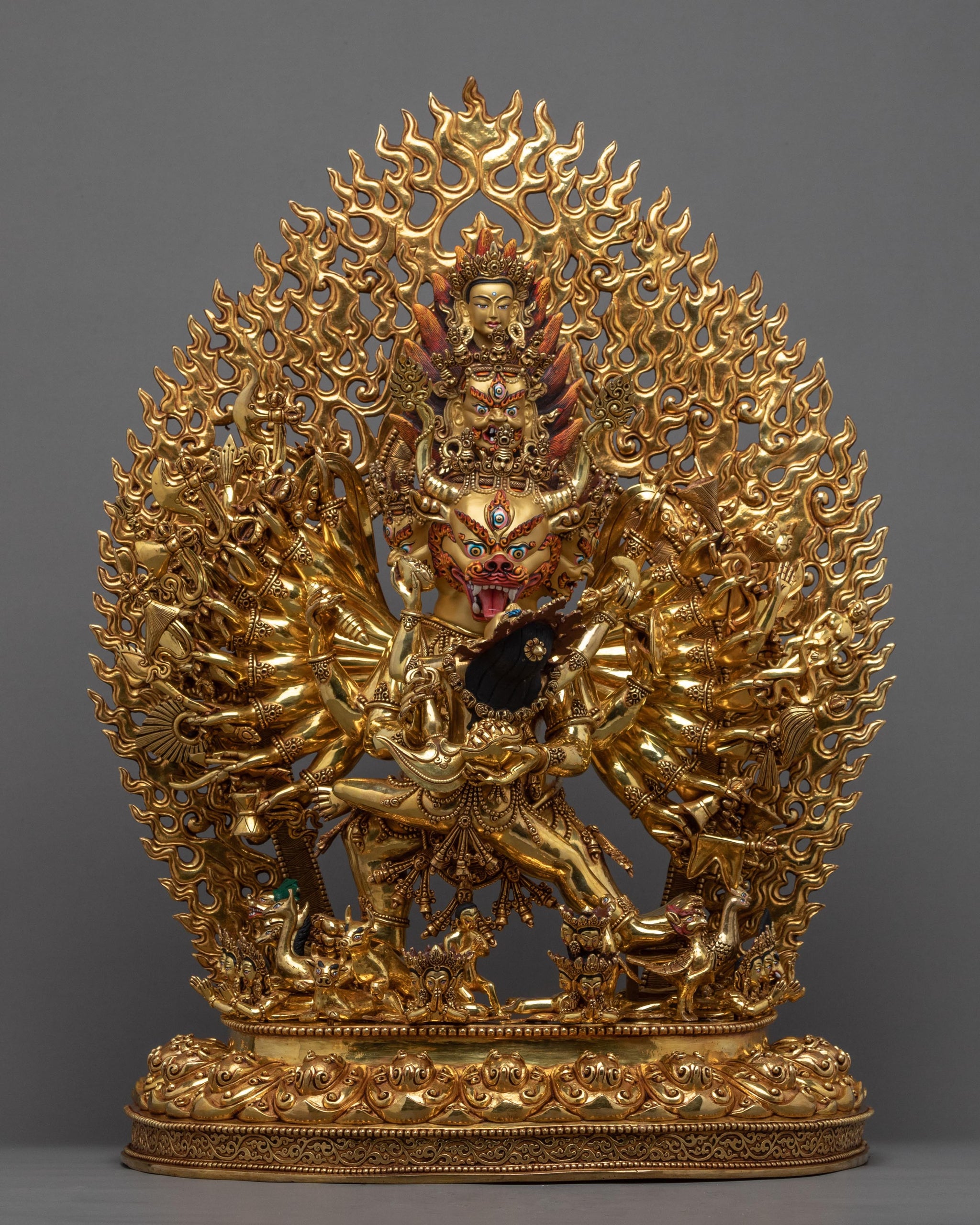 This statue took us about 22 months to complete with the precise attributes and mudras. Upon closer look, you will see that even the tiny details are gracefully finished to precision. His multiple hand gestures, the attriubutes they hold, the bodies underneath his feets, we have paid a detailed attention to each of them to make sure that this Yamantaka is made exactly as per the meditation Sadhana explains.
