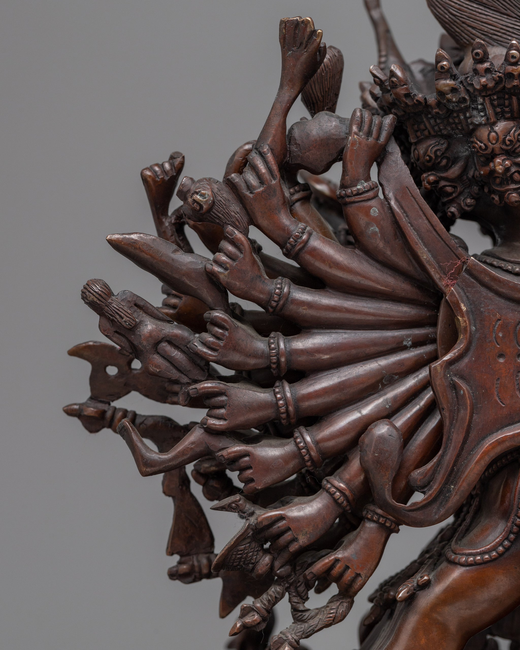 Yamantaka statue is shown in various ways, one of which is Yamataka Ekavira, which means "lone hero." He has a bull's or buffalo's head with long horns as the center head, among many other features. There are eight primary heads in all, with the Bodhisattva Manjushri's little crowned head at the pinnacle. Yamantaka, dressed in an elephant-skin robe, a garland of freshly cut human skulls, snakes, and interwoven bone ornament bracelets, necklaces, and a girdle. Except for his adornments, he is naked. A flaming halo is behind him, and his erect phallus has a crimson tip. He wields a chopping knife (Kartika) in his primary hands, symbolizing his power to sever the root of illusion.