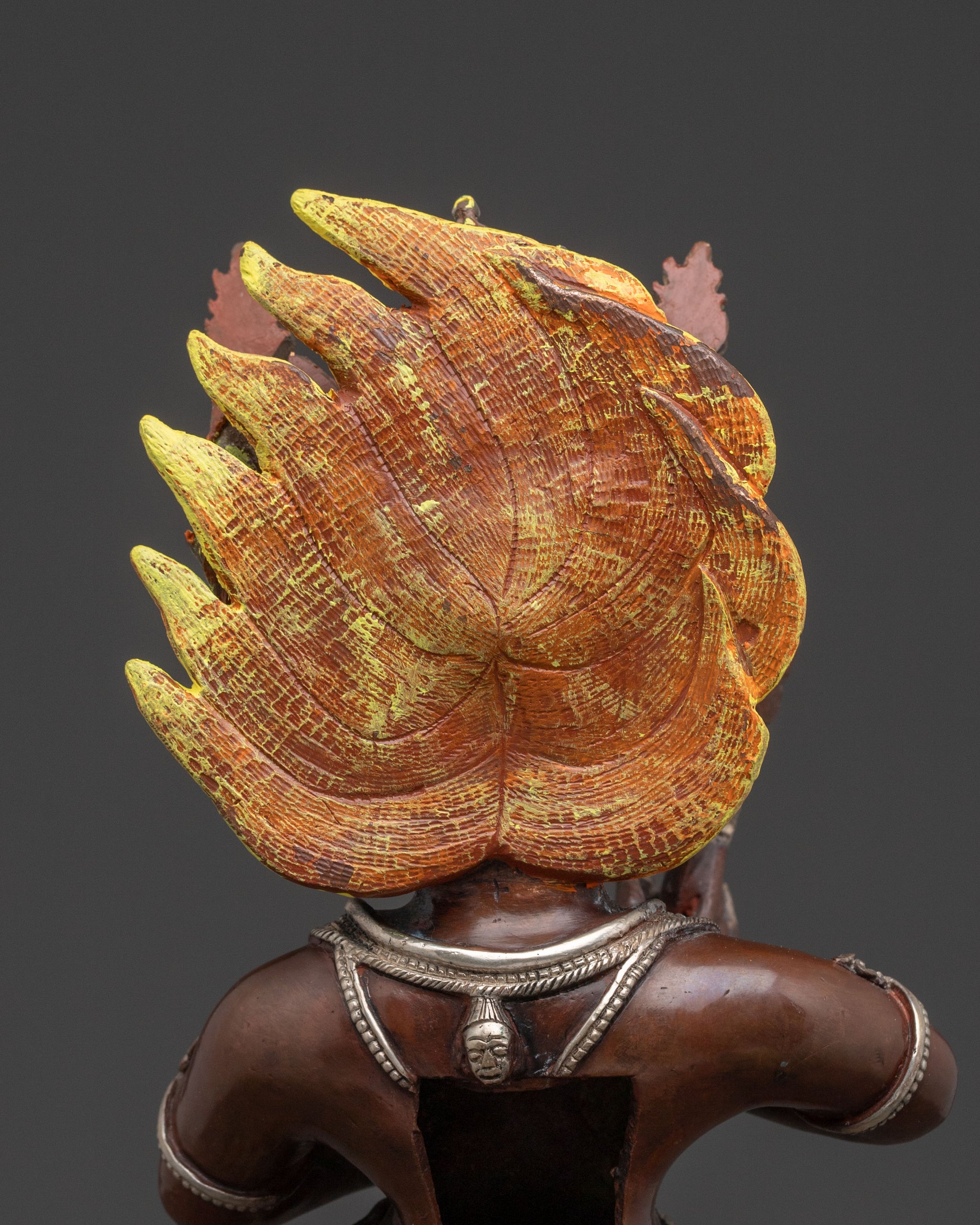 A powerful Yamantaka sacred copper statue rises, radiating an intense, awe-inspiring presence. Standing 40 cm tall (15.75”) on a 23 cm (9.06”) base, this meticulously crafted figure showcases the wrathful yet compassionate form of the Dharma Protector. Fashioned from an oxidized copper body with strategic silver plating and detailed acrylic paintings, it emanates a profound spiritual energy, ready to guard and guide. Handcrafted in Nepal, this statue is a testament to both craftsmanship and devotion.
