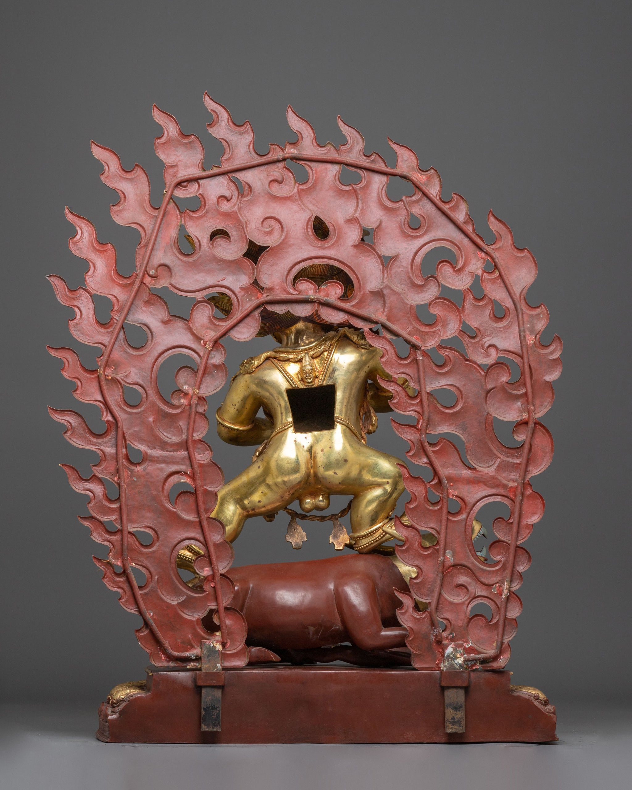 Vajrayogini is stunning. The details are amazing. It's easy to make out her facial expressions, skulls, feet, and the ring of fire around her. You can tell she's handmade. There is a consecration hole in her back.