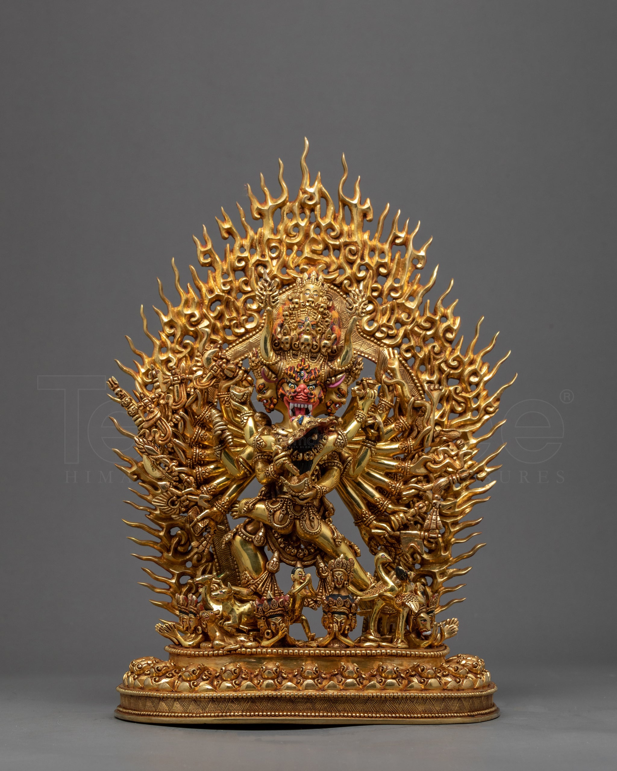 Yamantaka is one wrathful deity, popularly practiced by all schools of Tibetan Buddhism. The large size statue depicts his unique and equally interesting iconographic details. His center main head is in fact a buffalo head, expressing his utmost wrath with open fangs, blazing eye brows and mustache.