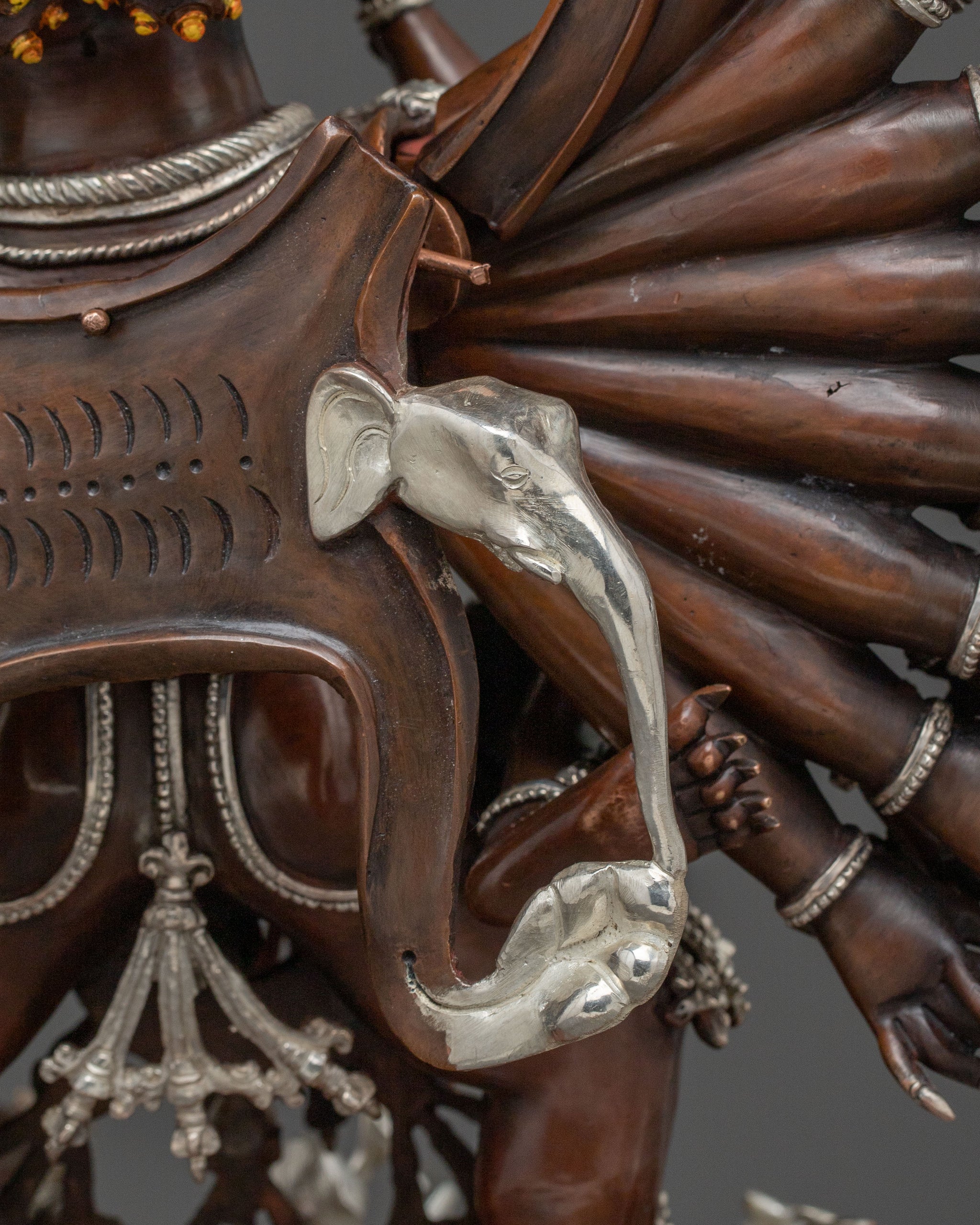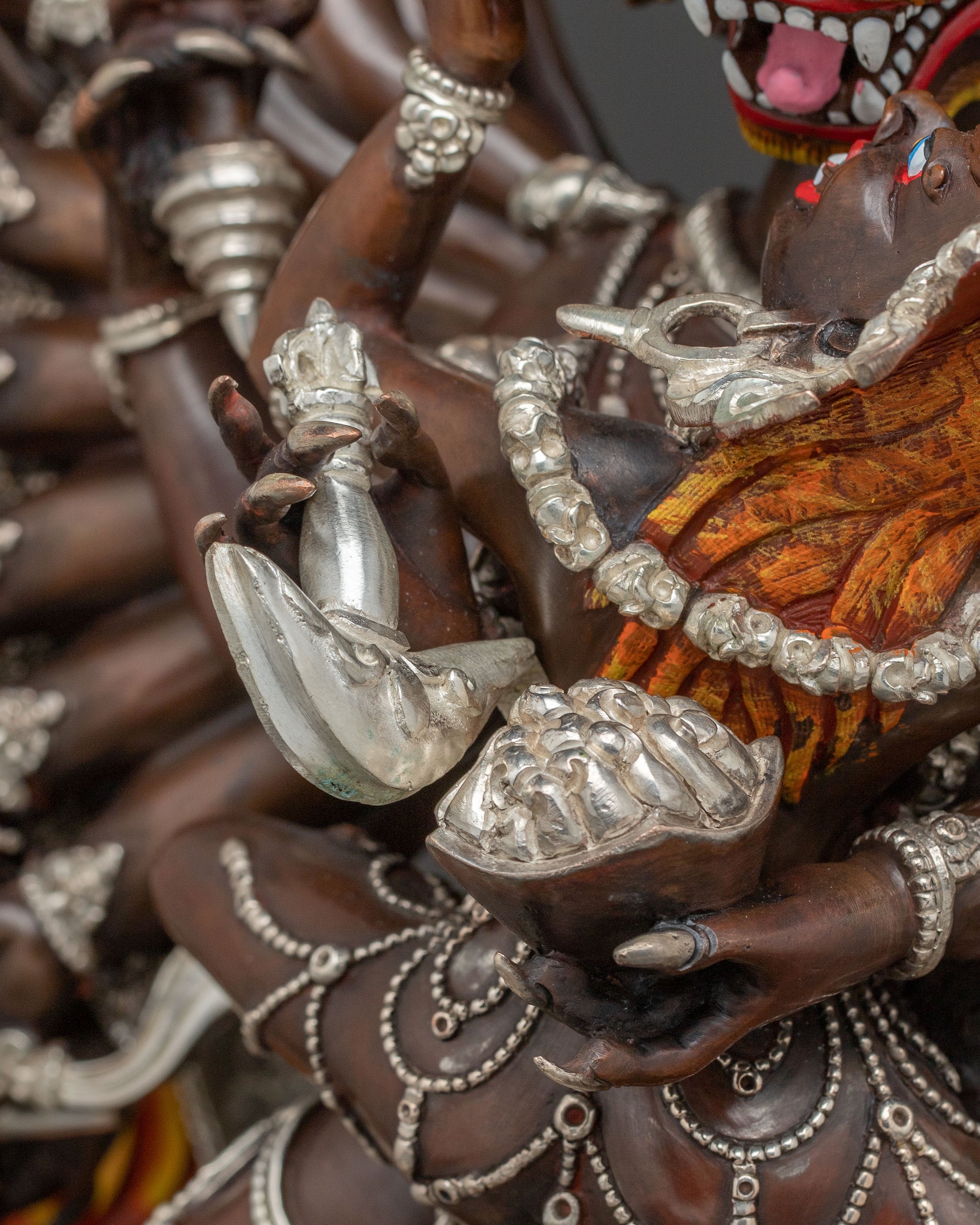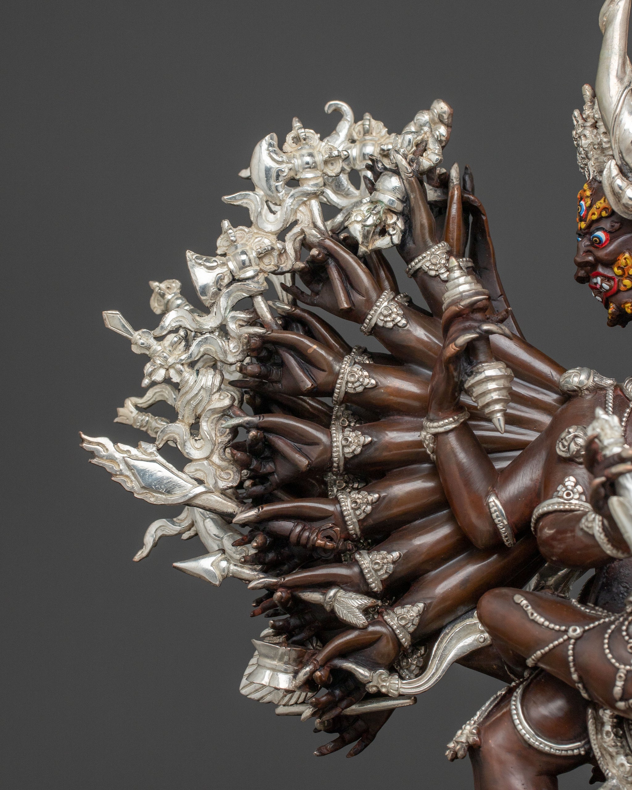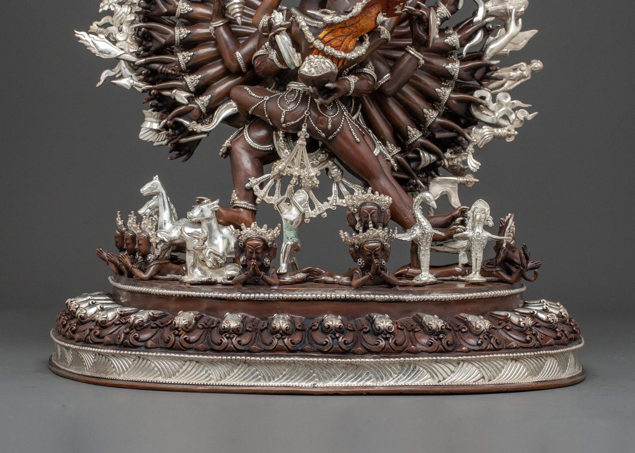 The Yamantaka Wrathful Statue manifests as a formidable guardian, standing at 23.23 inches (59 cm) tall and weighing 24.2 kg. This powerful Buddhist art piece features an oxidized copper body, beautifully contrasted with rich 24K gold gilded details. Enhanced with delicate acrylic paintings and shimmering silver electroplating, the statue radiates a potent aura of protection and transformative energy, embodying fierce compassion. Handcrafted in Nepal, this striking statue serves as a symbol of strength and spiritual power, making it a captivating focal point for any sacred space. The base measures 17.72 inches (45 cm), adding to its imposing presence.