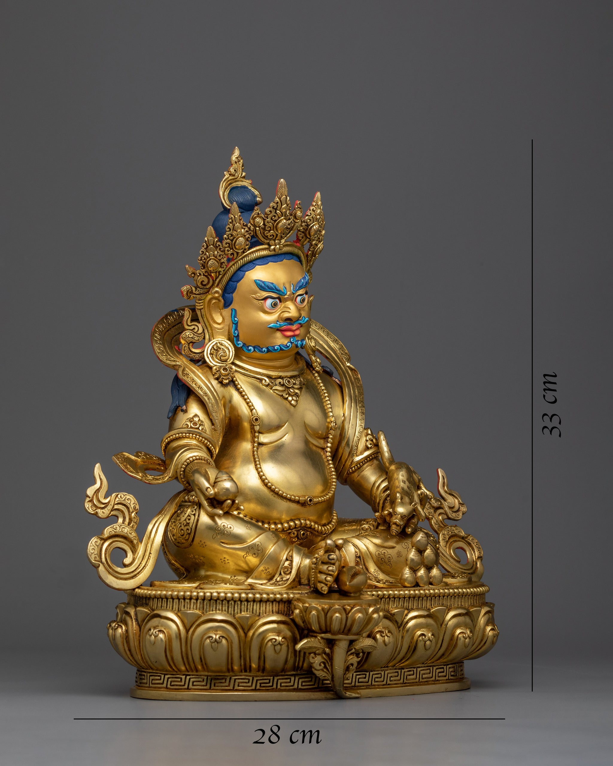 With our Yellow Dzambhala Practice statue, you can elevate your spiritual practice and attract riches into your life. Dzambhala, the deity of riches in Tibetan Buddhism, represents abundance in all of its manifestations. This statue, skillfully carved from a copper body and embellished with 24k gold gilding and acrylic paintings, becomes a gleaming emblem of riches and spiritual wealth.